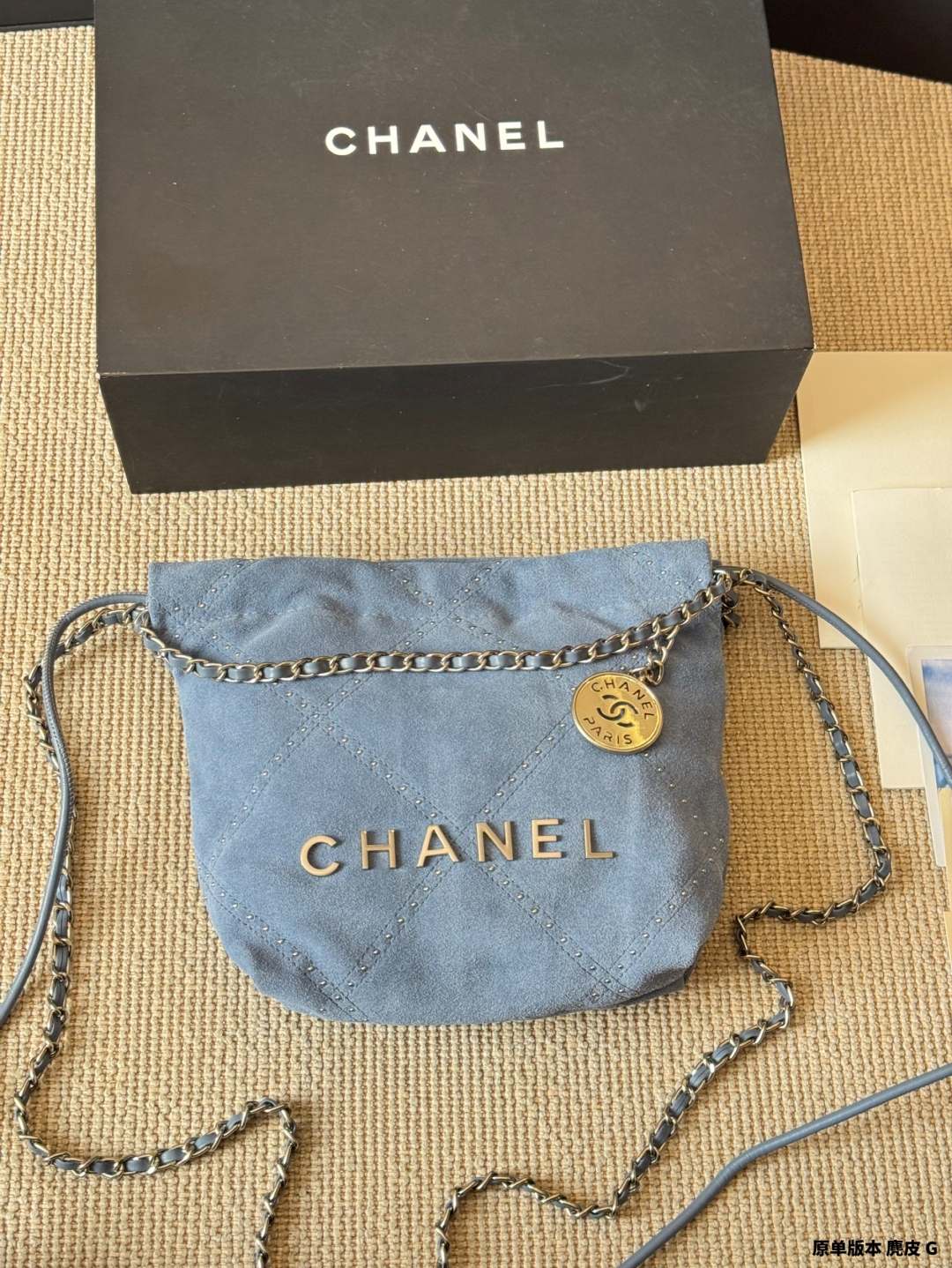 Elevate your style with the Chanel 22 Bag. Crafted from luxurious suede with unique rivets and black and silver hardware. Size: 17 x 20 cm.