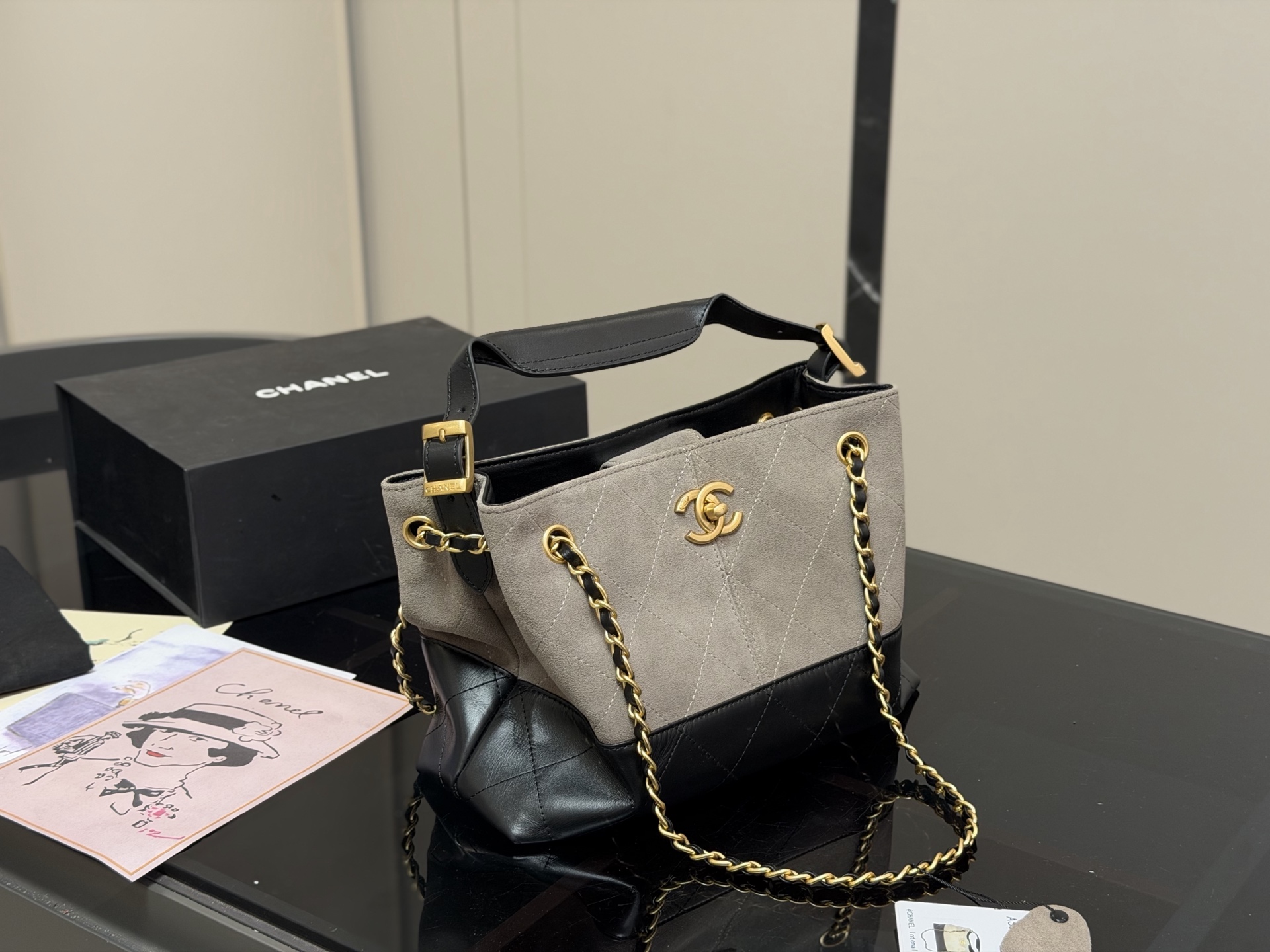 The Chanel 25A suede tote bag features a Mela color series, can be carried by hand or under the arm. Inspired by Chanel's ebony lacquer screen.
