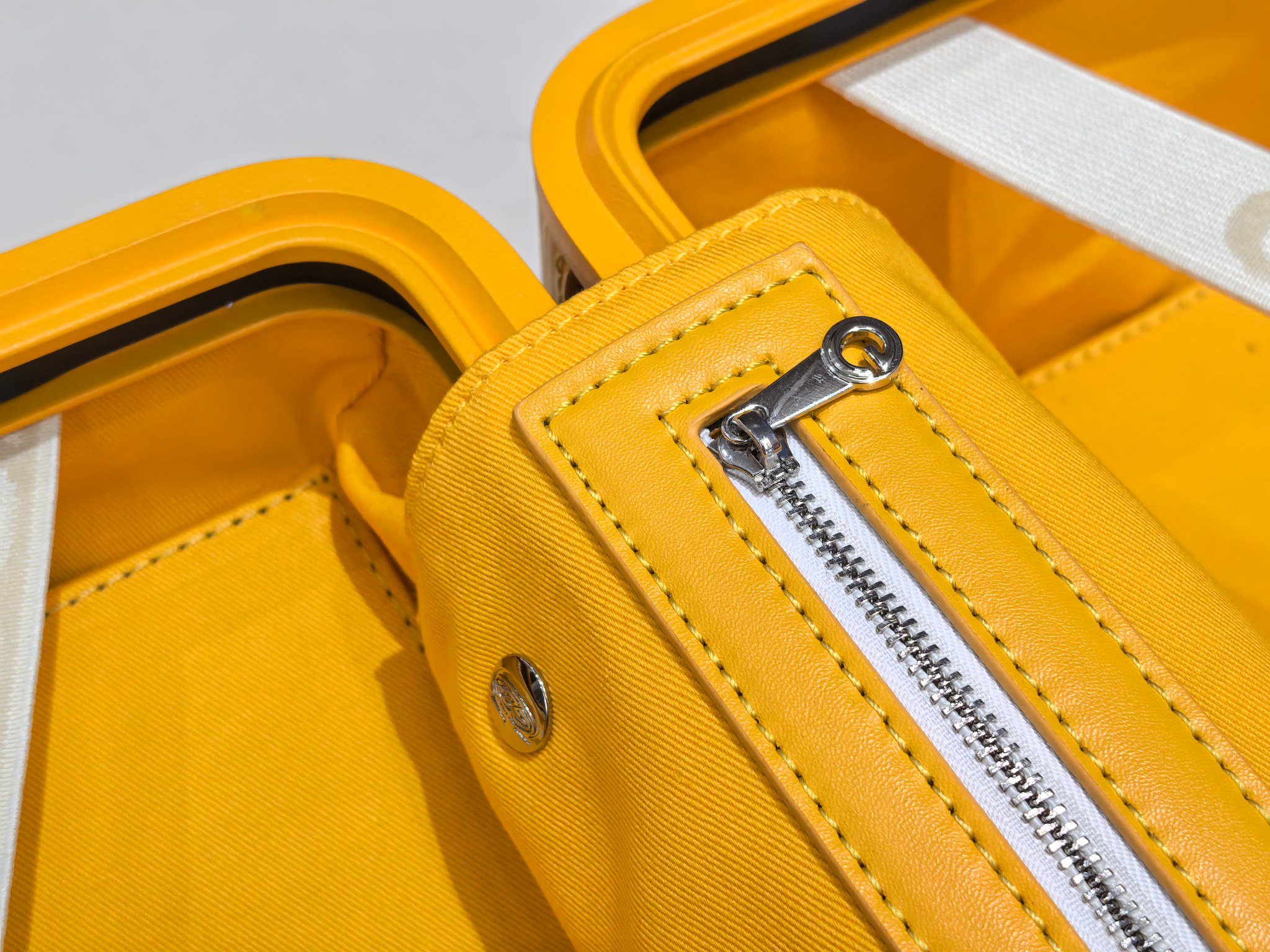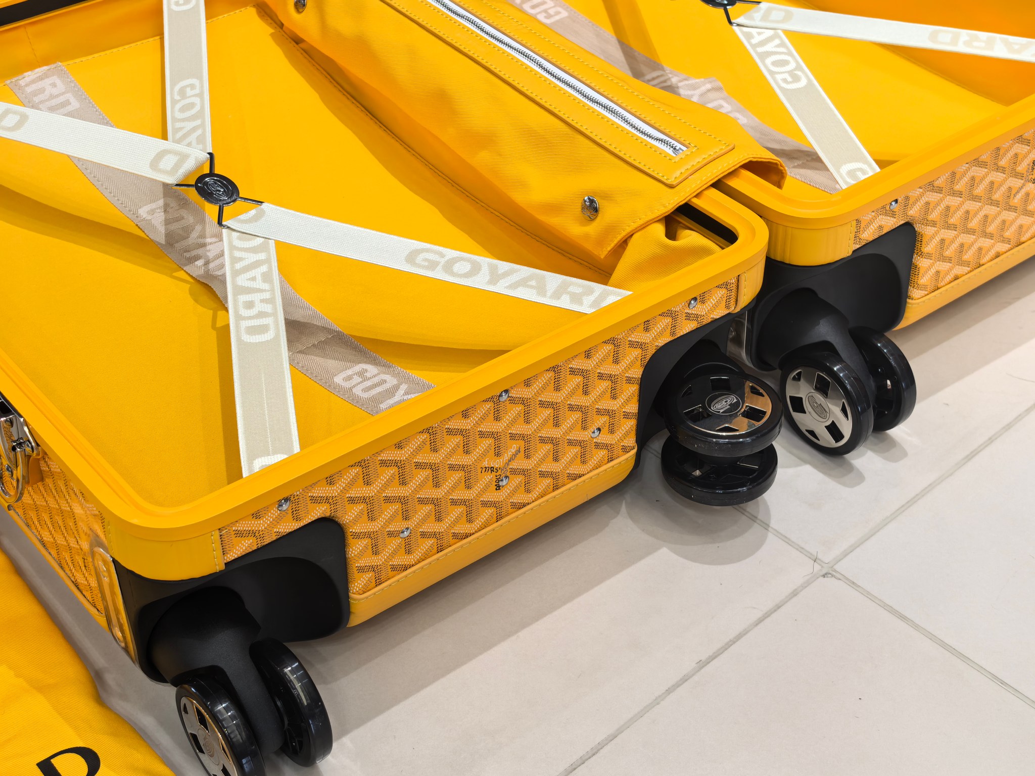 Crafted for the discerning traveler, this Goyard 20-inch cabin luggage is more than just a suitcase; it's a statement of elegance and sophistication. Each piece is meticulously handcrafted. The bright yellow color ensures you'll travel in style.
