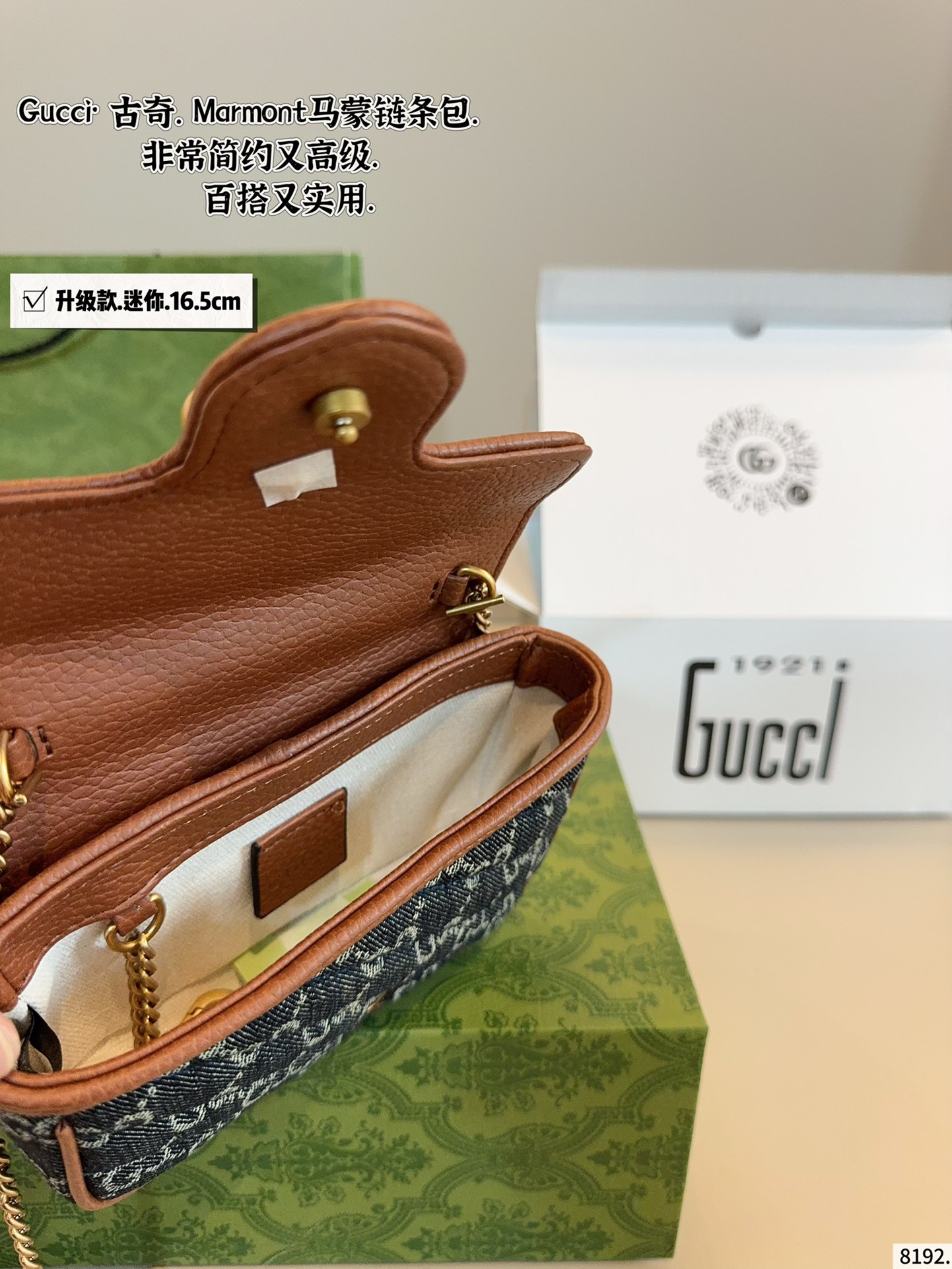 Elevate your style with this chic Gucci Marmont denim chain bag. Compact, stylish, and perfect for any occasion. Dimensions: 16*3*10cm.