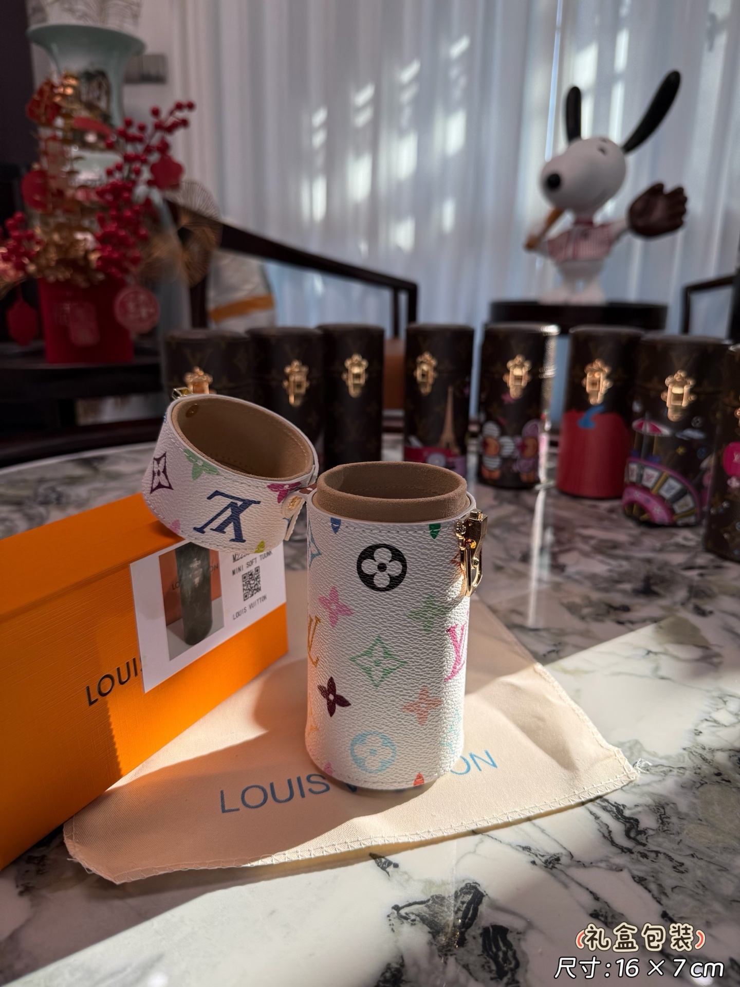 This elegant Louis Vuitton travel case is the perfect accessory, designed to hold your perfume or lipstick securely. Compact and stylish, it's a must-have for travel.