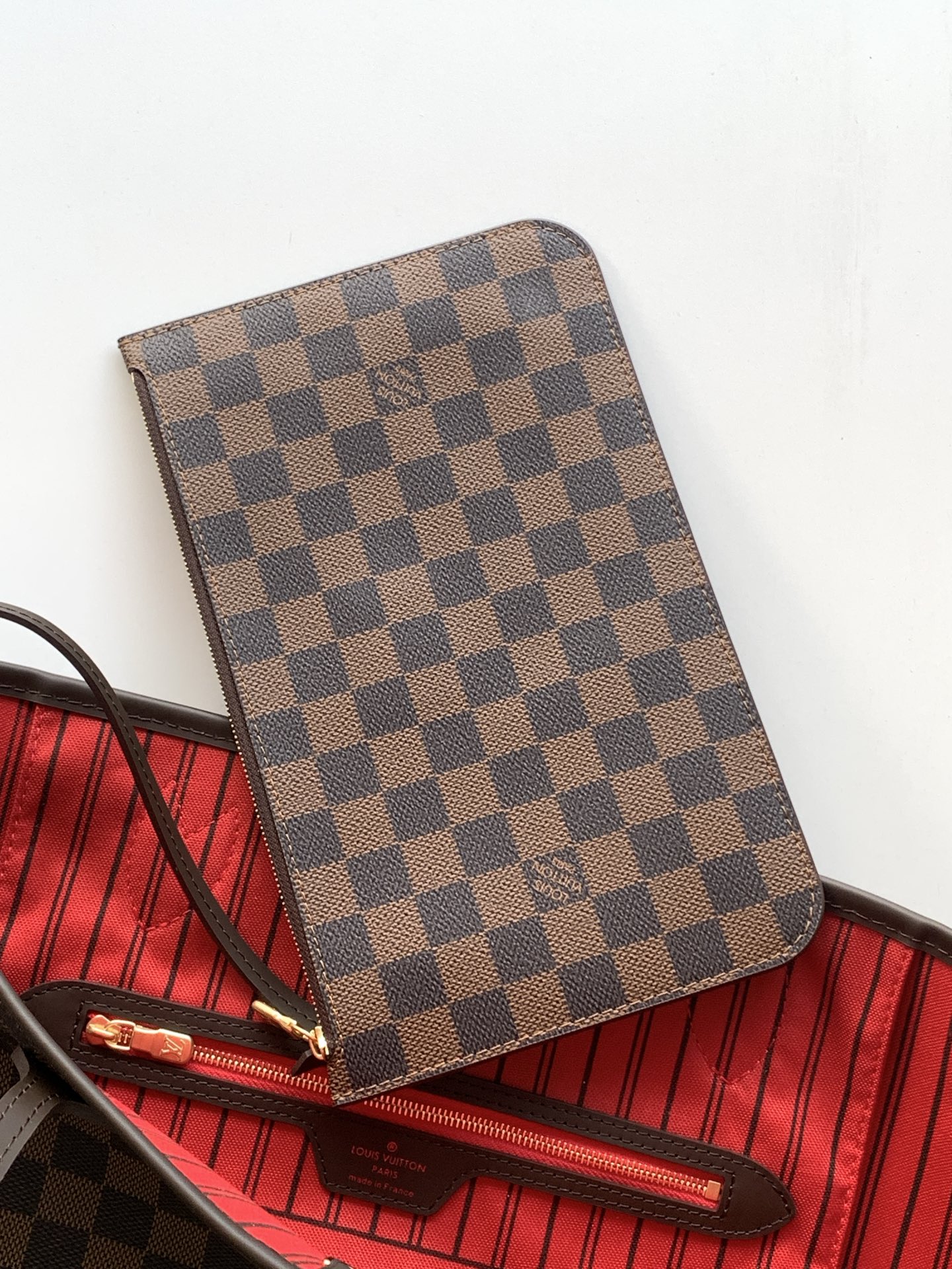 The Louis Vuitton Neverfull is crafted in Damier Ebene canvas with a red textile lining. Includes a removable zipped pouch. Dimensions: 32 x 29 x 17 cm.
