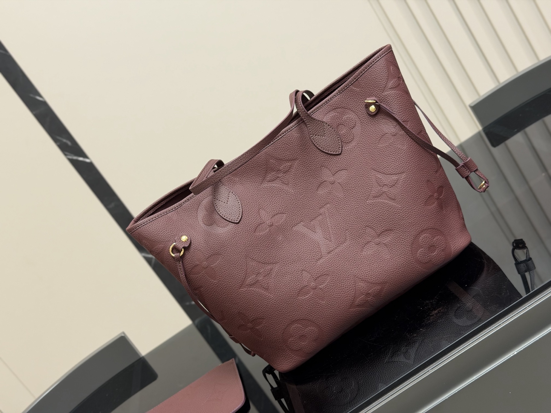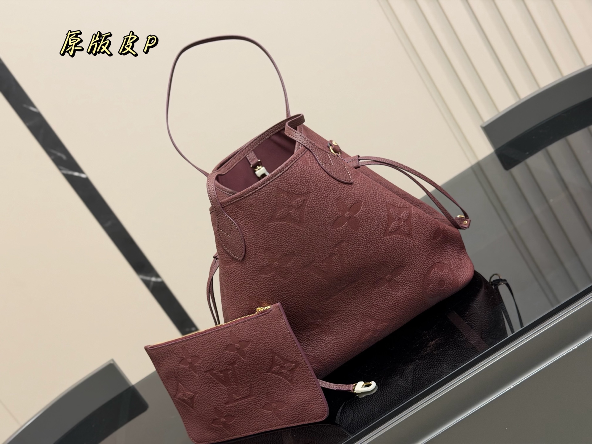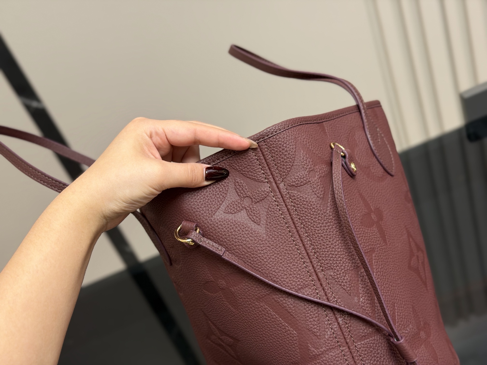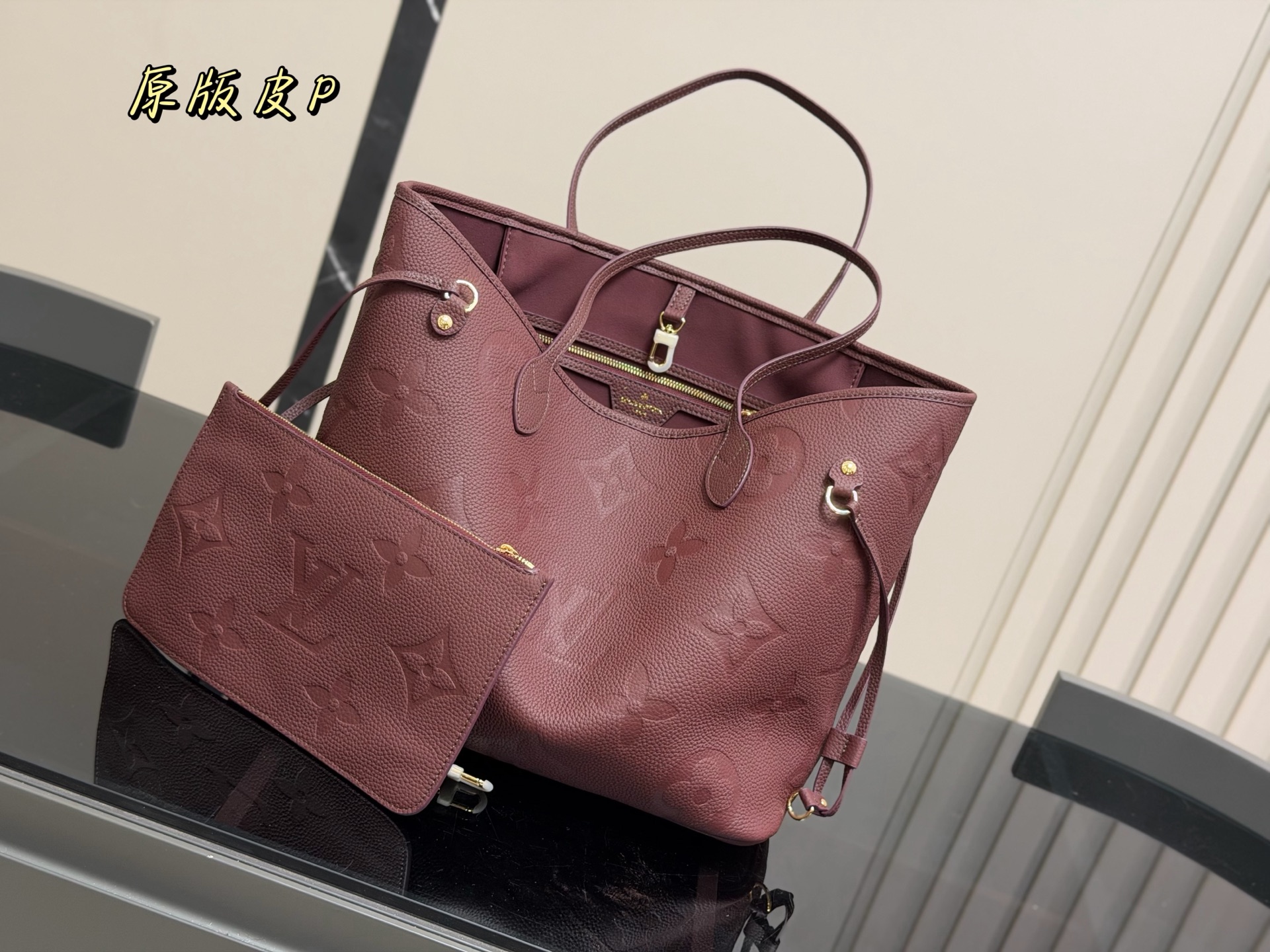 The Louis Vuitton Neverfull MM tote bag is crafted from burgundy leather and includes a matching removable pouch. Dimensions: 32 x 28 cm.