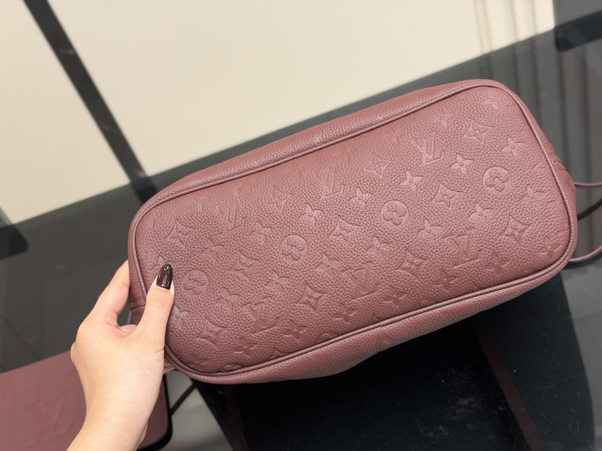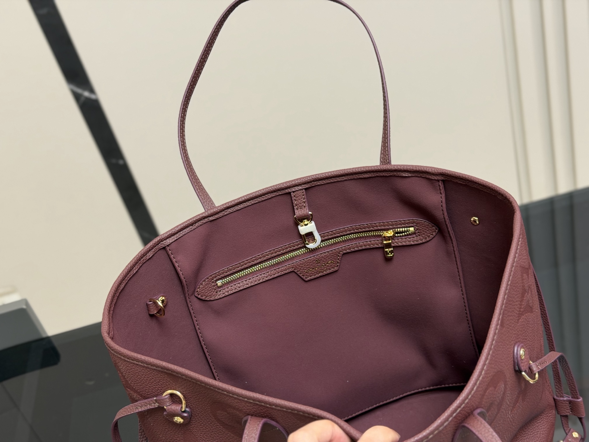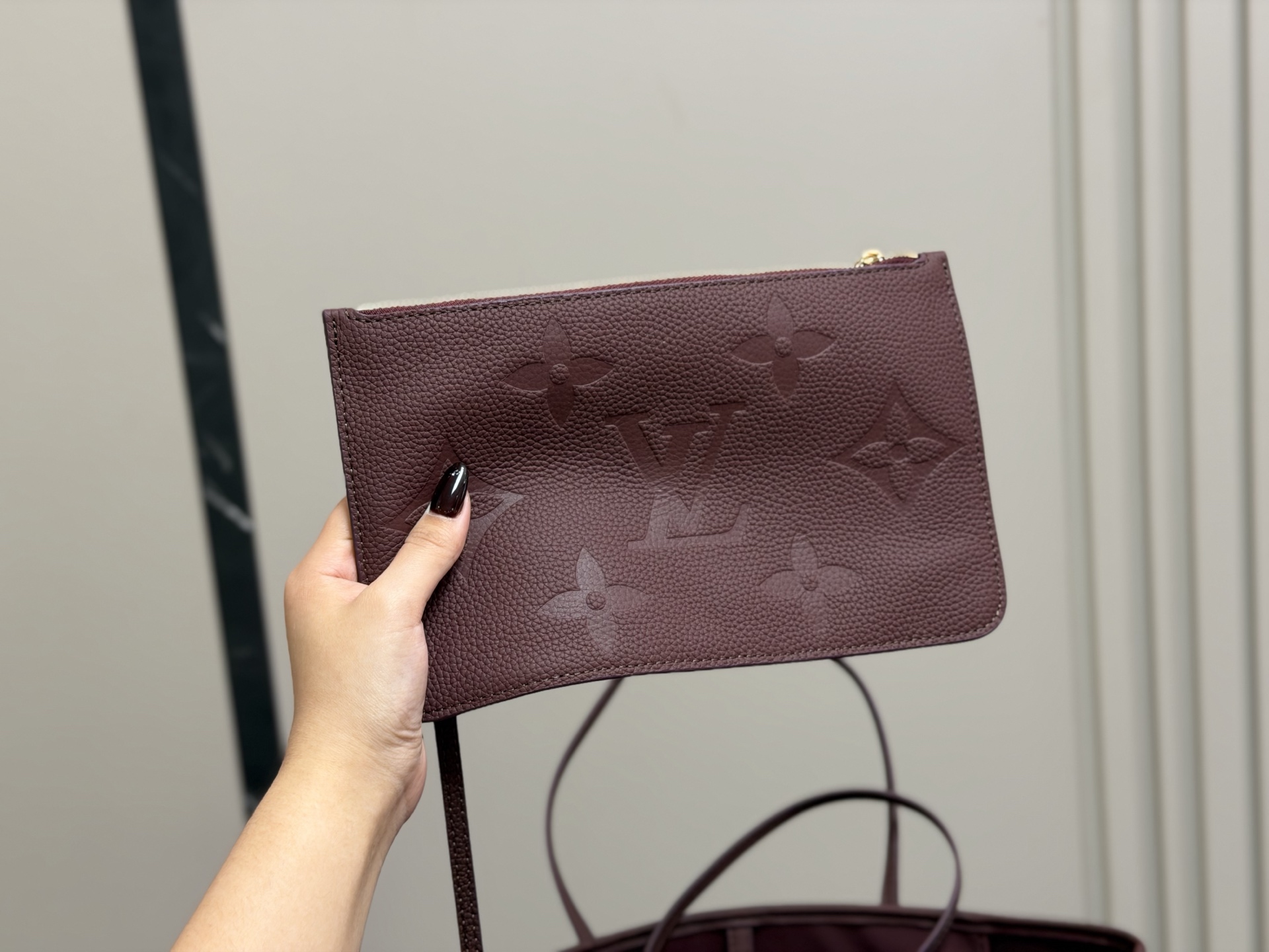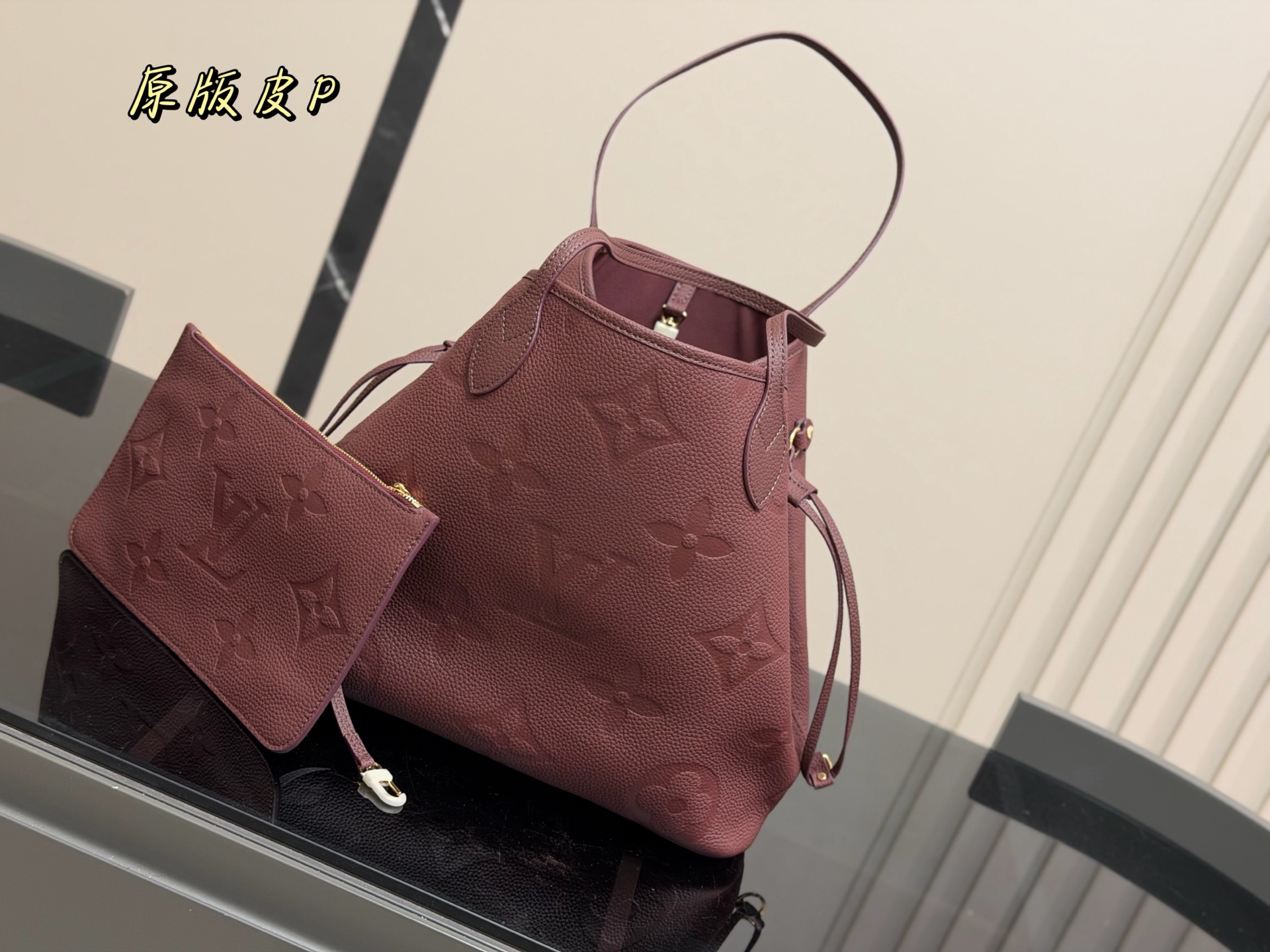The Louis Vuitton Neverfull MM tote bag is crafted from burgundy leather and includes a matching removable pouch. Dimensions: 32 x 28 cm.