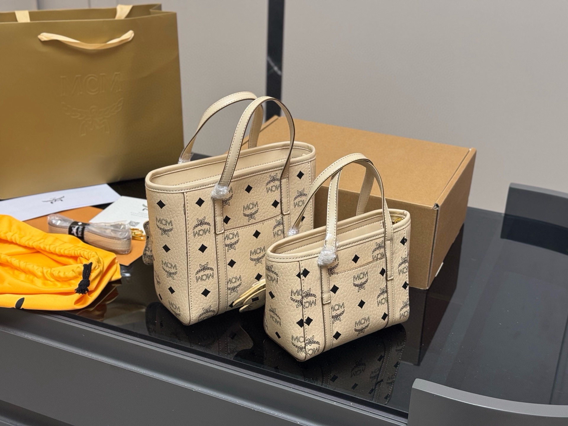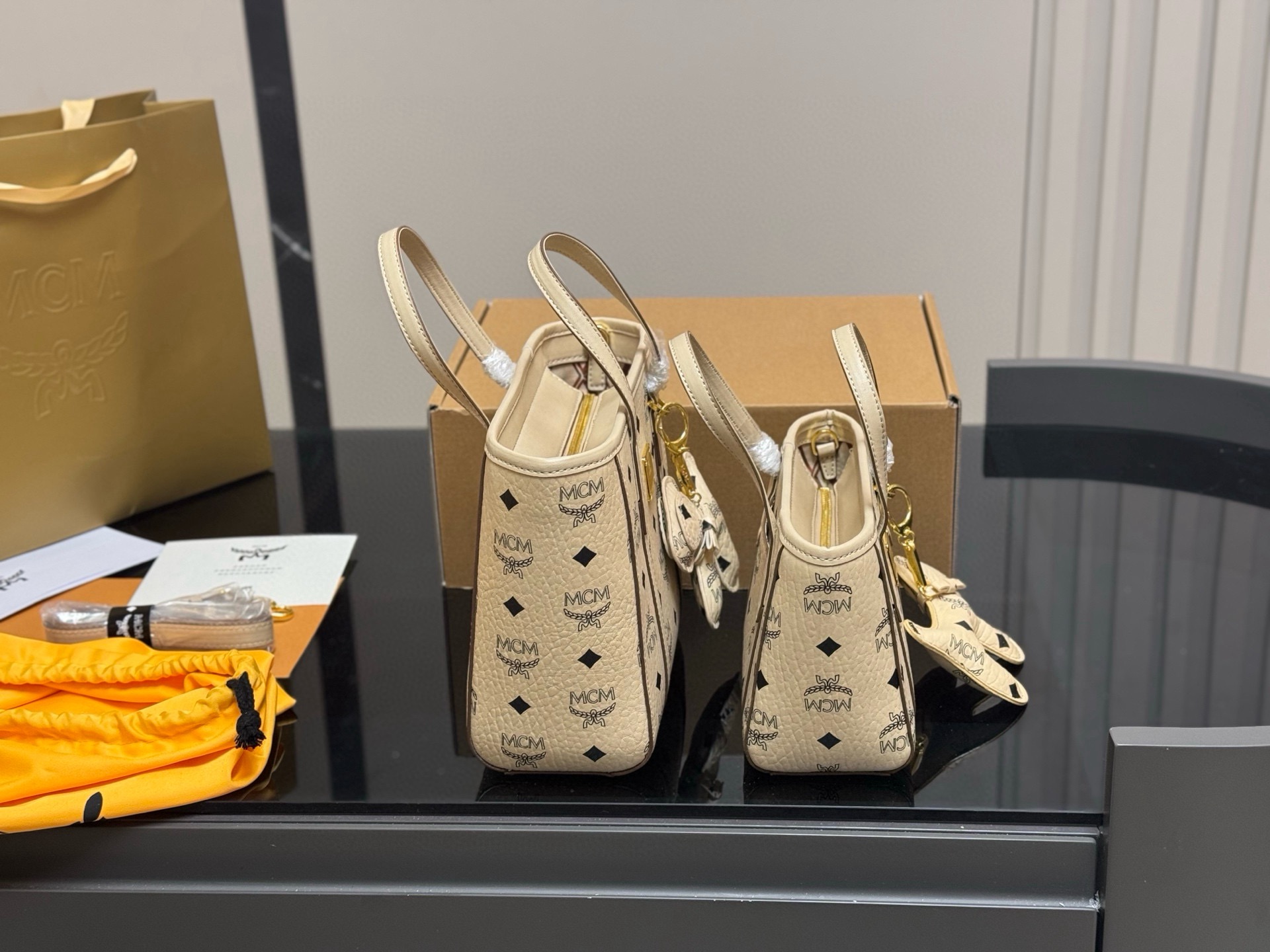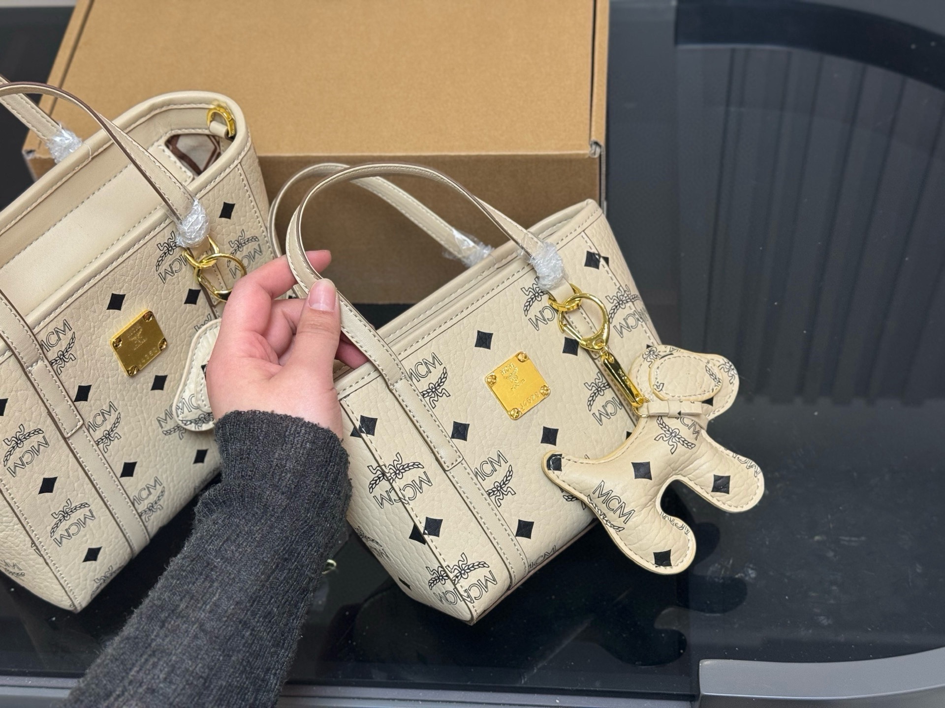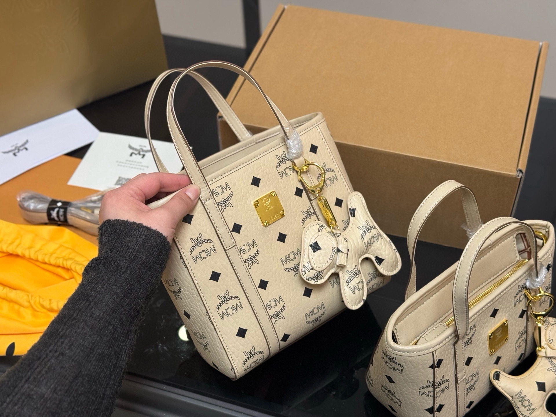 MCM Tote Bag with Dog Charm, Top Handle Handbag, Shoulder Bag, 2 Sizes