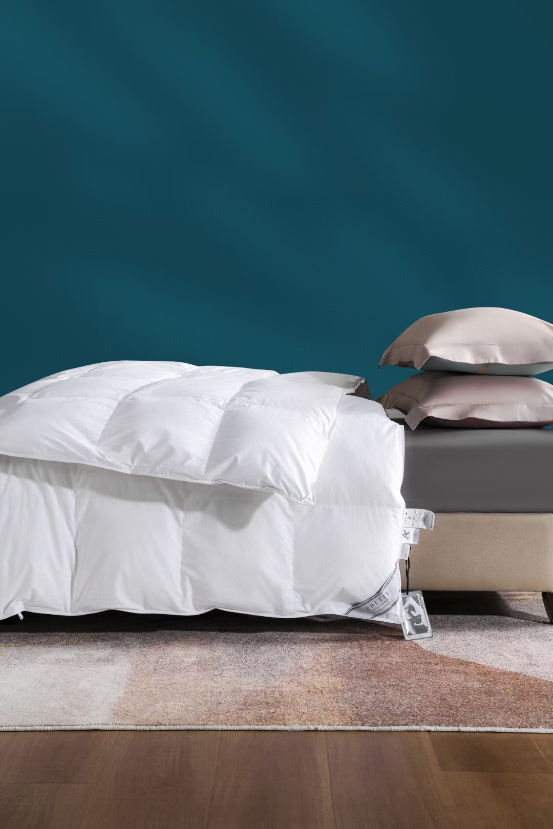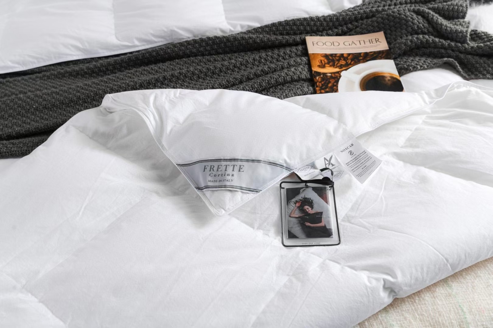 Experience luxury with FRETTE's goose down comforter. Pure cotton, breathable, & warm, as supplied to Ritz-Carlton. Available in white & grey, a touch of European elegance.