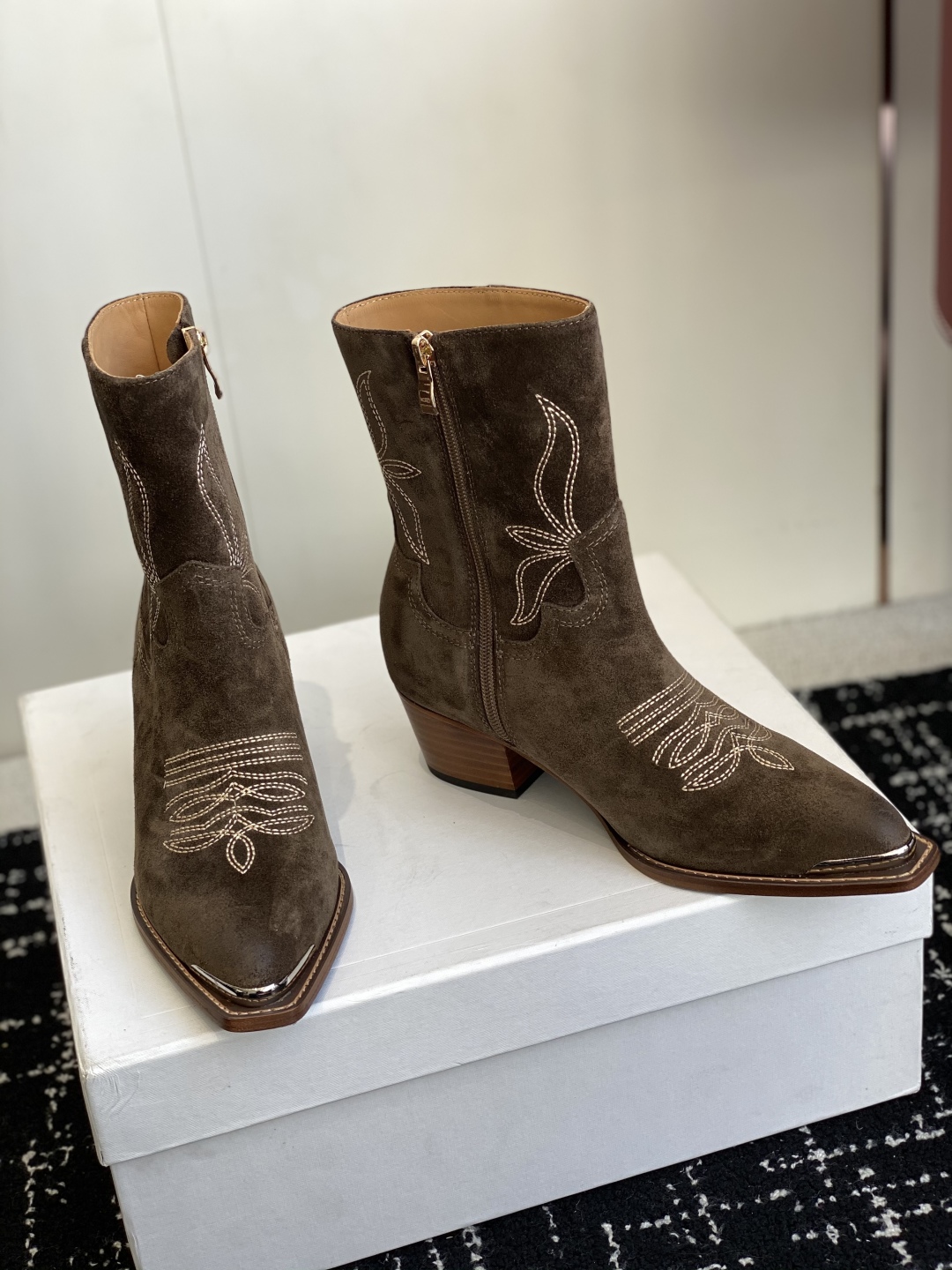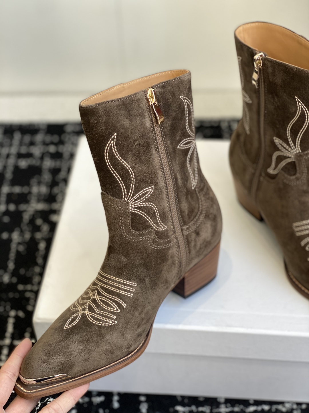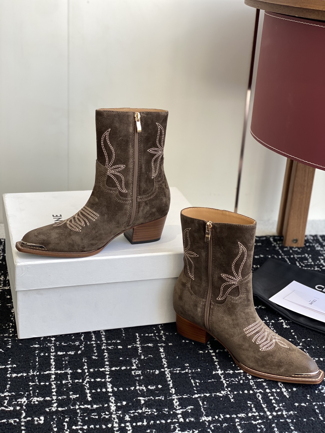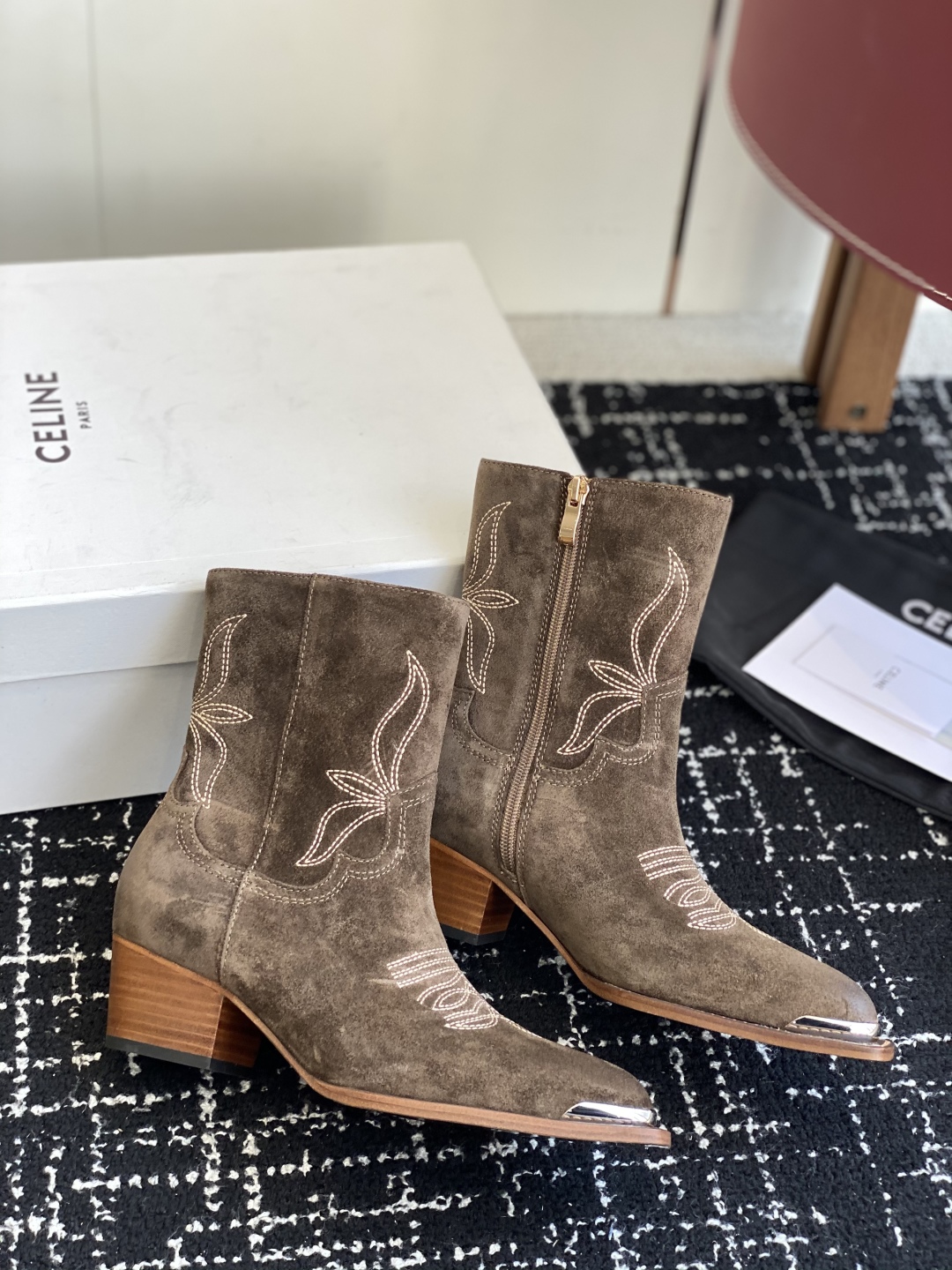 Celine Women's Suede Chelsea Ankle Boots Pointed Toe Metal Detail Brown