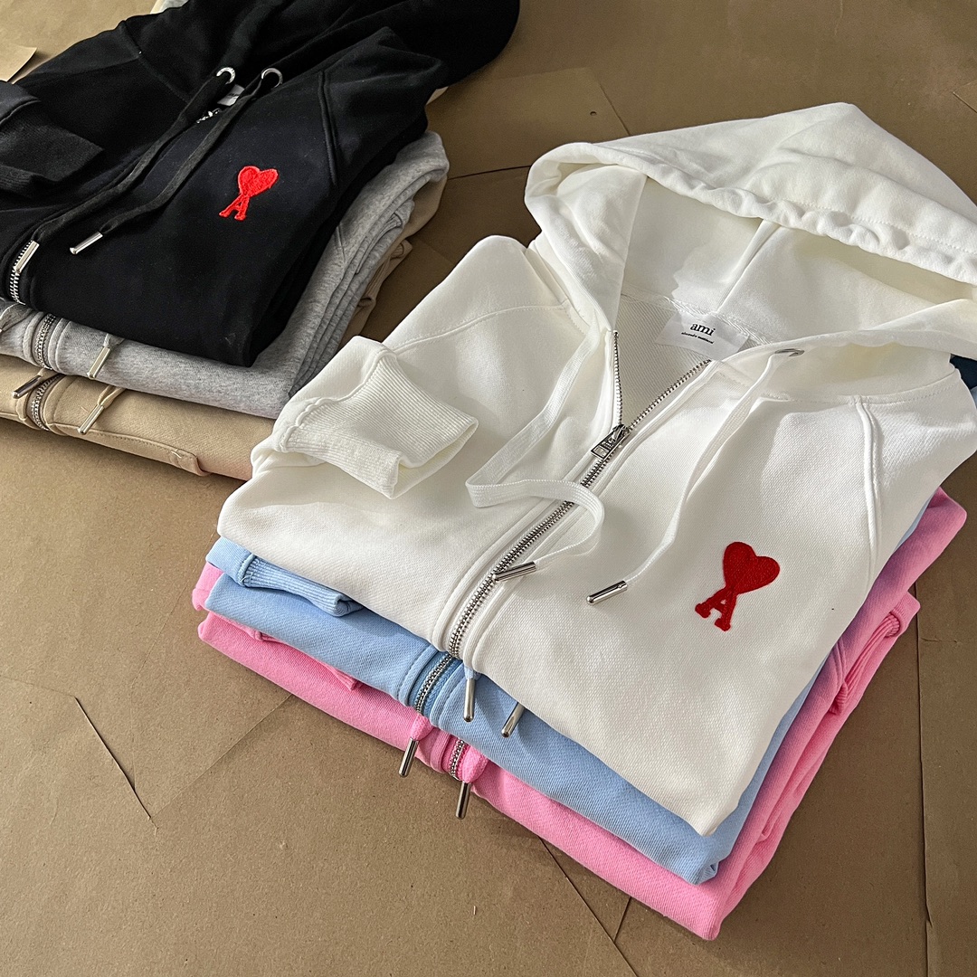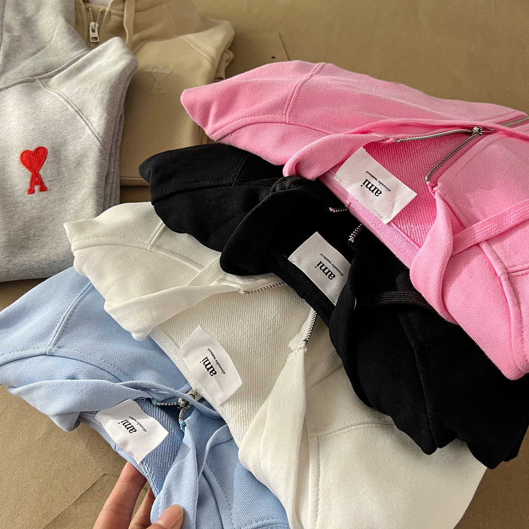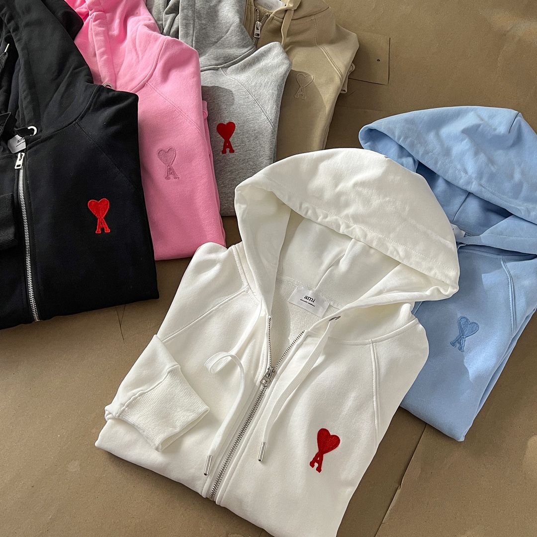 Ami Paris Heart Logo Zip-Up Hoodie Unisex Casual Sweatshirt