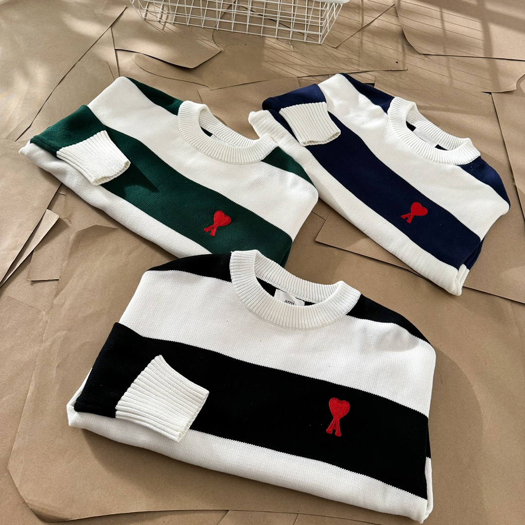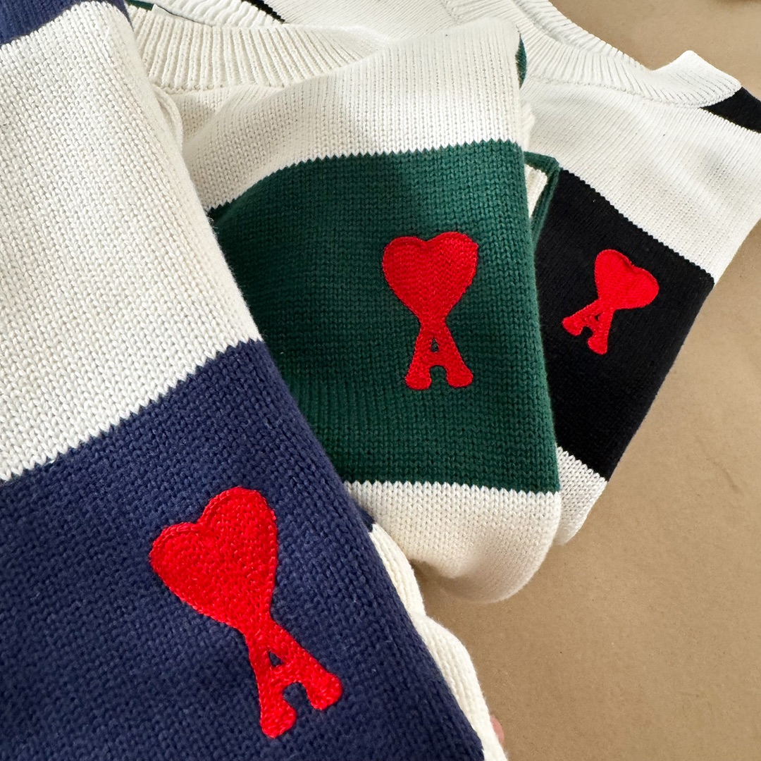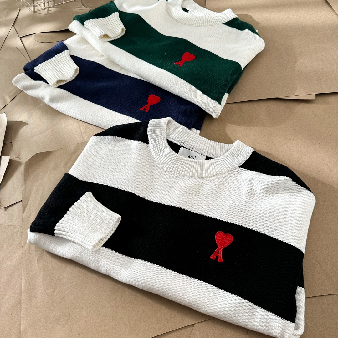 Elevate your style with this AMI PARIS sweater featuring a striped design and signature heart logo. Unisex style with a comfortable, boxy fit.