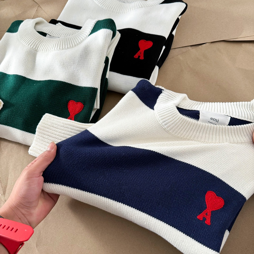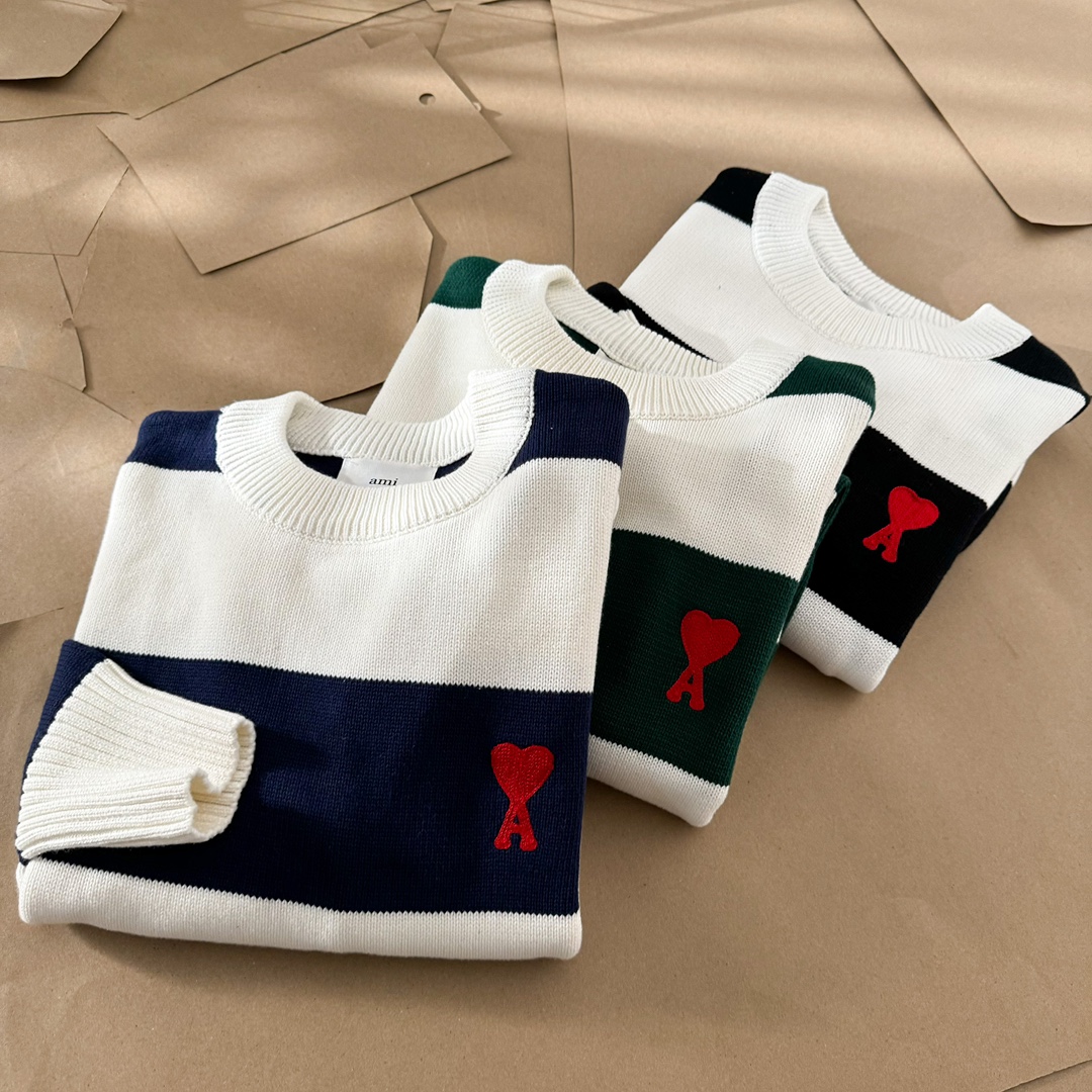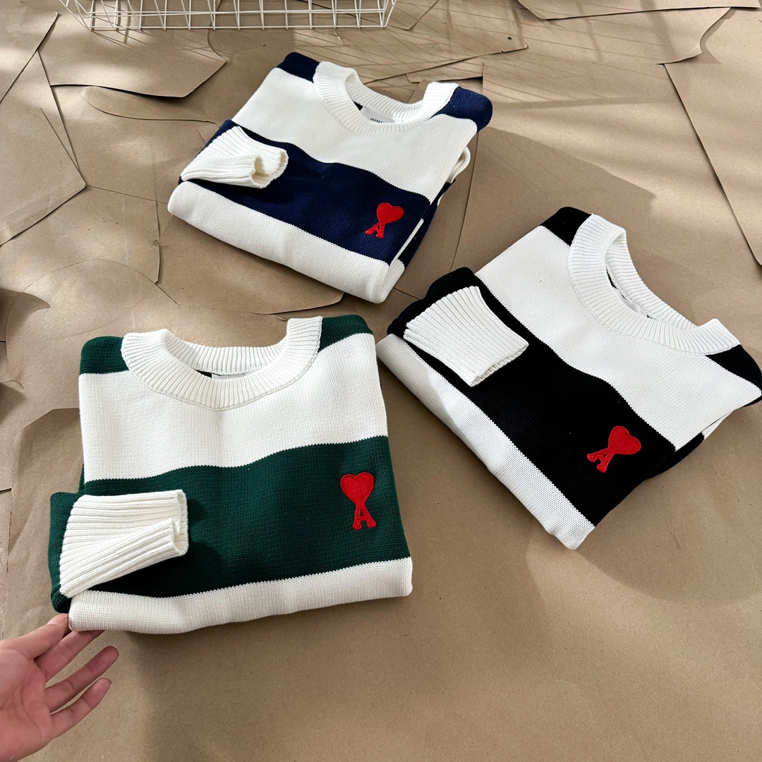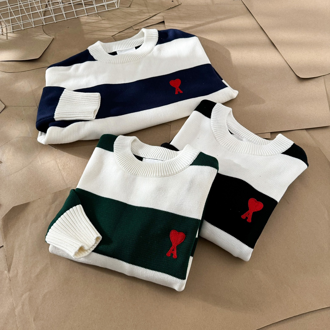 Elevate your style with this AMI PARIS sweater featuring a striped design and signature heart logo. Unisex style with a comfortable, boxy fit.