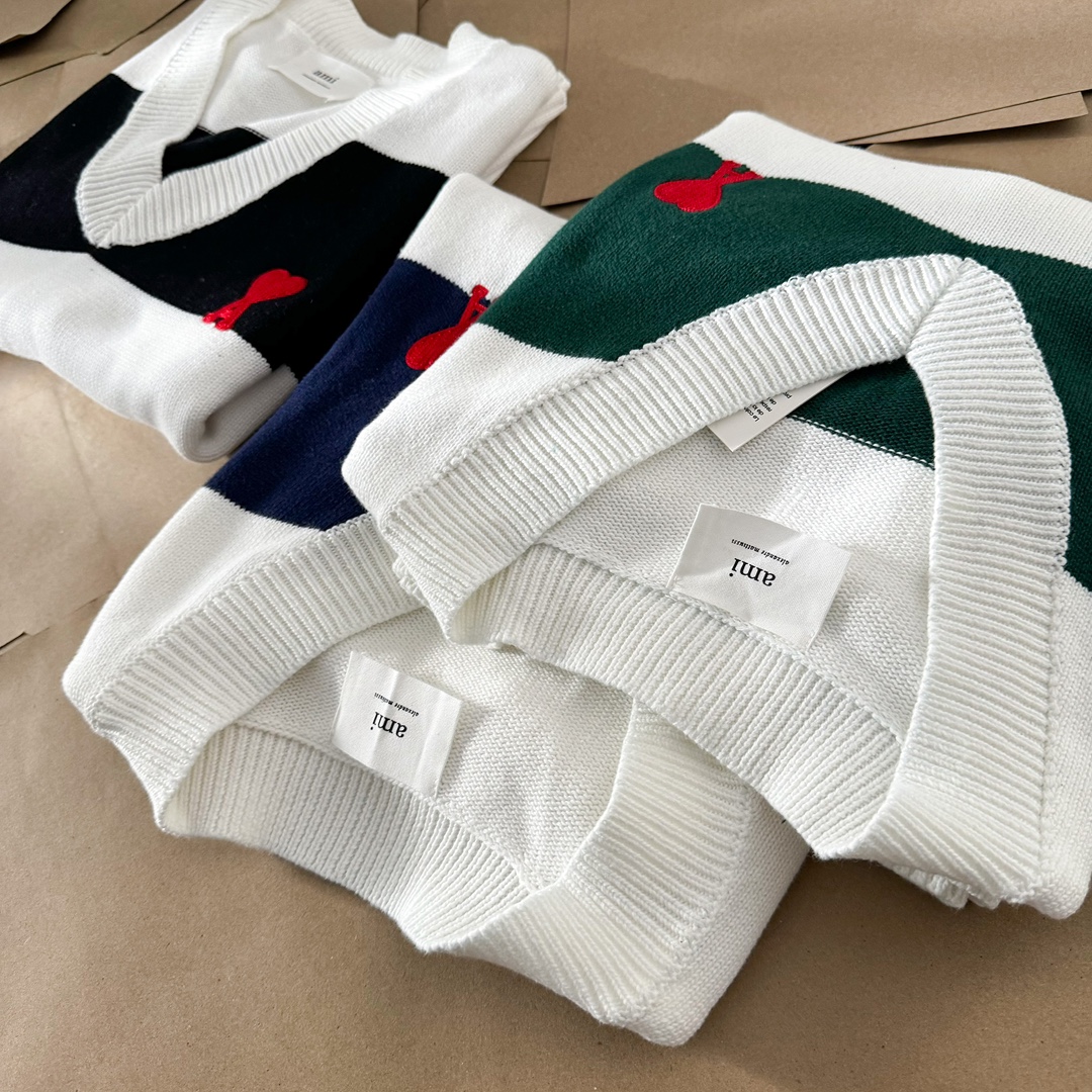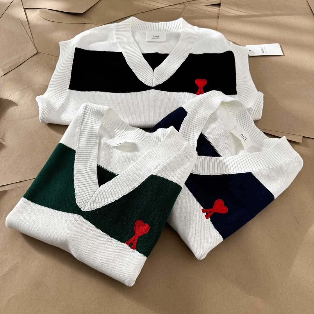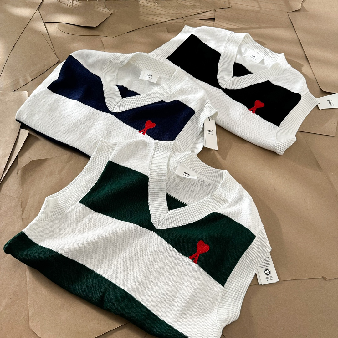 Stay stylish with this AMI Paris knit vest, featuring a signature heart logo, bold stripes, and a comfortable, unisex design. Perfect for layering!