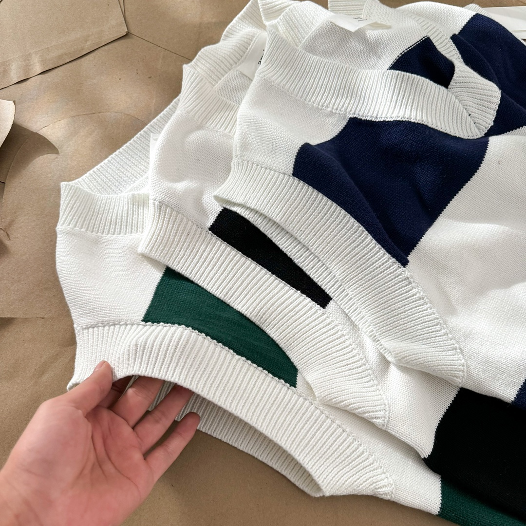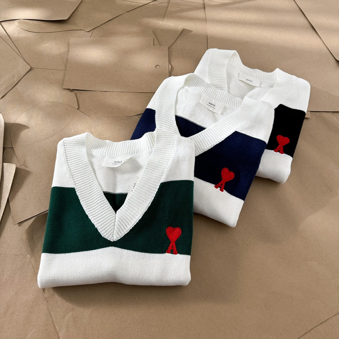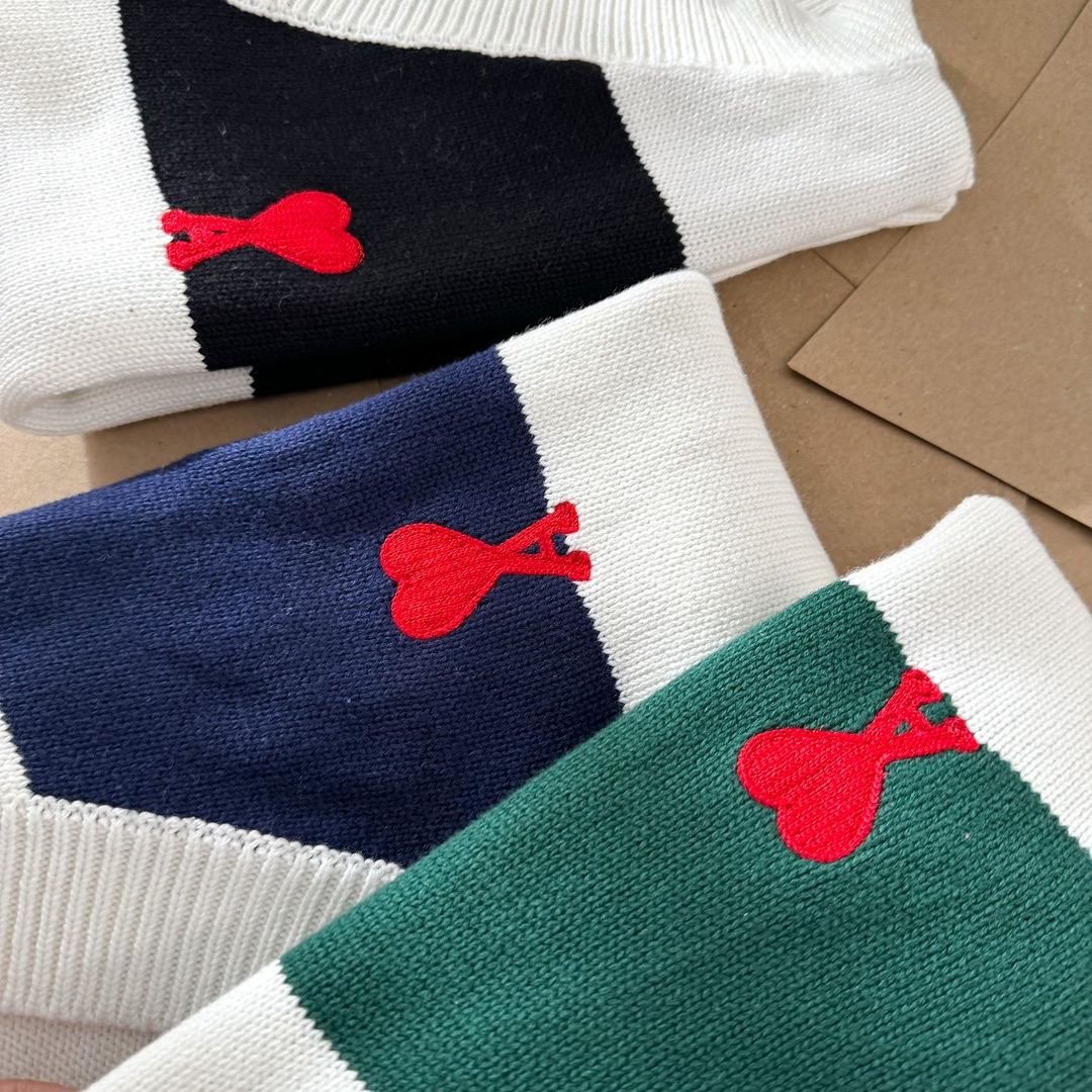 Stay stylish with this AMI Paris knit vest, featuring a signature heart logo, bold stripes, and a comfortable, unisex design. Perfect for layering!
