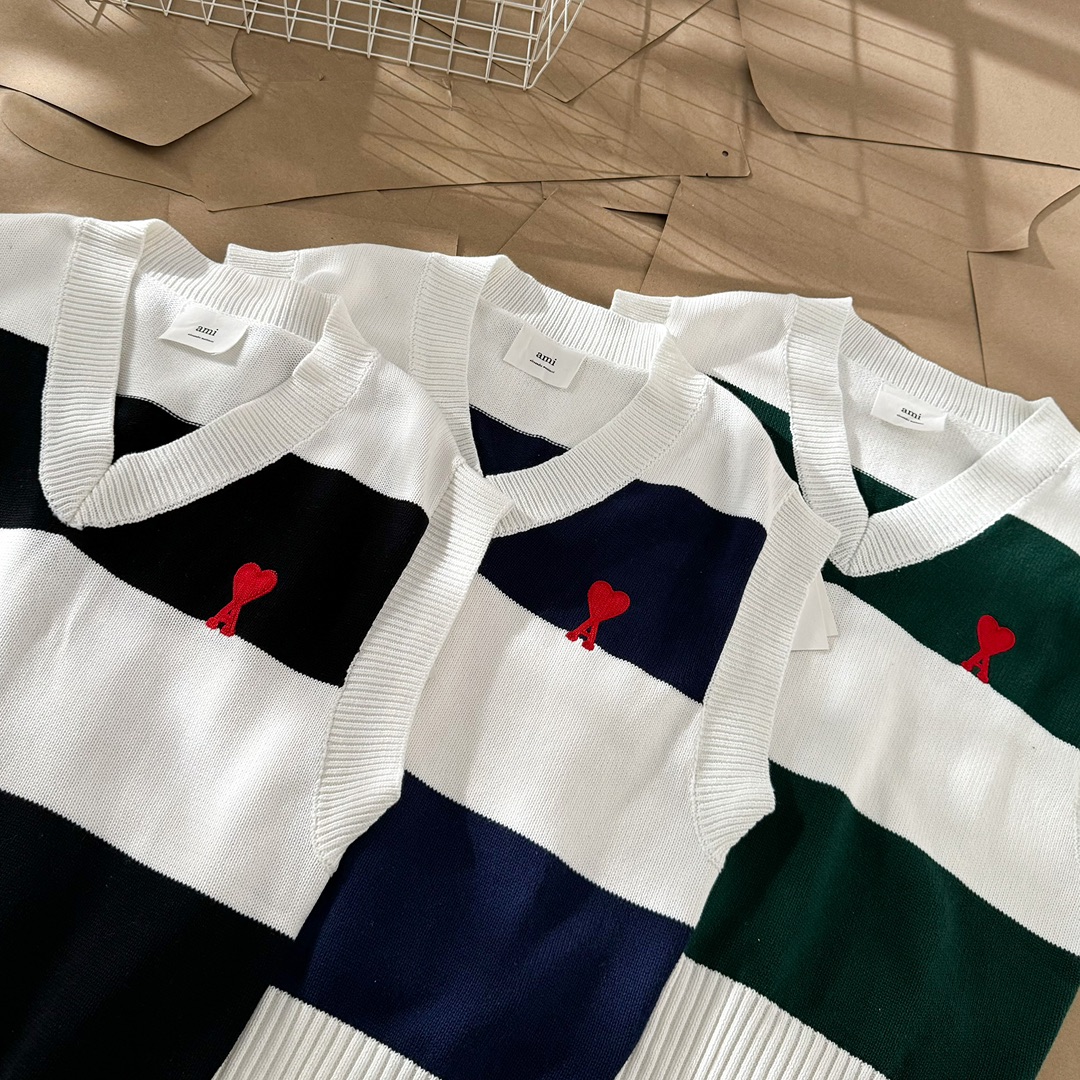 AMI Paris Striped Knit Vest with Embroidered Heart Logo - Unisex Style
