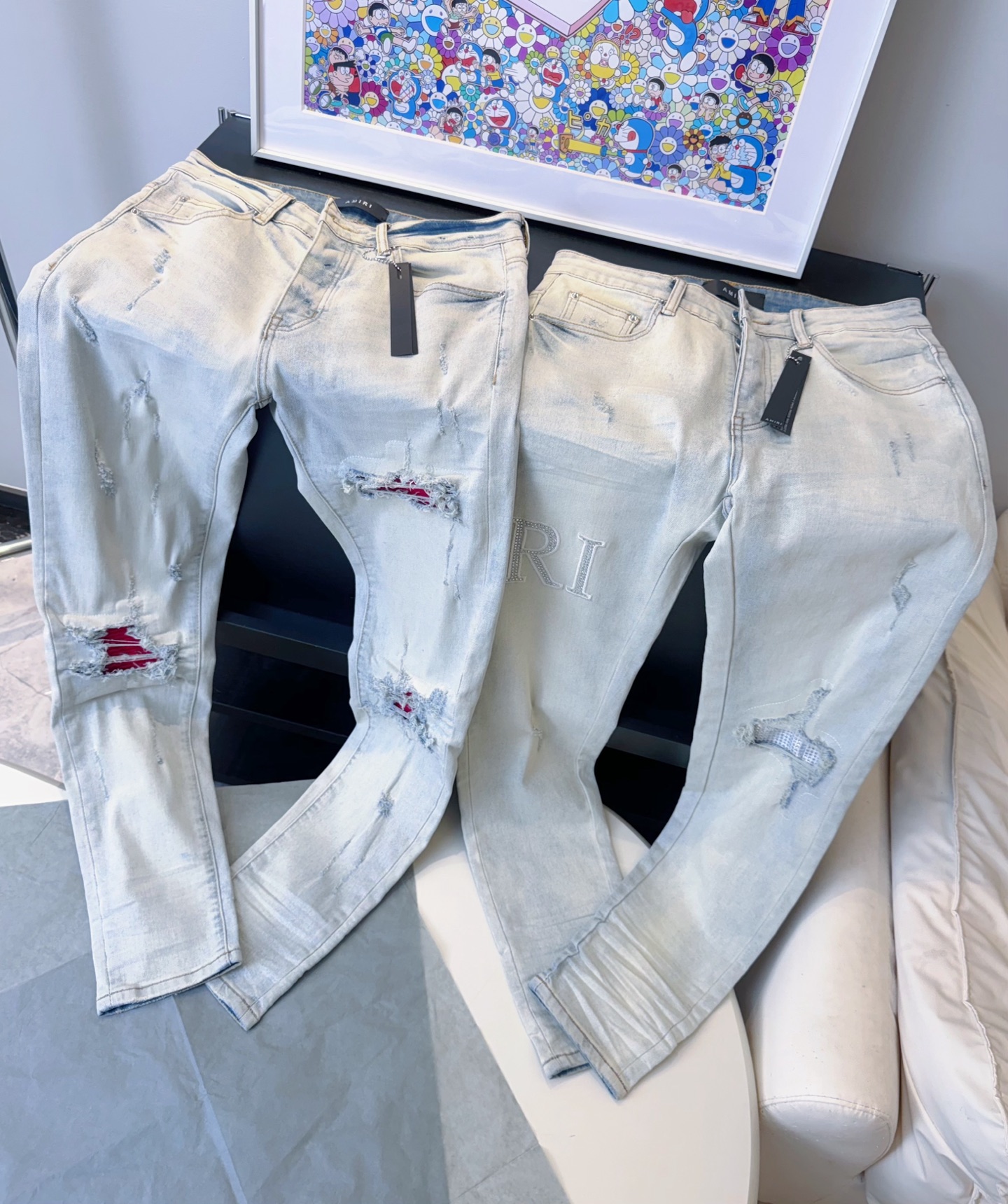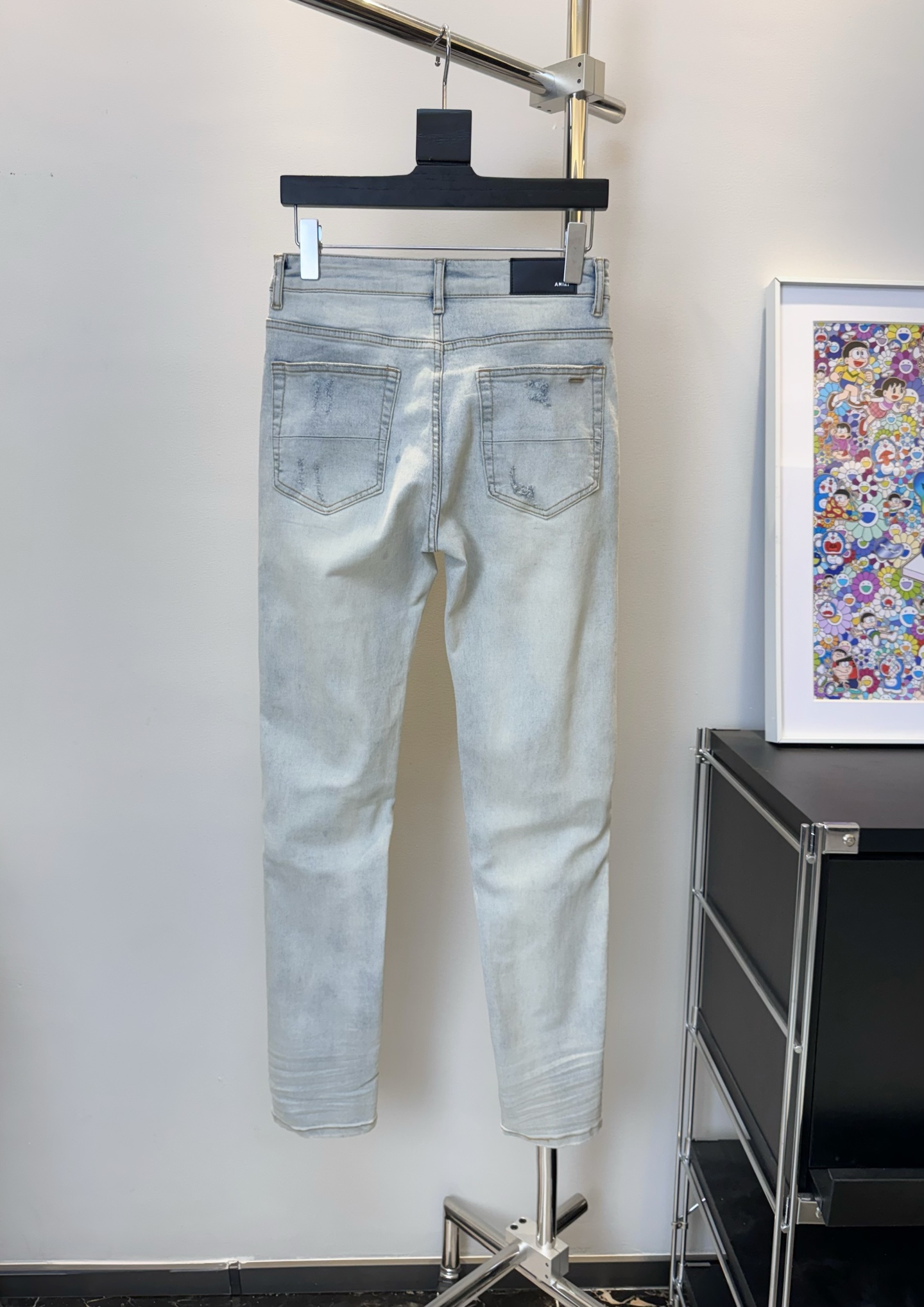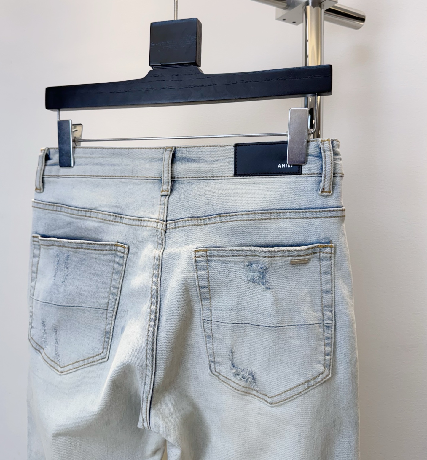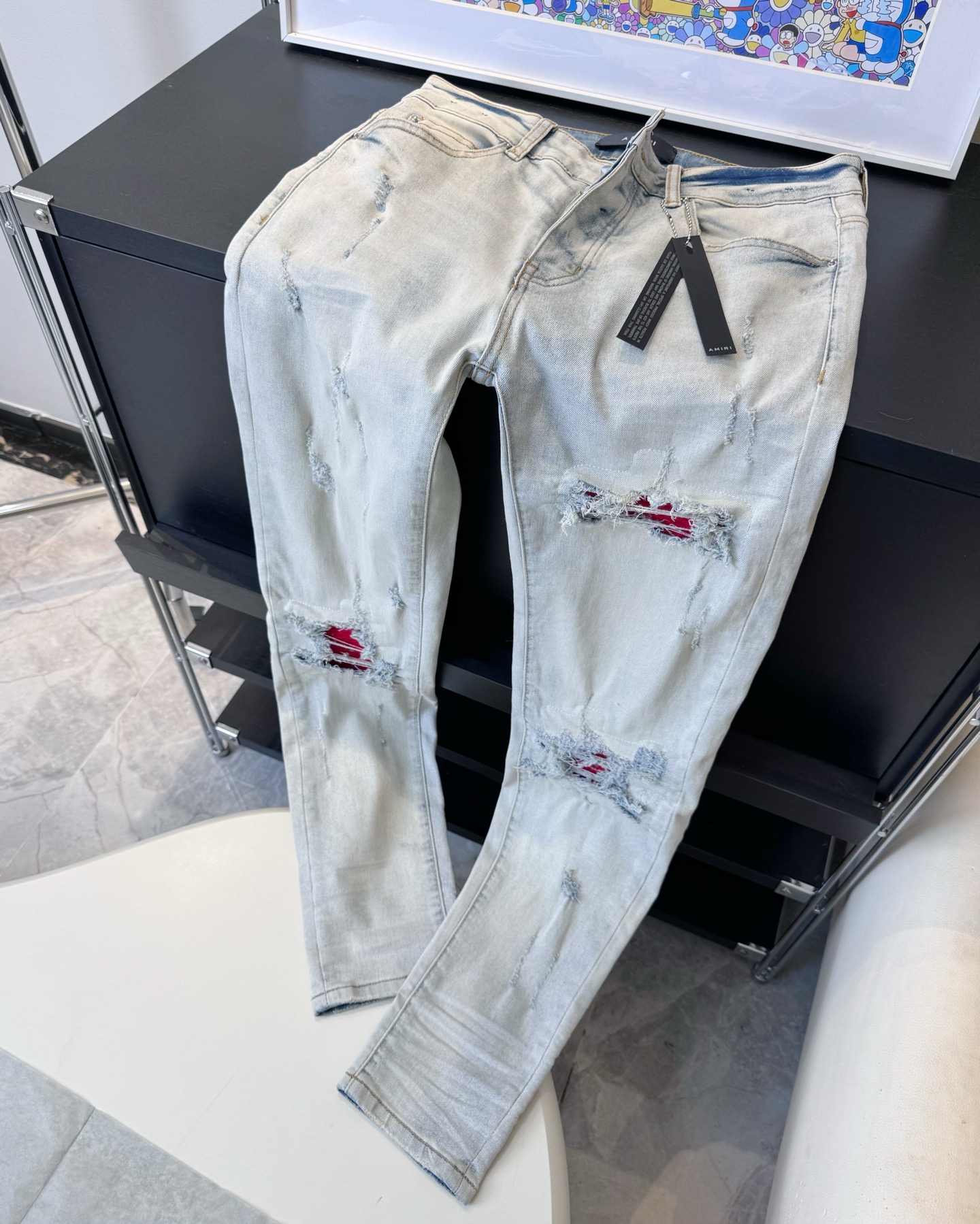 Amiri MX1 Red Patch Distressed Denim Jeans, Slim Fit, High Street Fashion