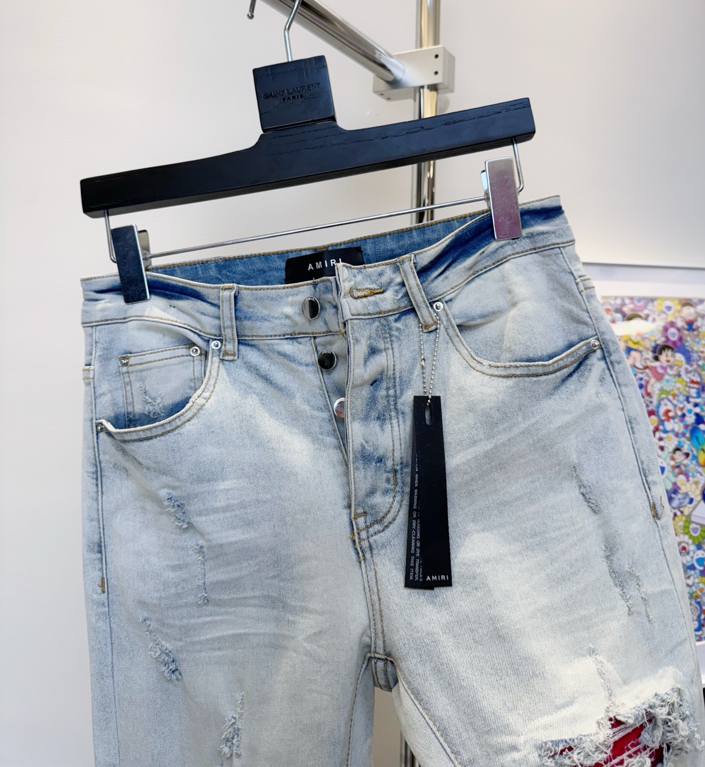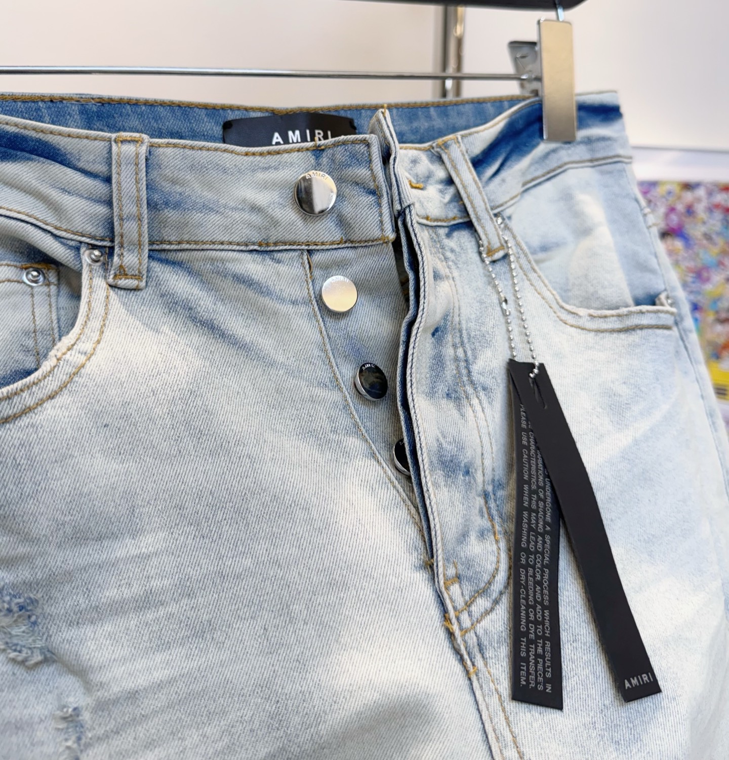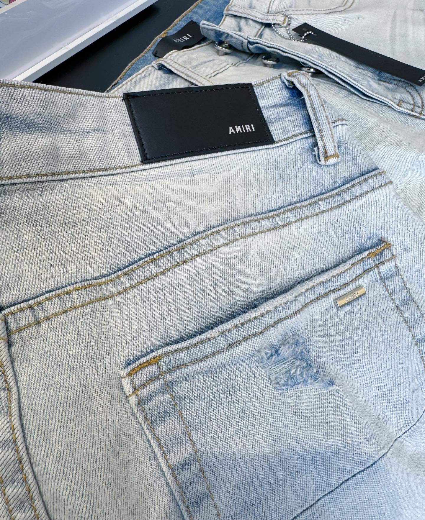 Amiri MX1 red patch distressed denim jeans combine luxury craftsmanship with a bold, street-inspired aesthetic. Perfect for making a statement and elevating any outfit.