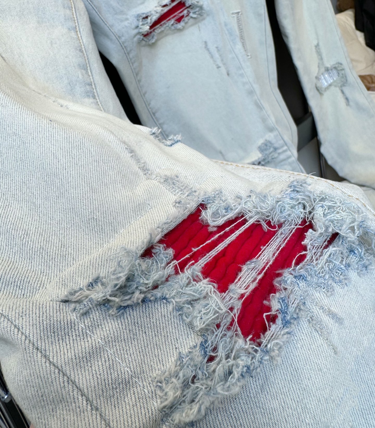 - Red Patch Detailing: Eye-catching red patches behind distressed areas.