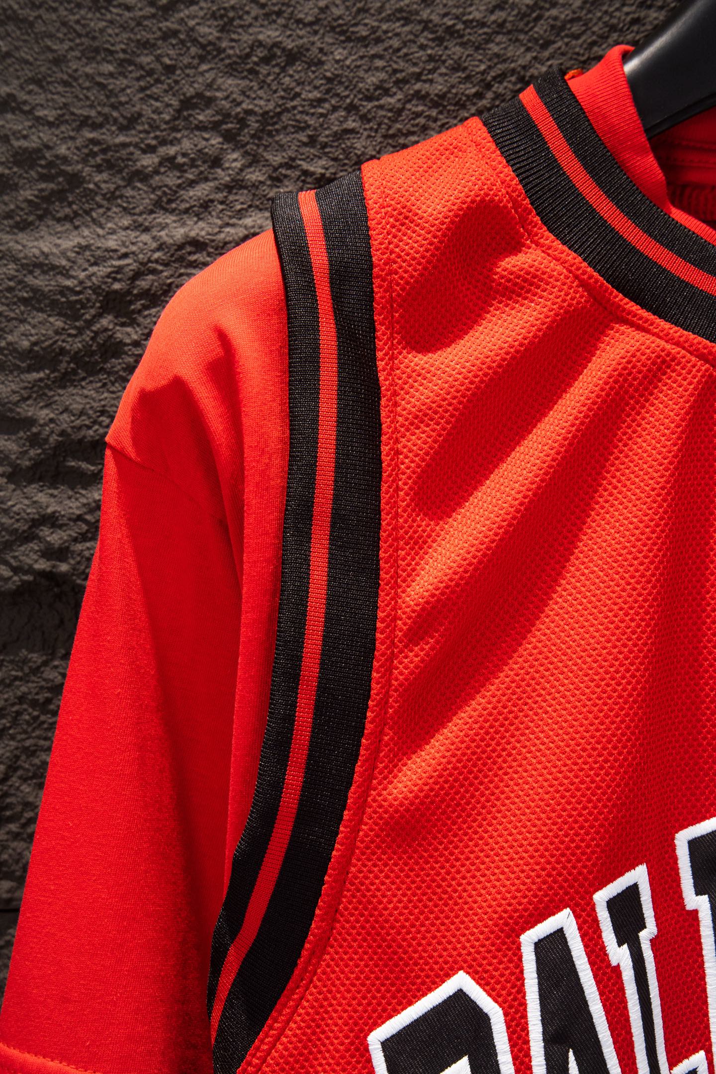 Balenciaga jersey patchwork long sleeve top in oversized fit. Comfortable, stylish, and versatile for everyday wear. Perfect for a trendy, street-style look.