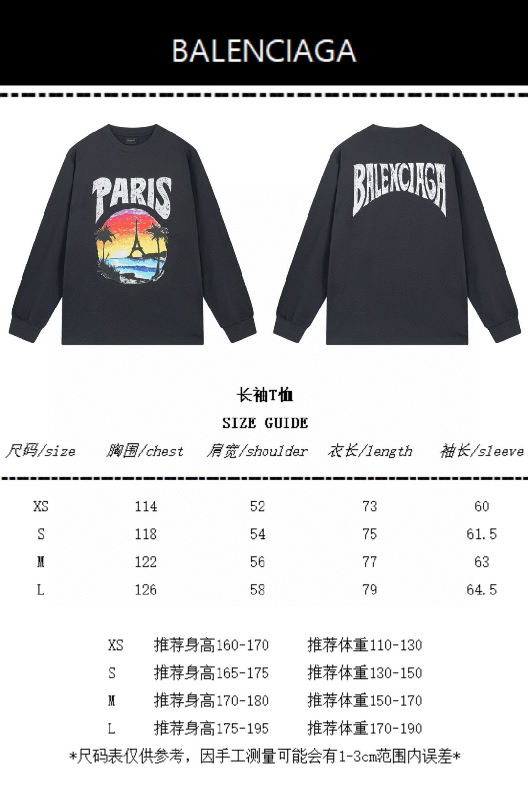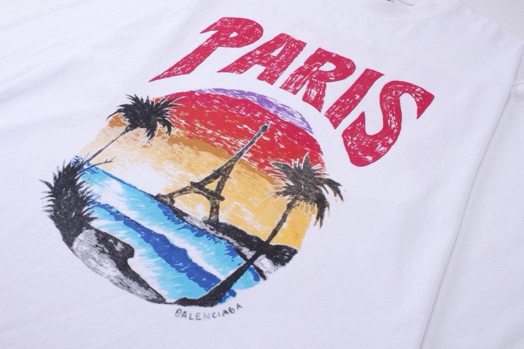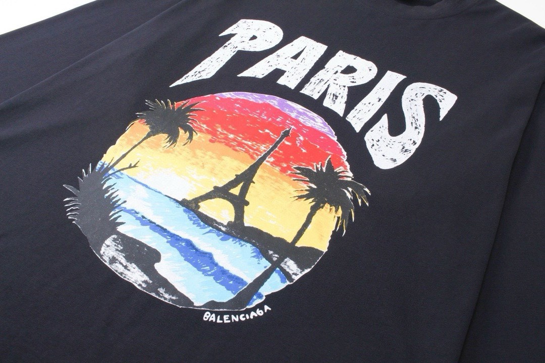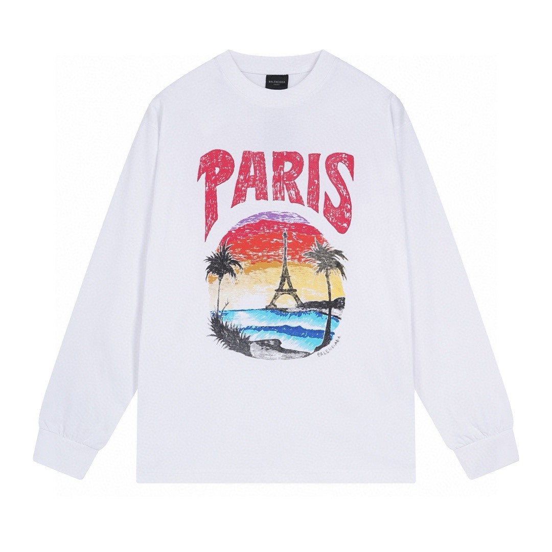 Elevate your style with this Balenciaga long sleeve tee featuring a Paris sunset print, crafted from 260g double yarn cotton for superior comfort.