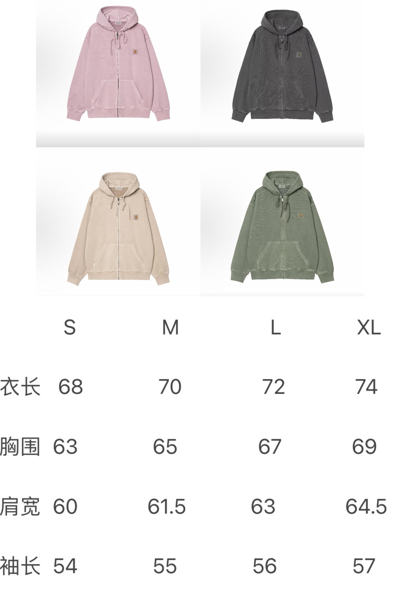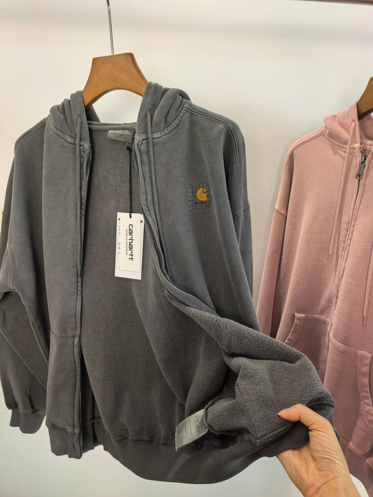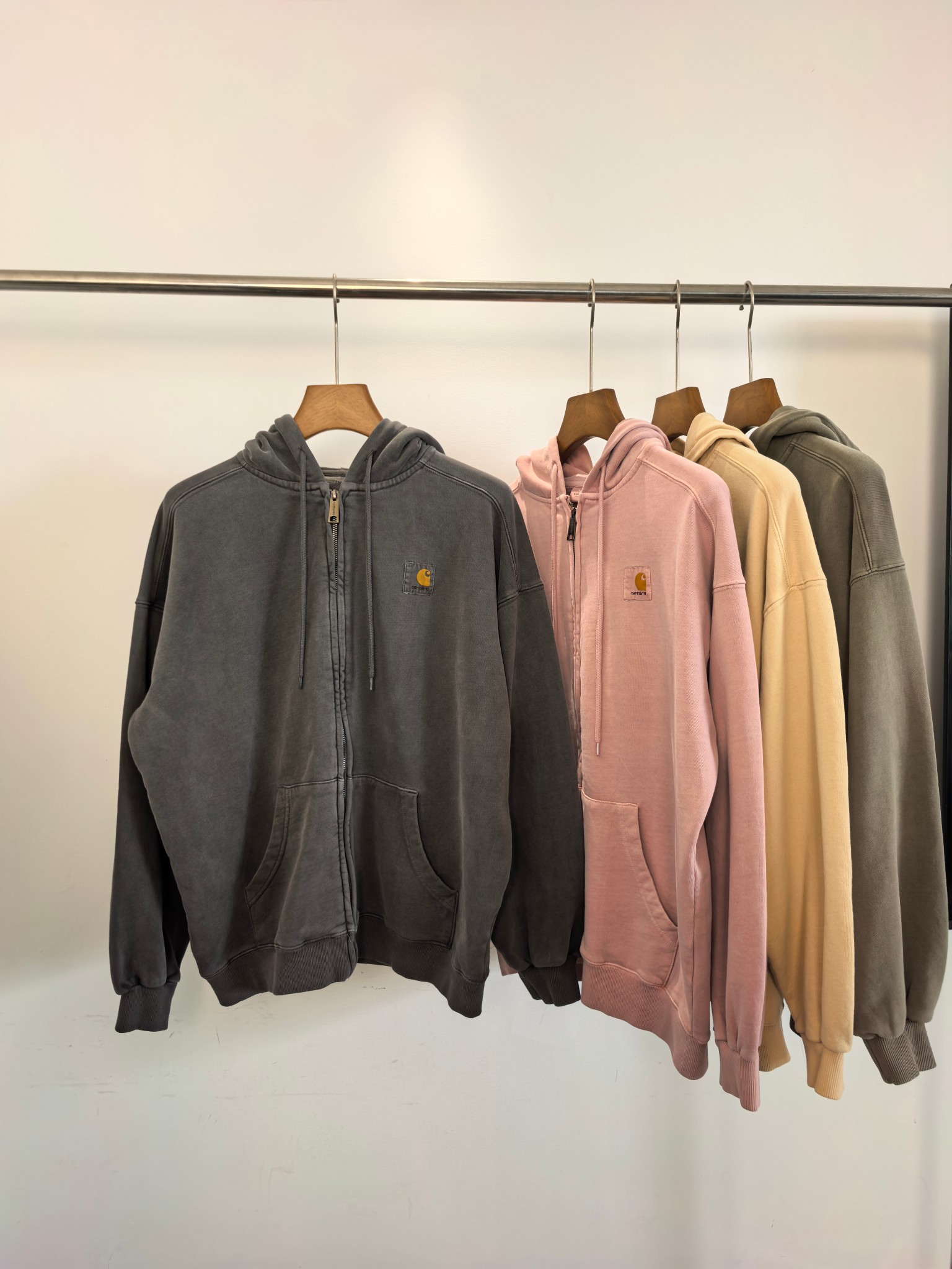 Stay stylish and comfortable with this Carhartt WIP full-zip hoodie. Available in washed Black, Pink, Khaki, and Grey Green colors.