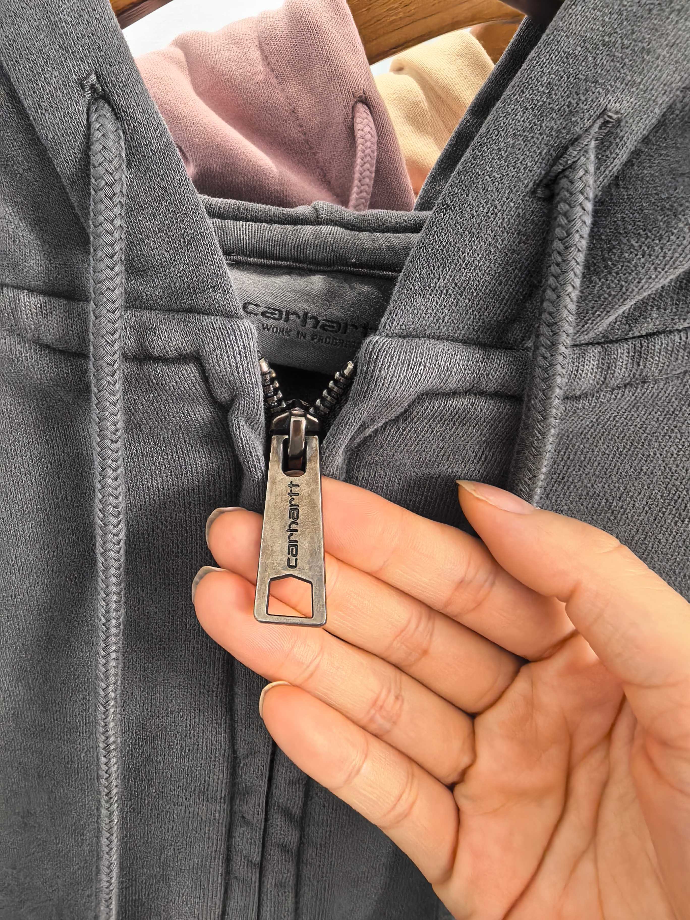 The Carhartt WIP series brings you a blend of quality, durability, and comfort. This full-zip hooded sweatshirt features an extra-long drawstring and a stylish washed finish, embodying Carhartt's signature style with a touch of streetwear flair.