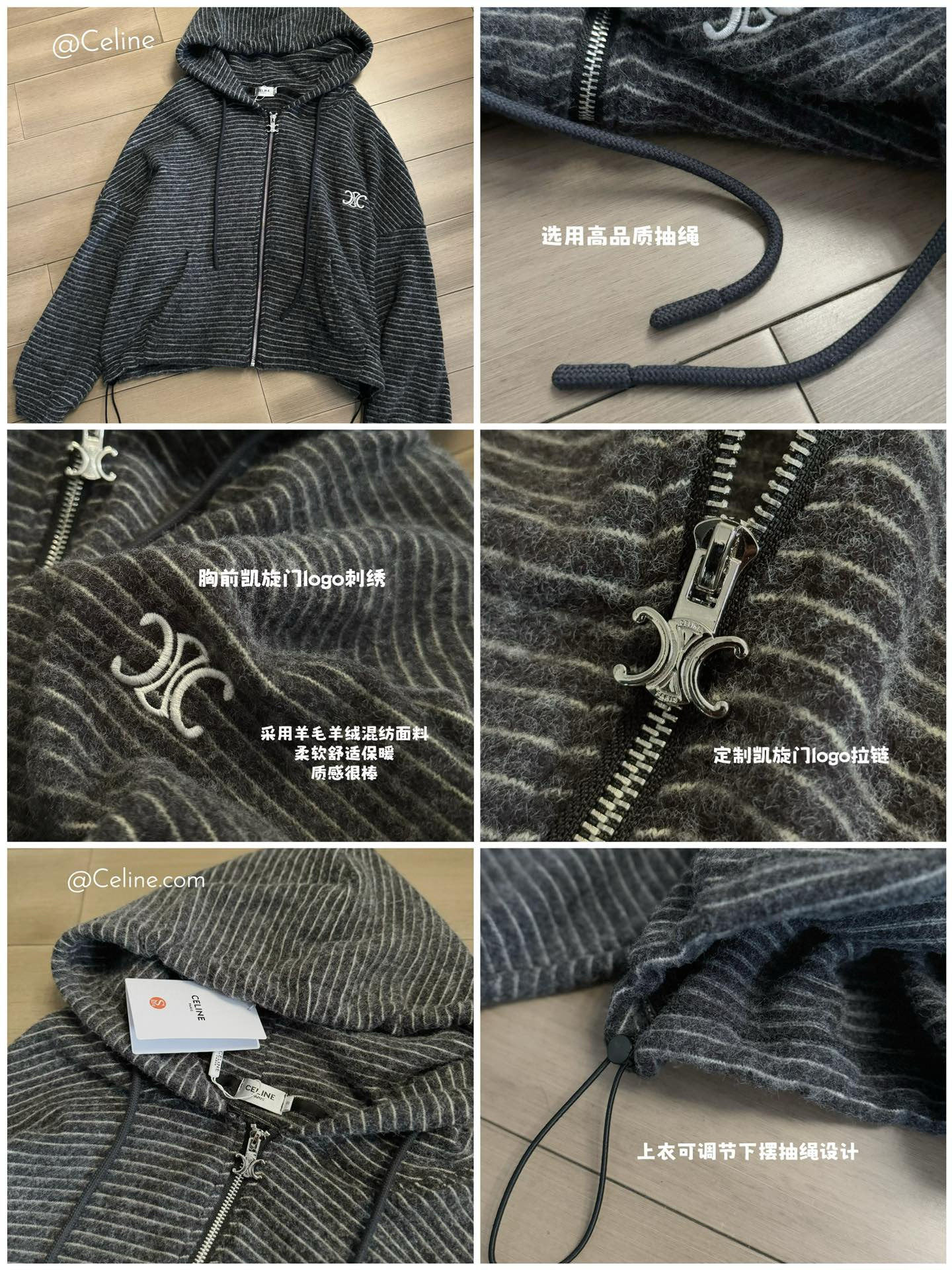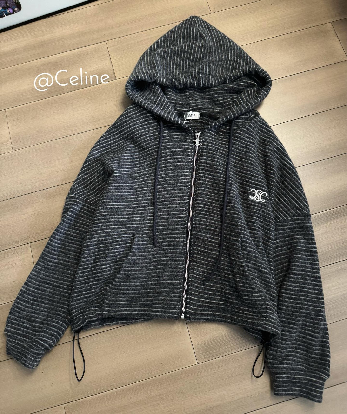 Stay cozy in this Celine cashmere tracksuit. Features a zip-up hoodie and wide-leg pants with an embroidered logo. Perfect for errands or lounging.