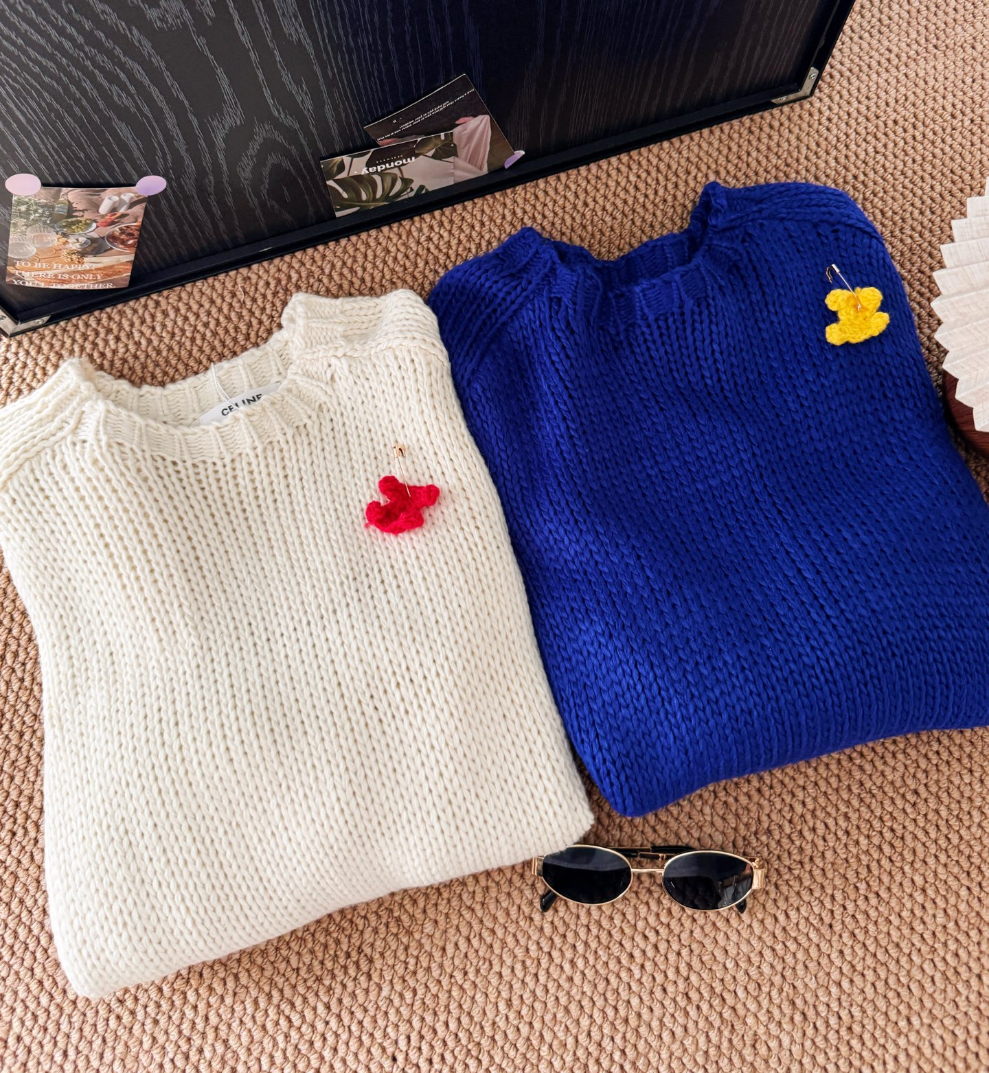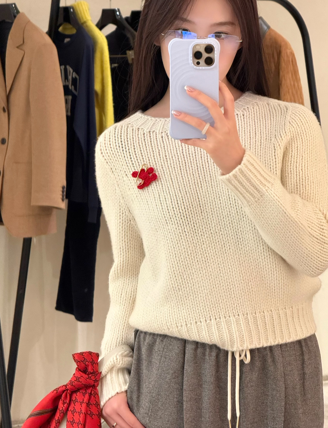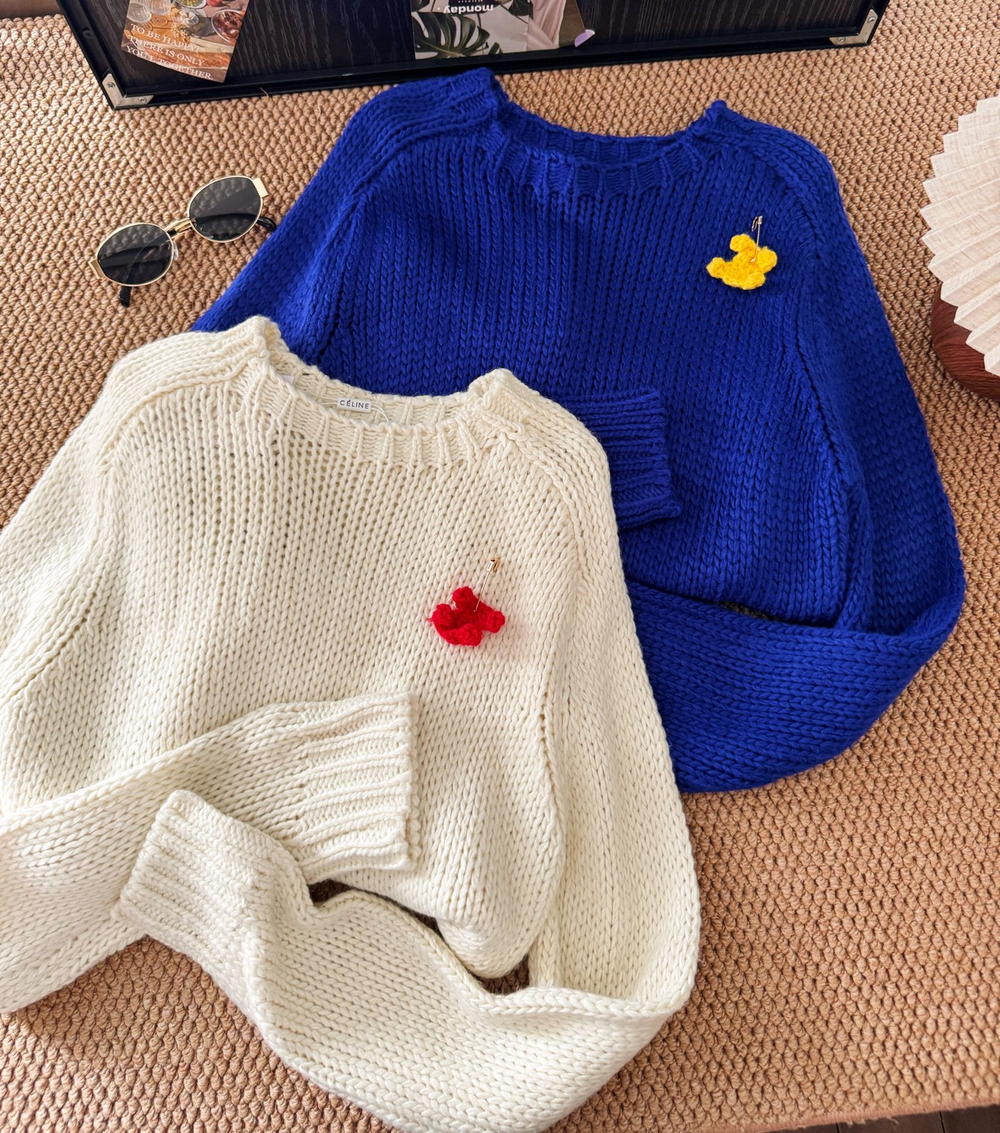 Wrap yourself in the soft texture of this wool sweater featuring a detachable brooch, perfect for adding a touch of Parisian charm to your everyday style. Available in M and L.