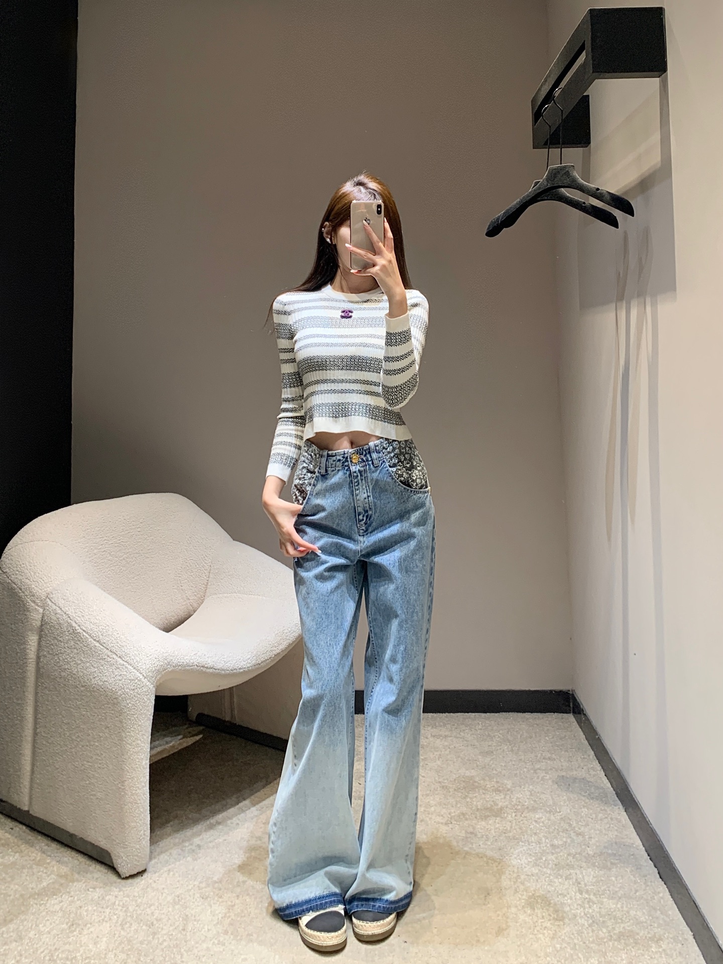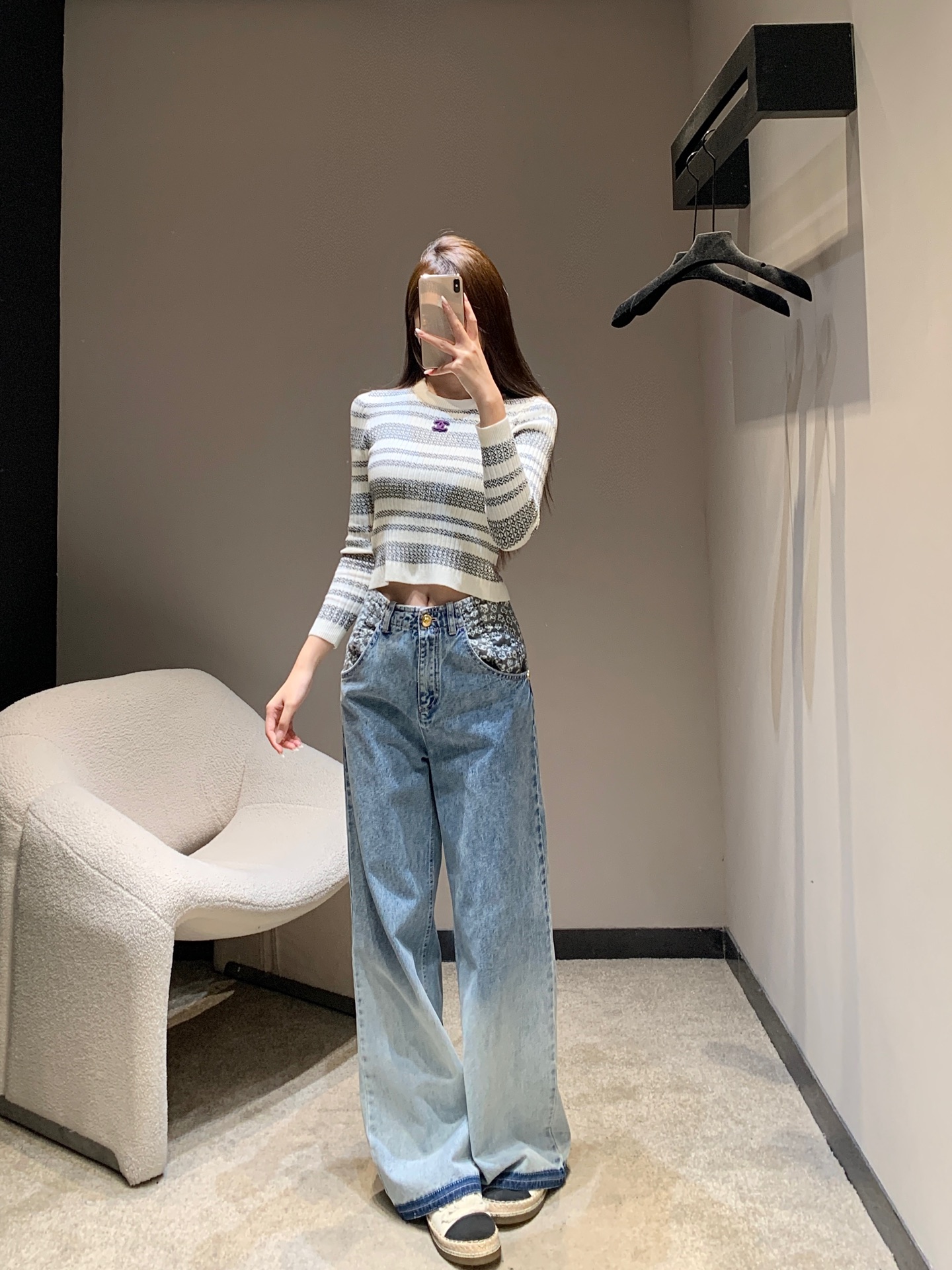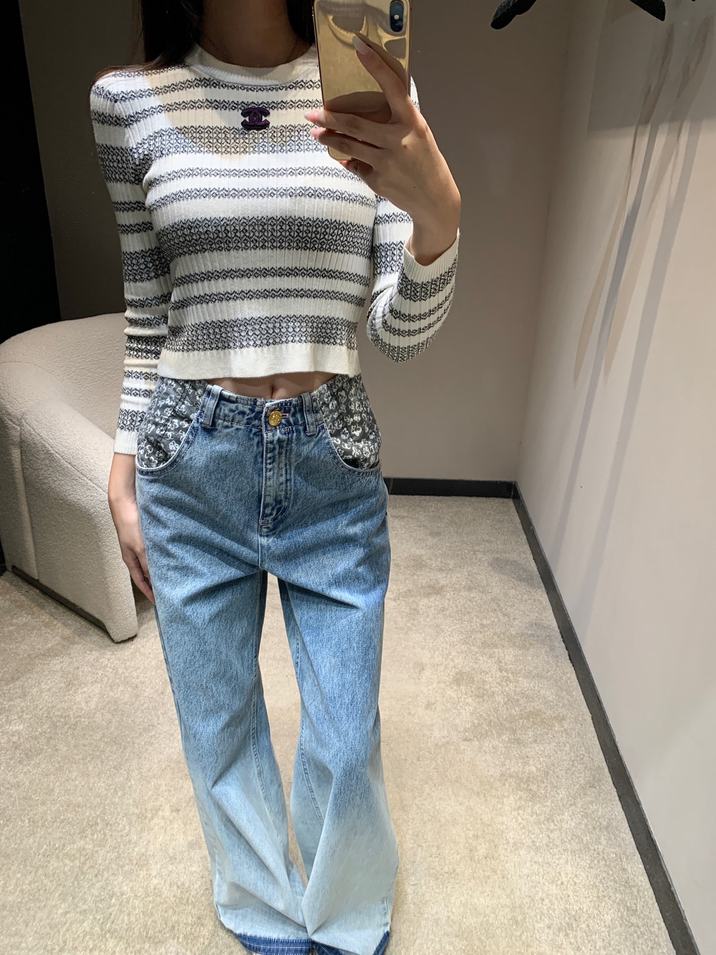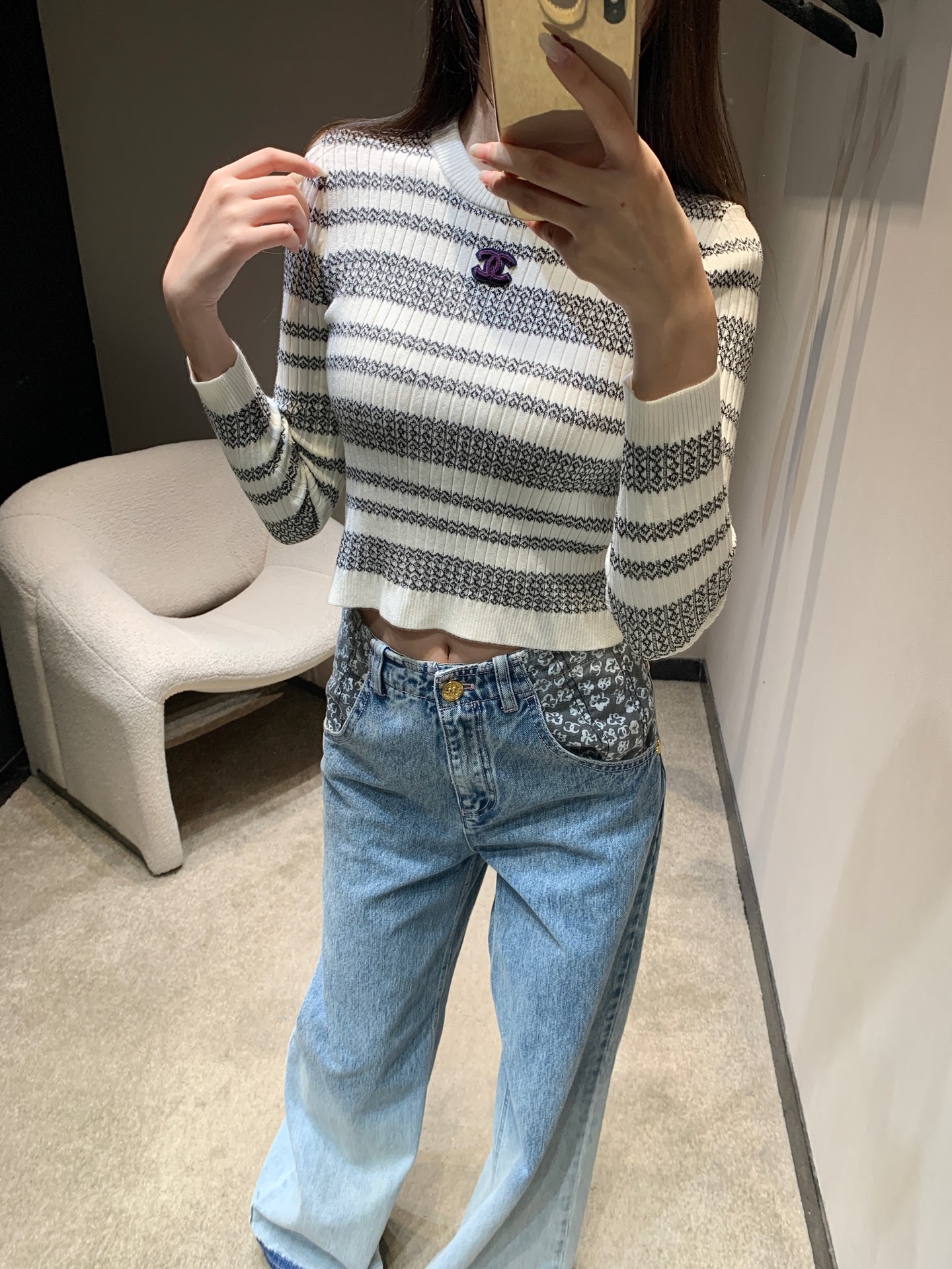 Classic striped Chanel knit top with a soft, skin-friendly fabric. The cropped design flatters your figure, perfect for casual outings or dates.