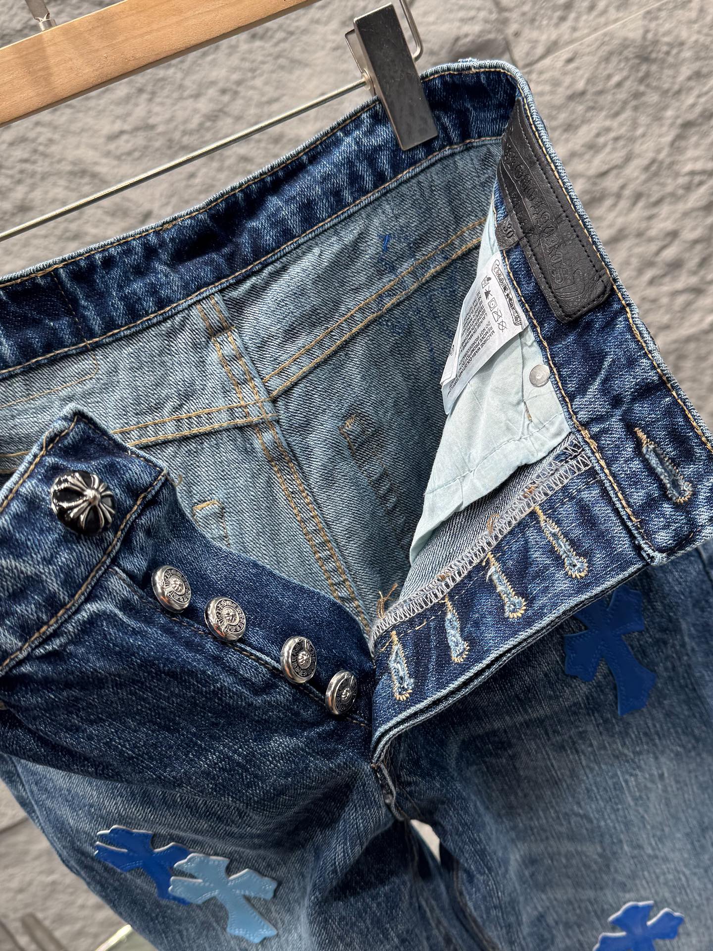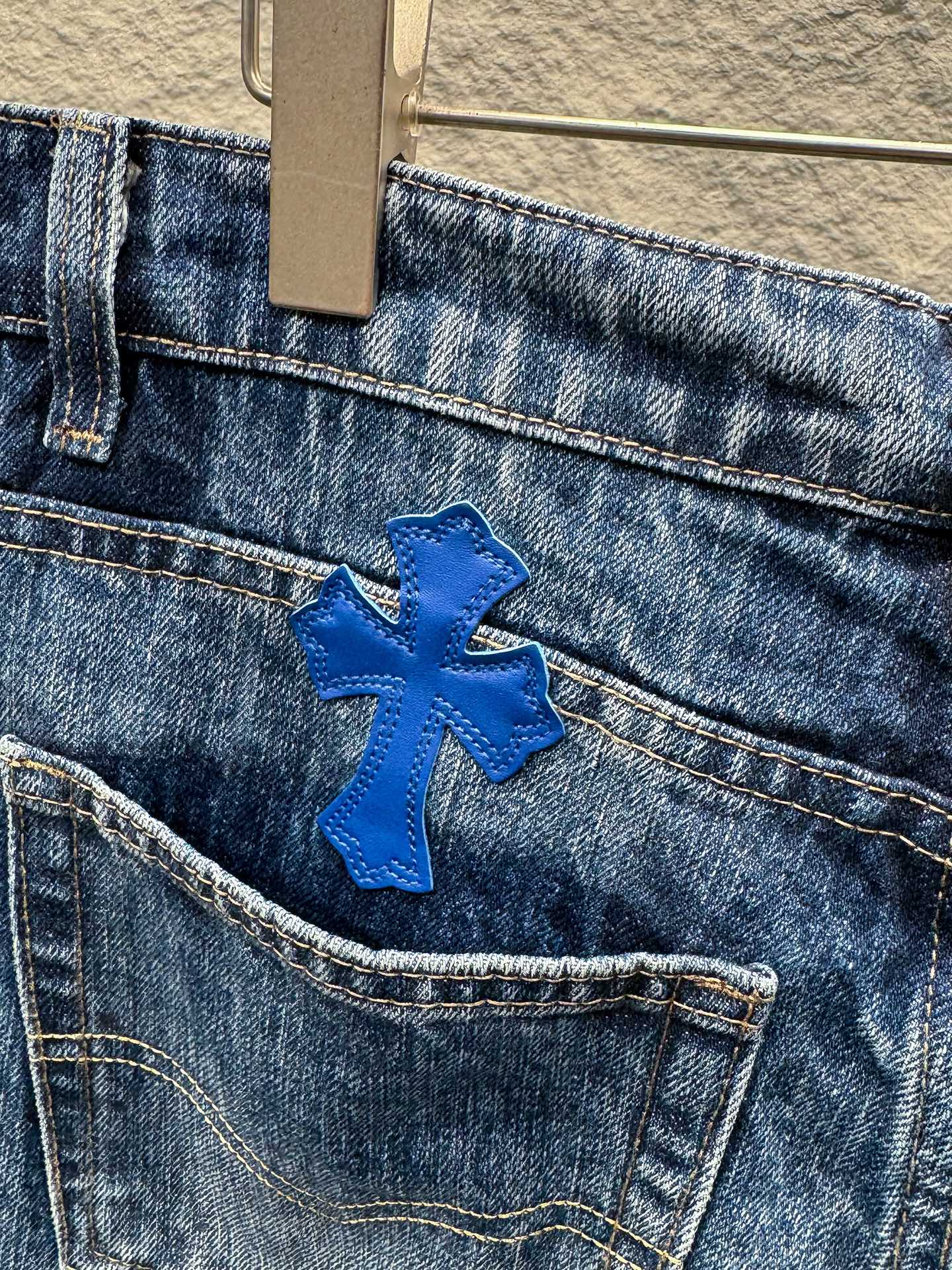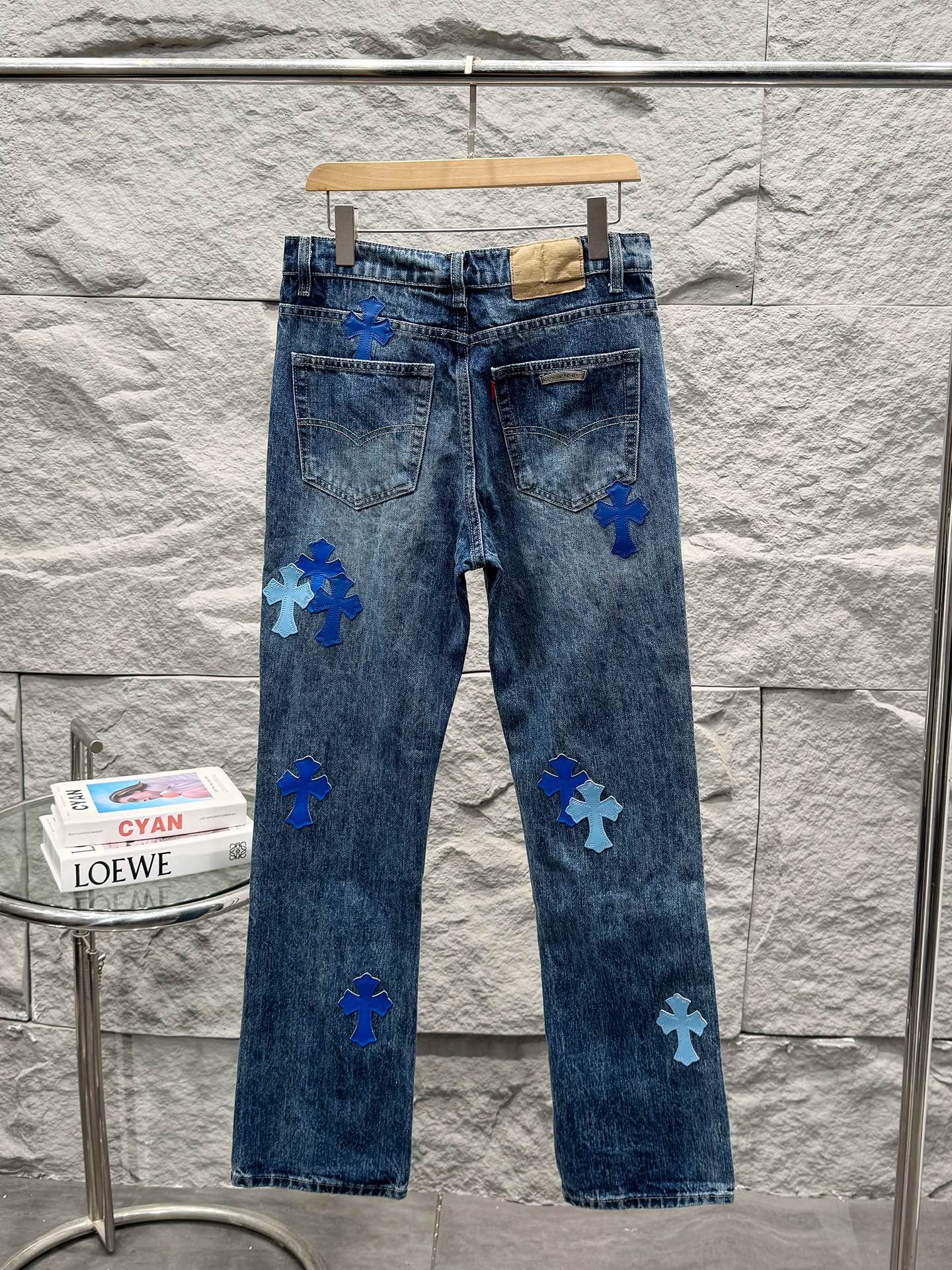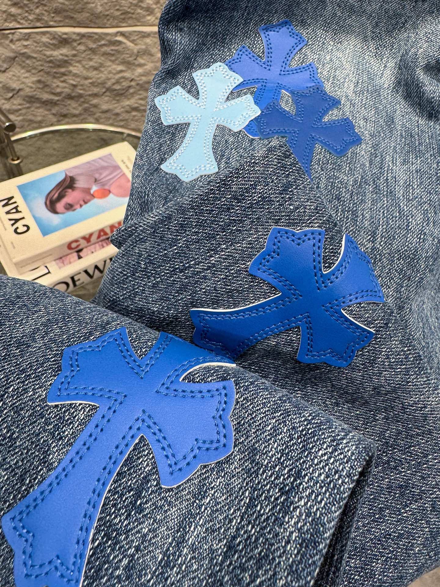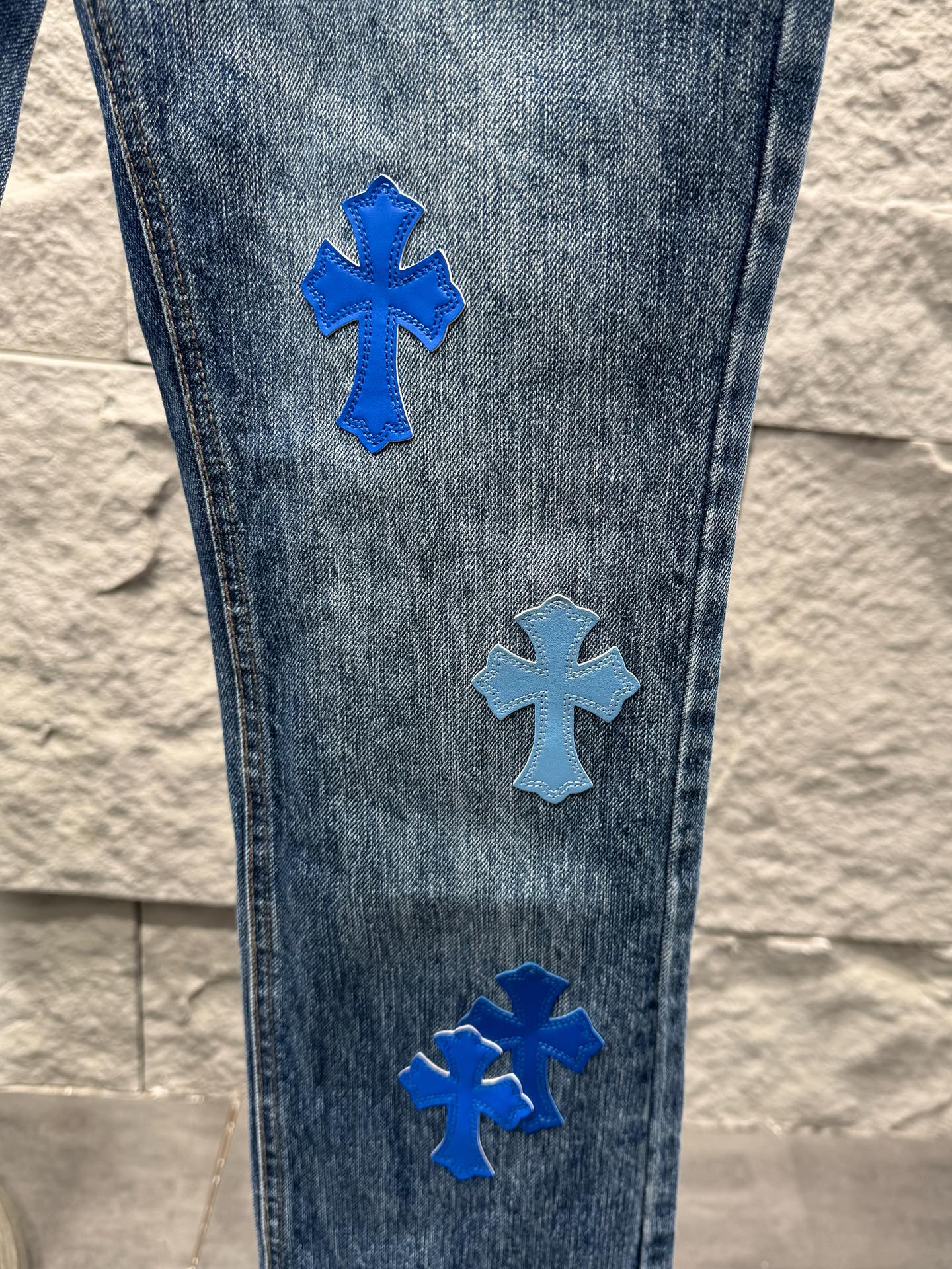 Chrome Hearts Miami limited edition blue jeans featuring cross patches. Stylish denim pants with intricate details and a comfortable fit.