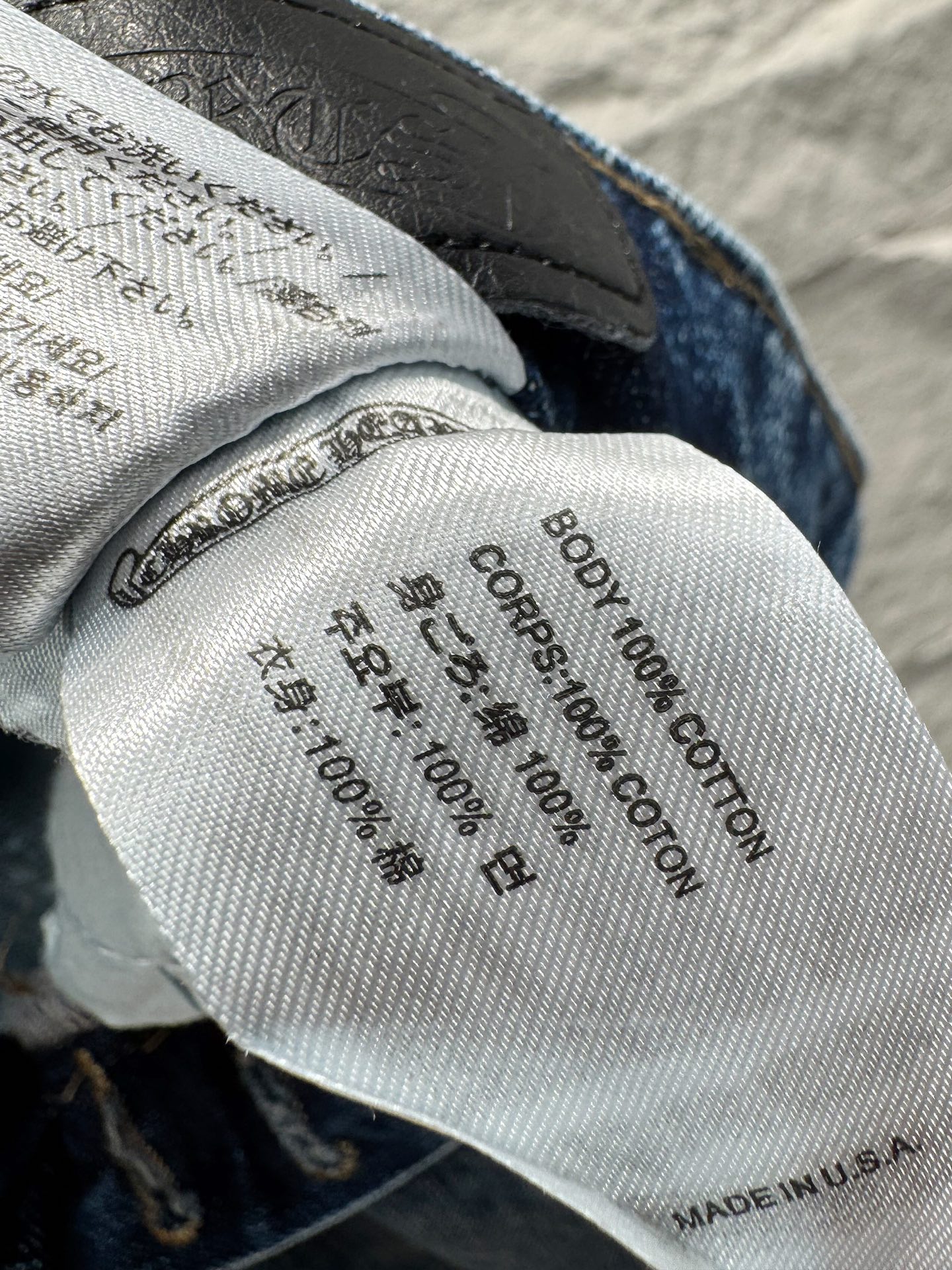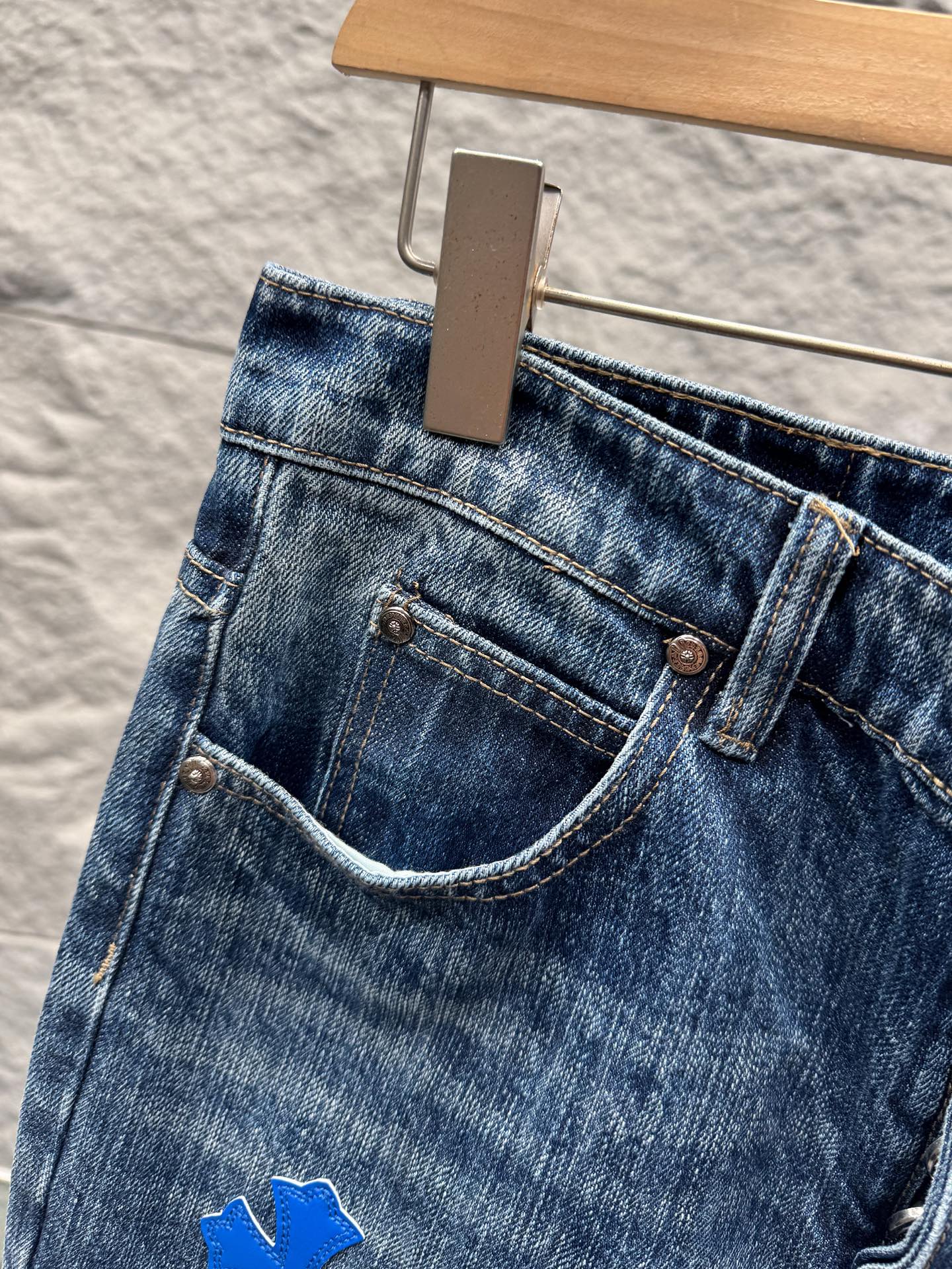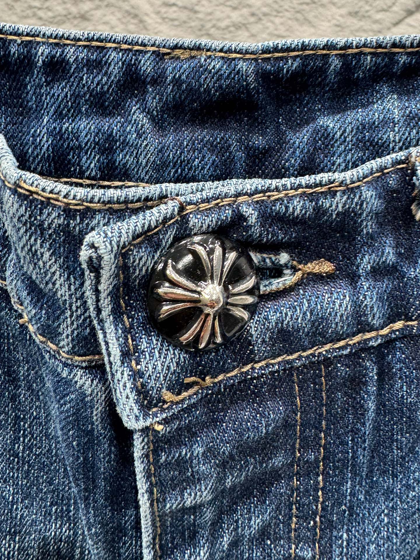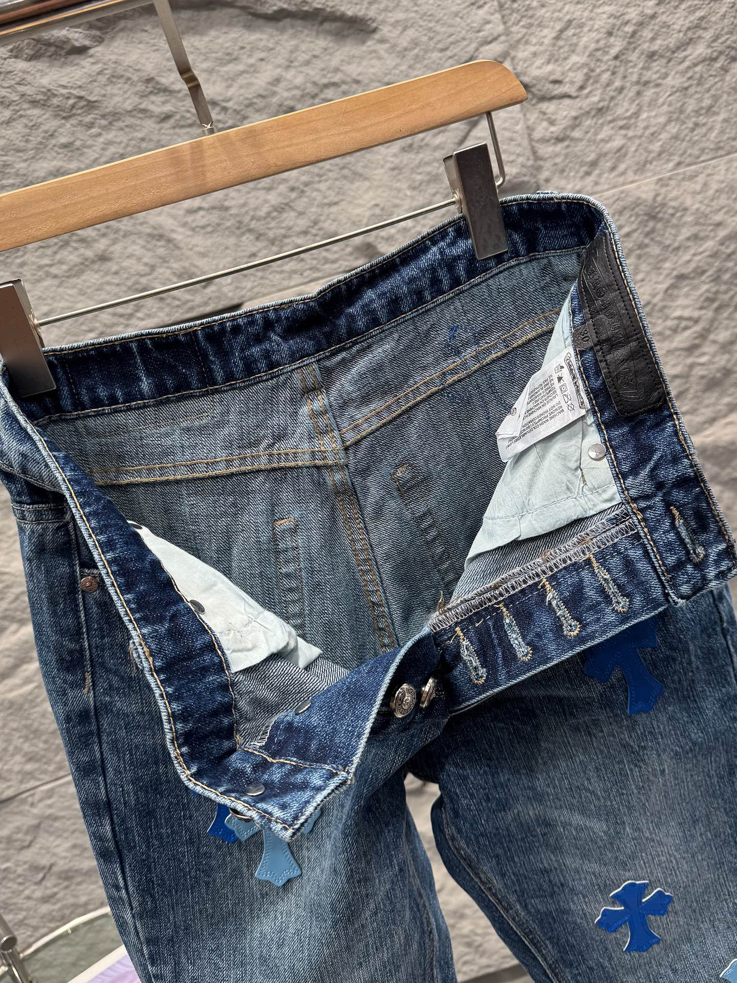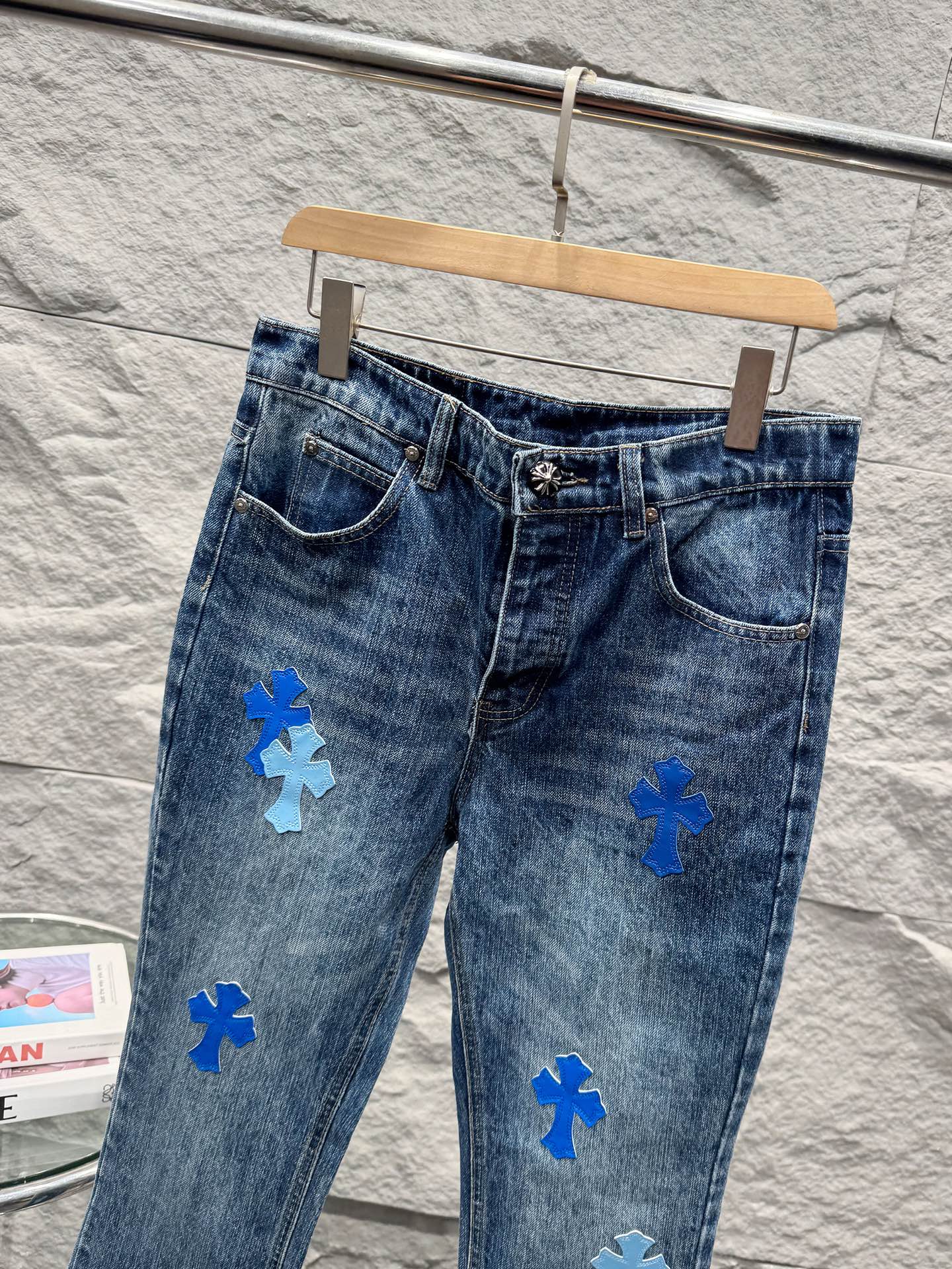 Chrome Hearts Miami limited edition blue jeans featuring cross patches. Stylish denim pants with intricate details and a comfortable fit.