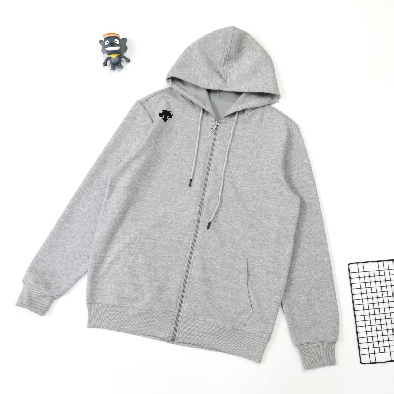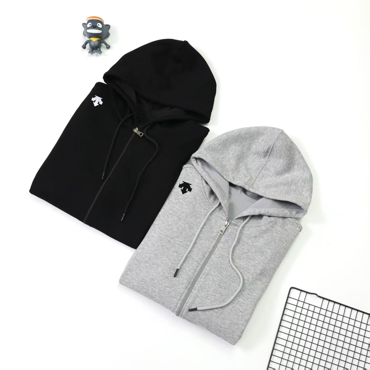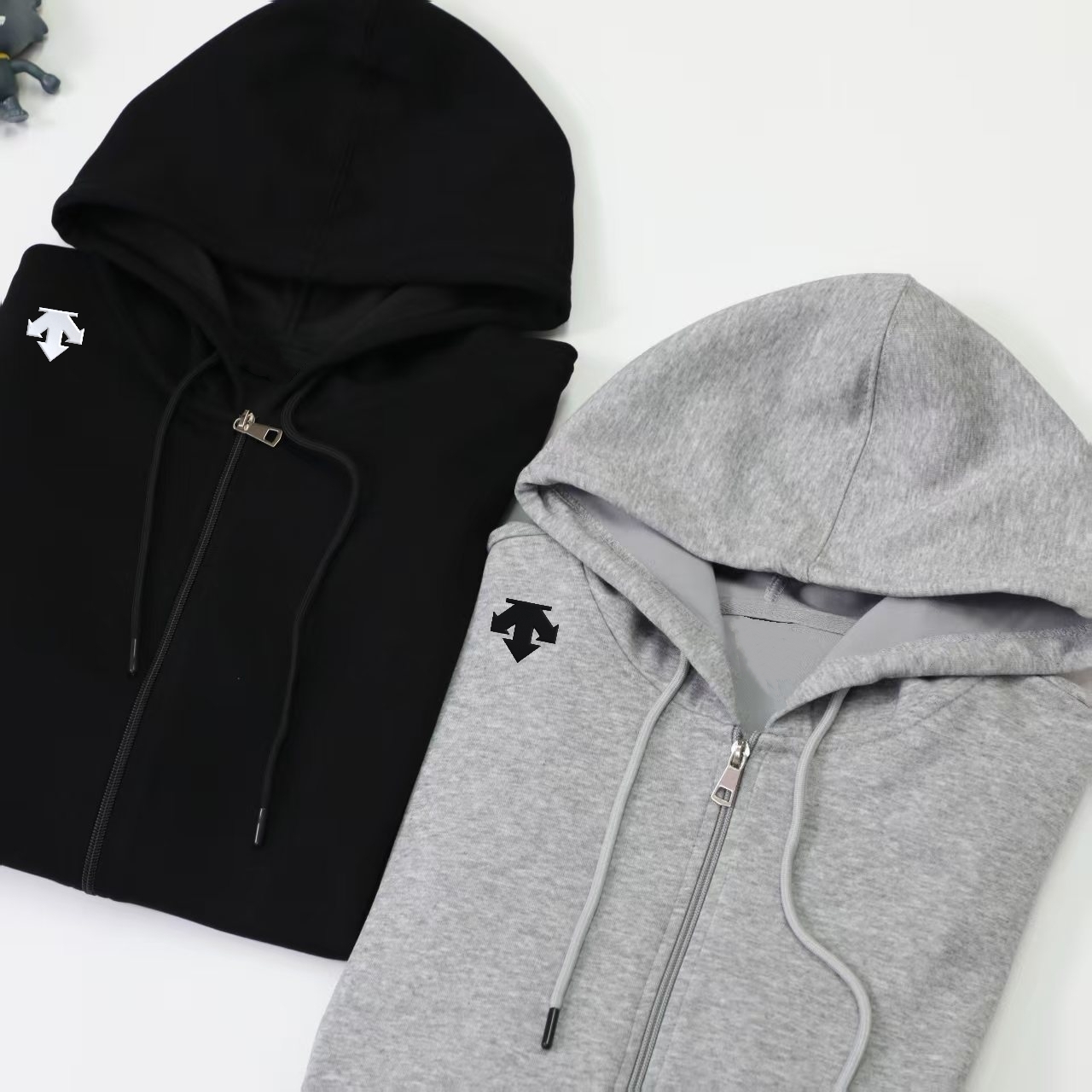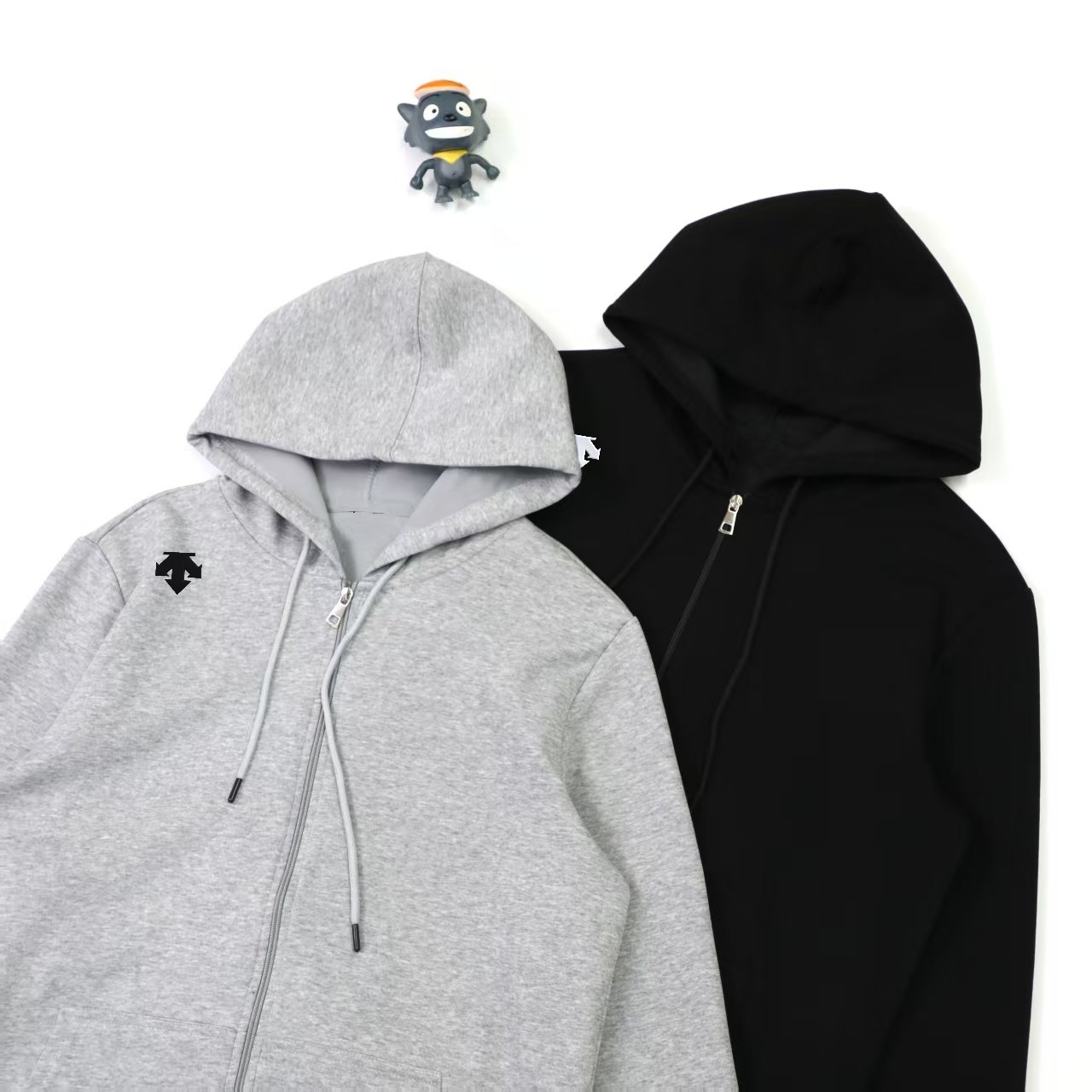 Elevate your casual style with this Descente full-zip hoodie, crafted from premium cotton blend for ultimate comfort and lasting wear. Available in black and grey.