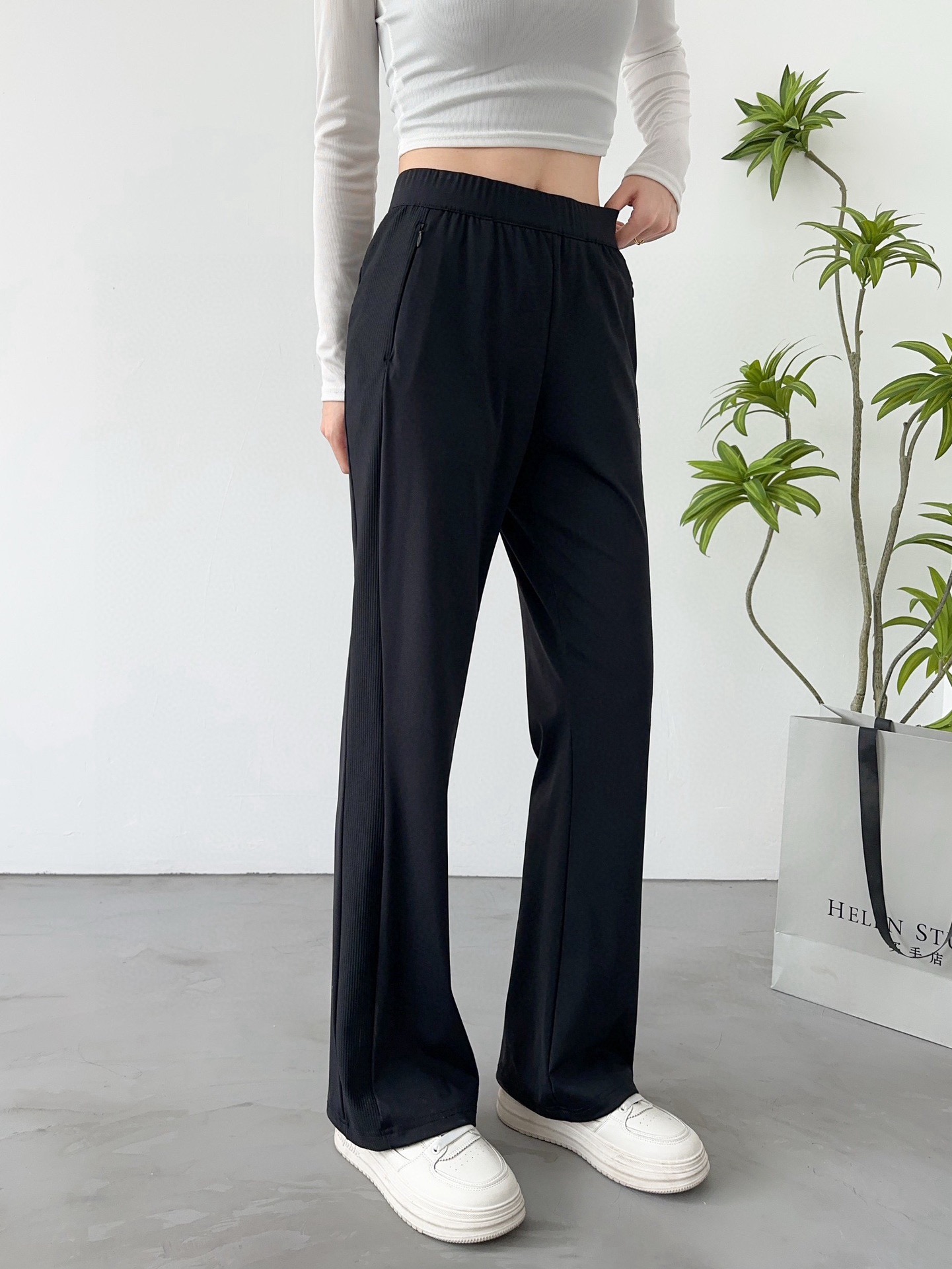 - Fit: Slim fit with flared legs.