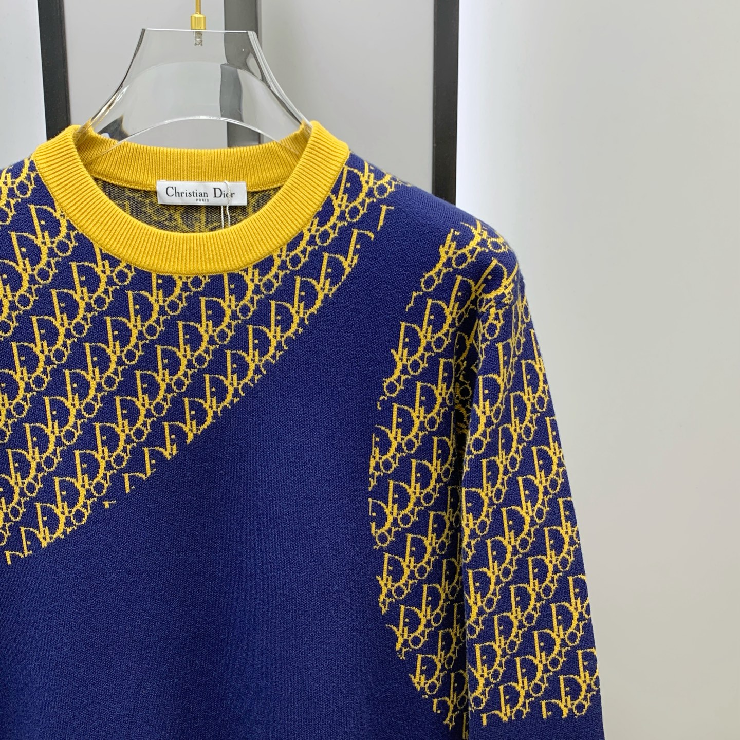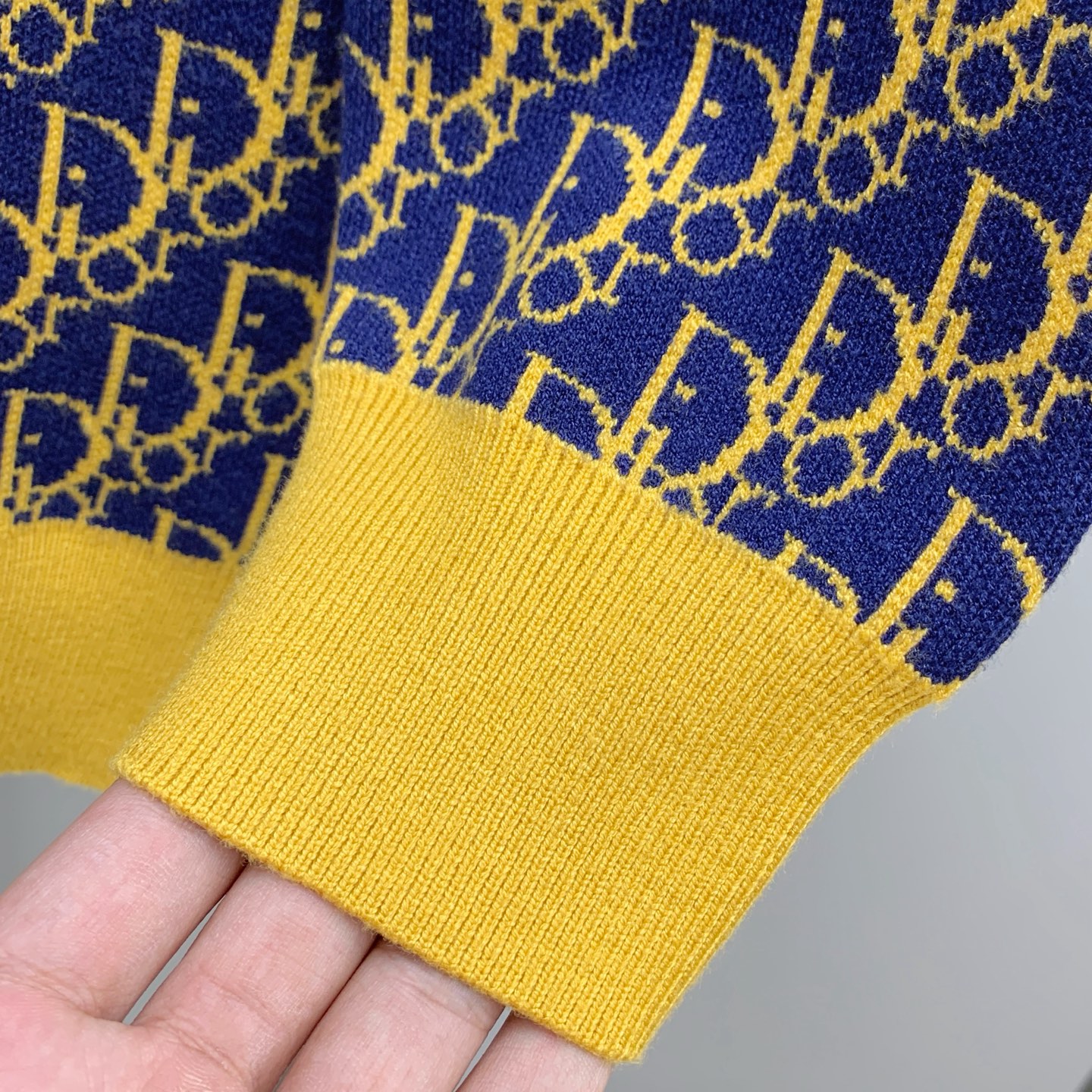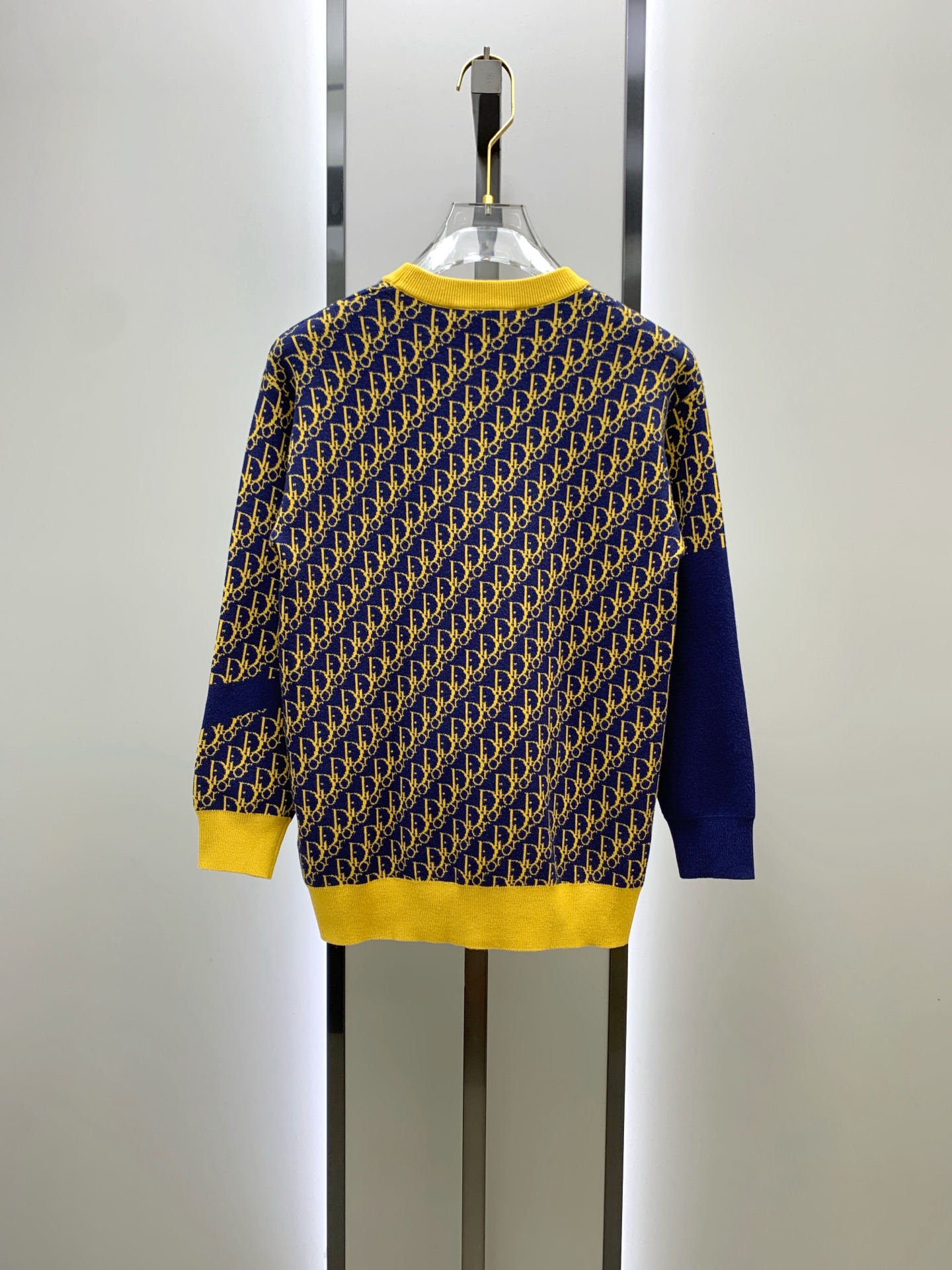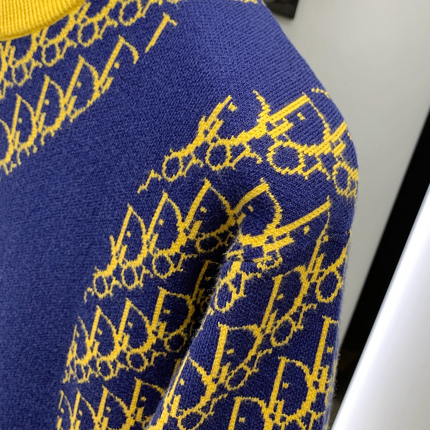 Elevate your style with this exquisite Dior wool blend sweater. Featuring the iconic Dior logo pattern in a striking blue and gold color scheme, this sweater is the epitome of luxury and sophistication.