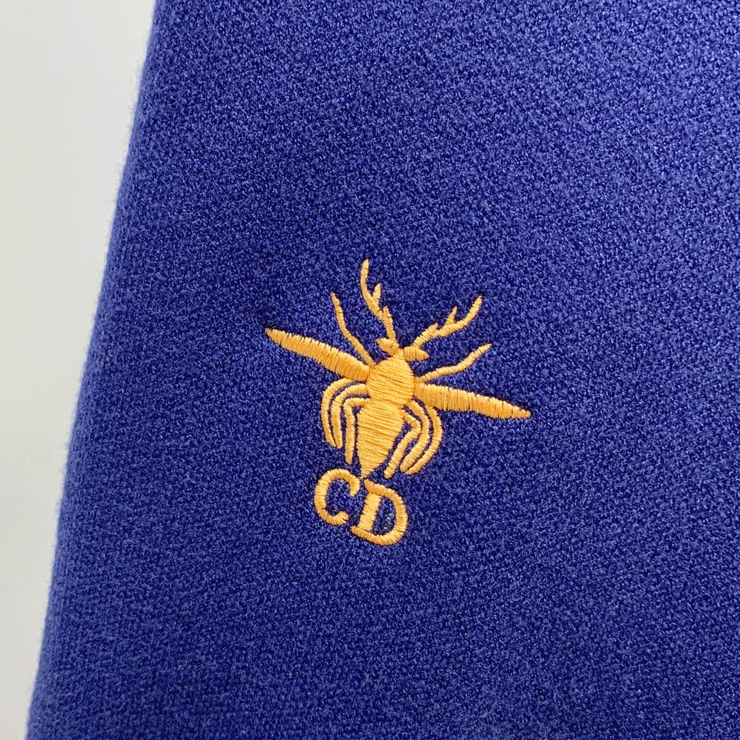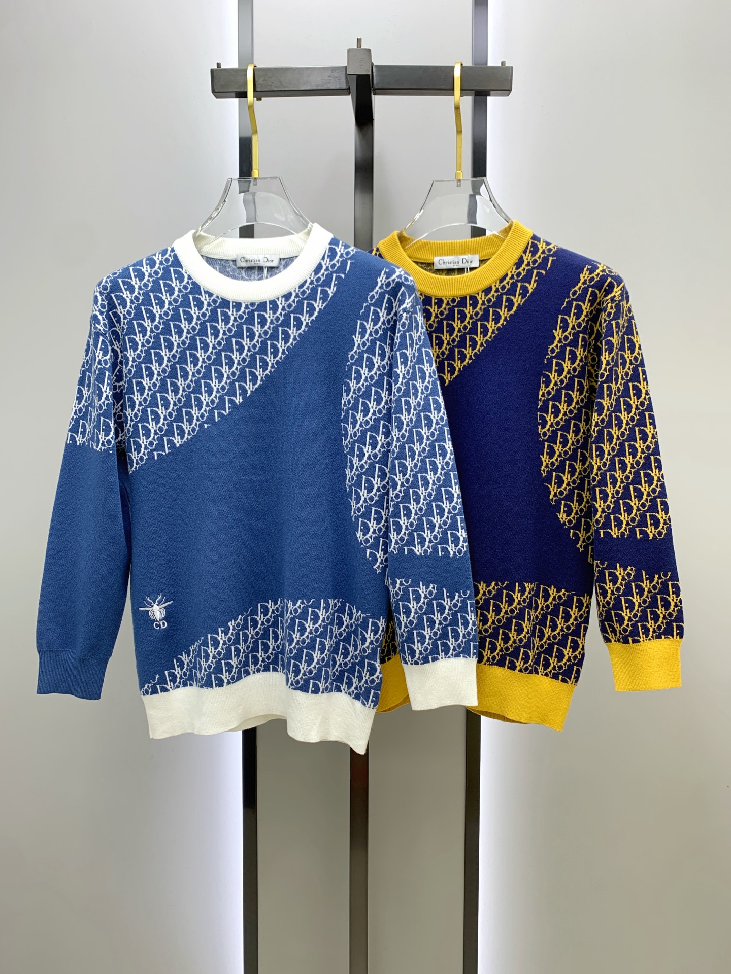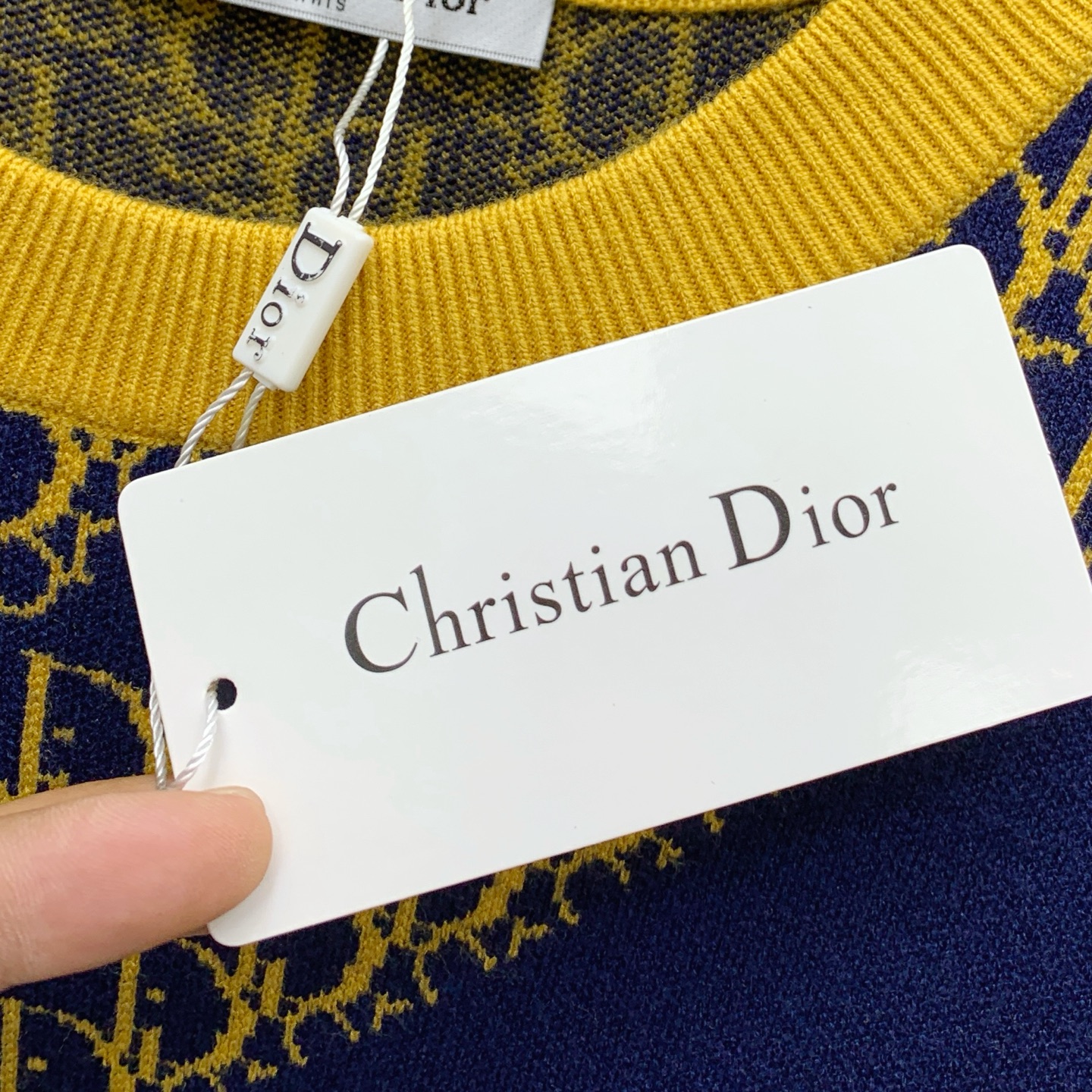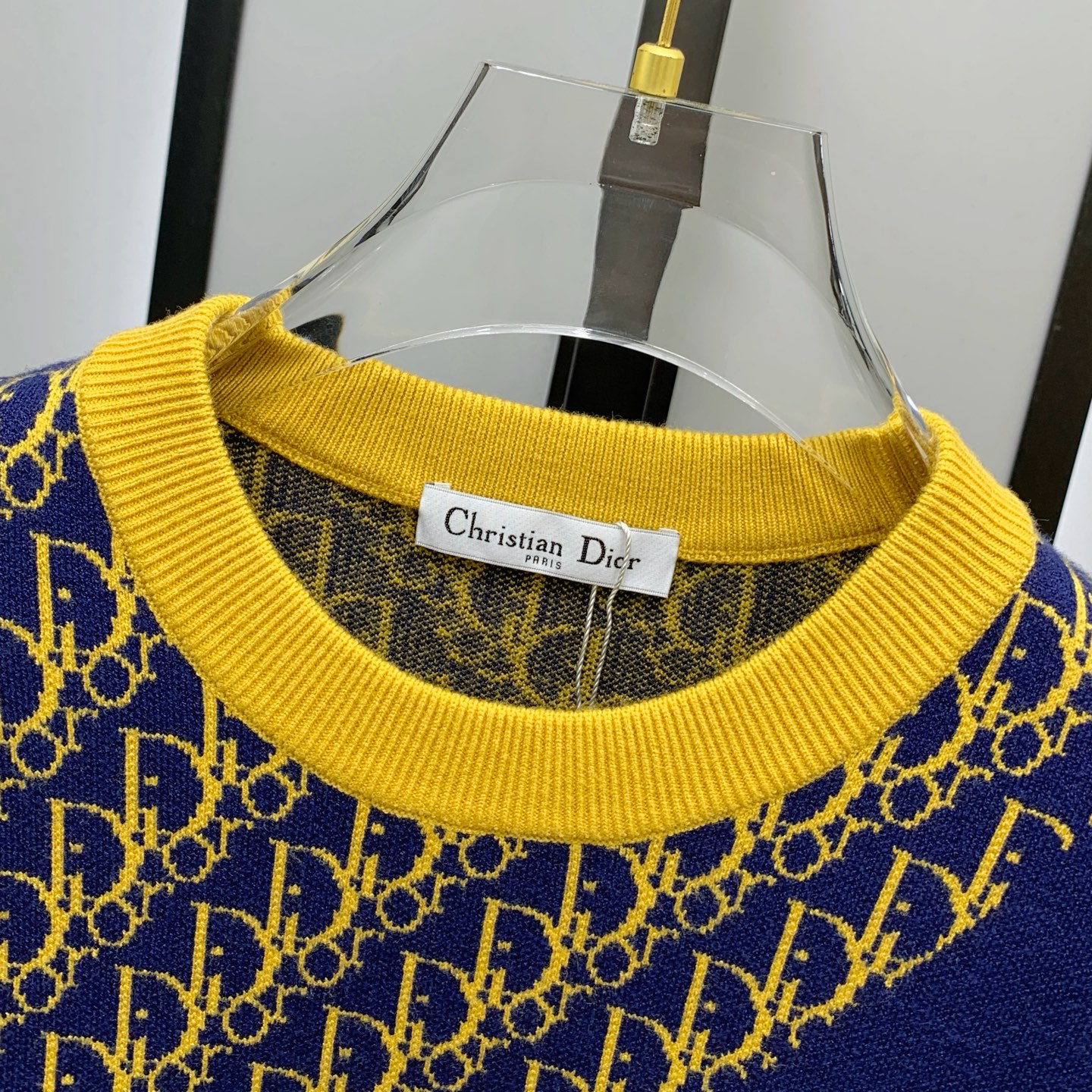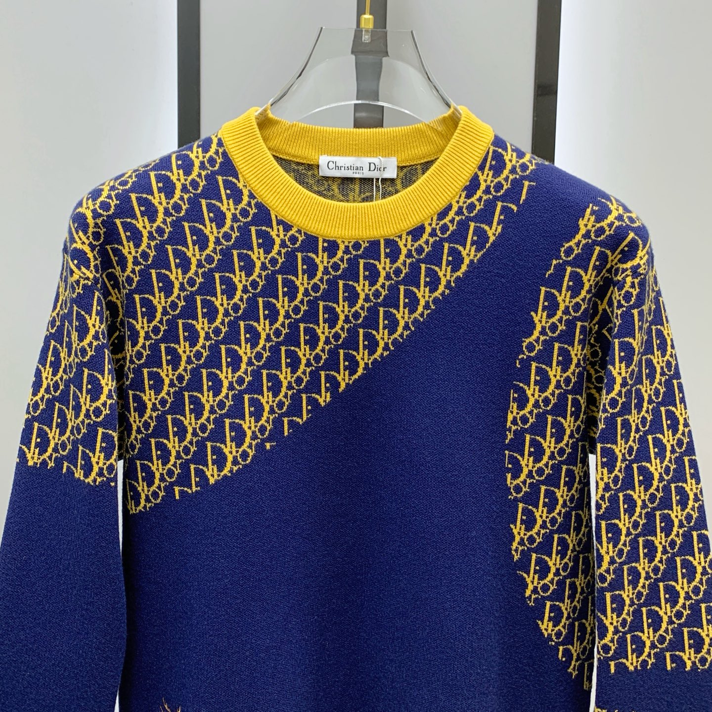 Elevate your style with this exquisite Dior wool blend sweater. Featuring the iconic Dior logo pattern in a striking blue and gold color scheme, this sweater is the epitome of luxury and sophistication.