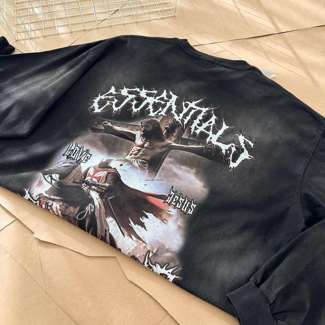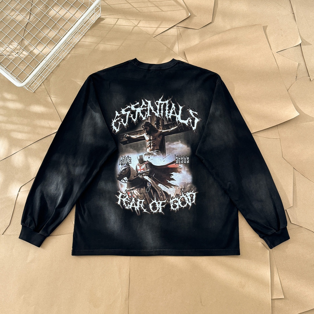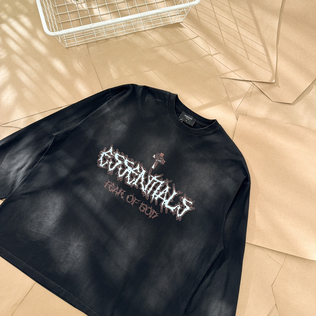 This Essentials Fear of God long sleeve t-shirt combines high-street fashion with a vintage aesthetic. The washed black color and graphic design make it a standout piece for any wardrobe.