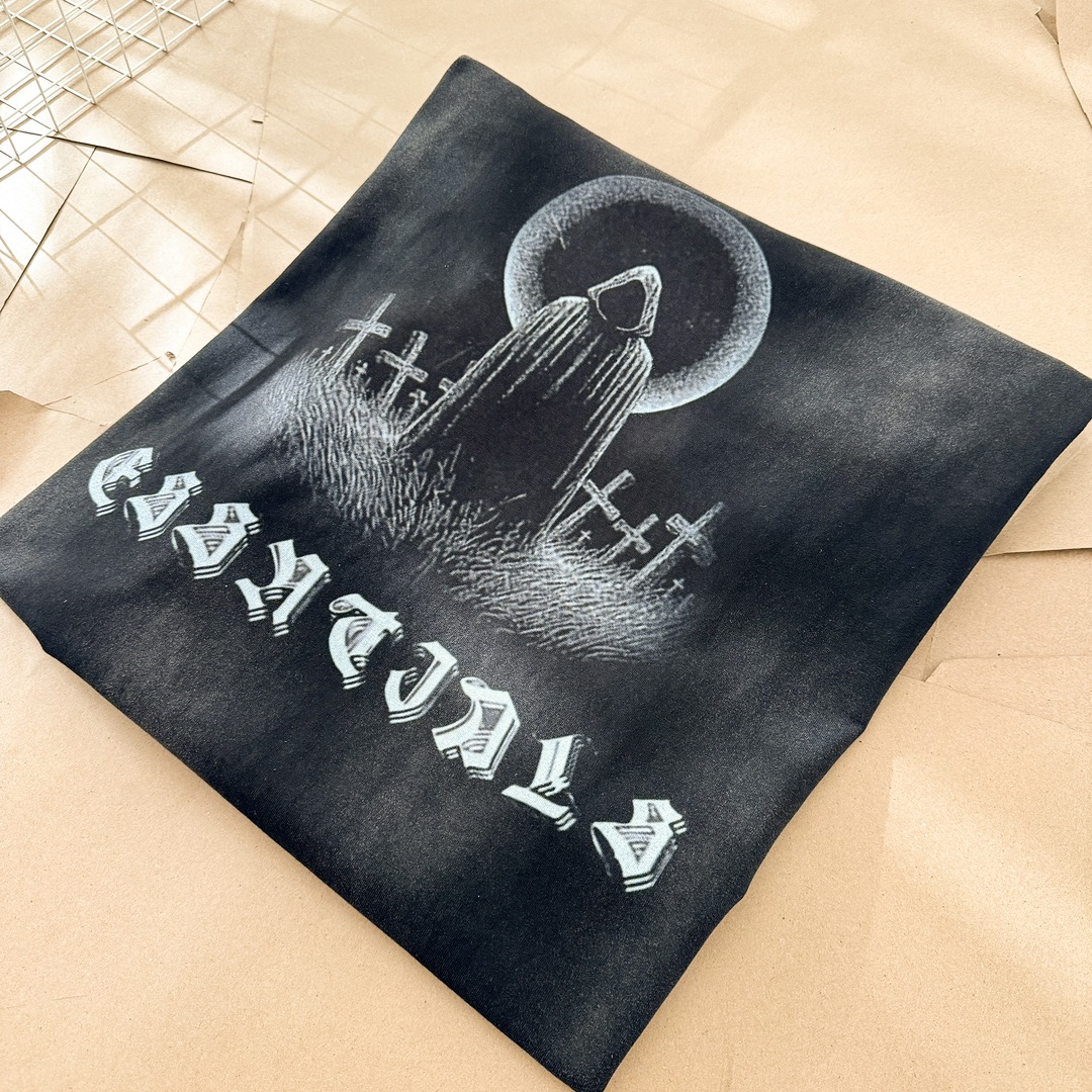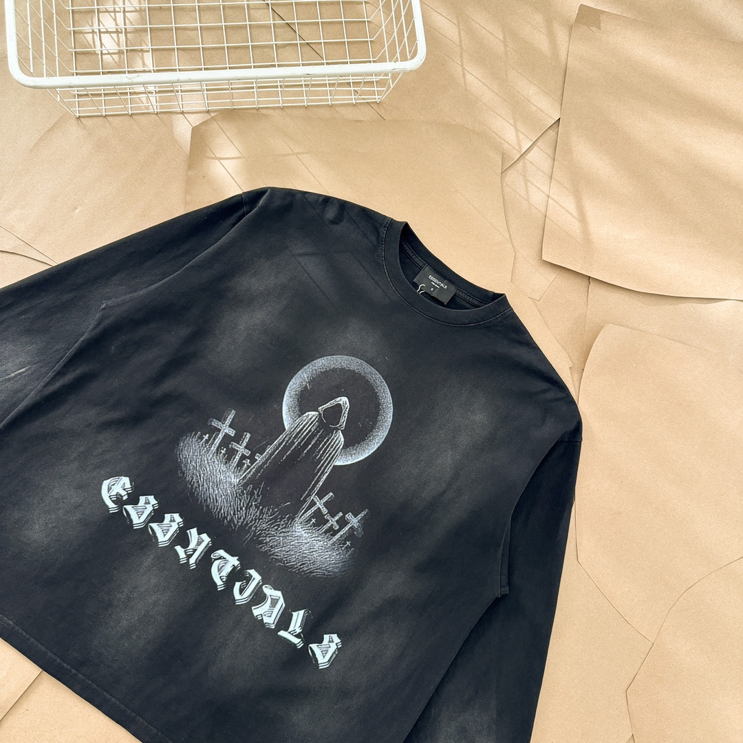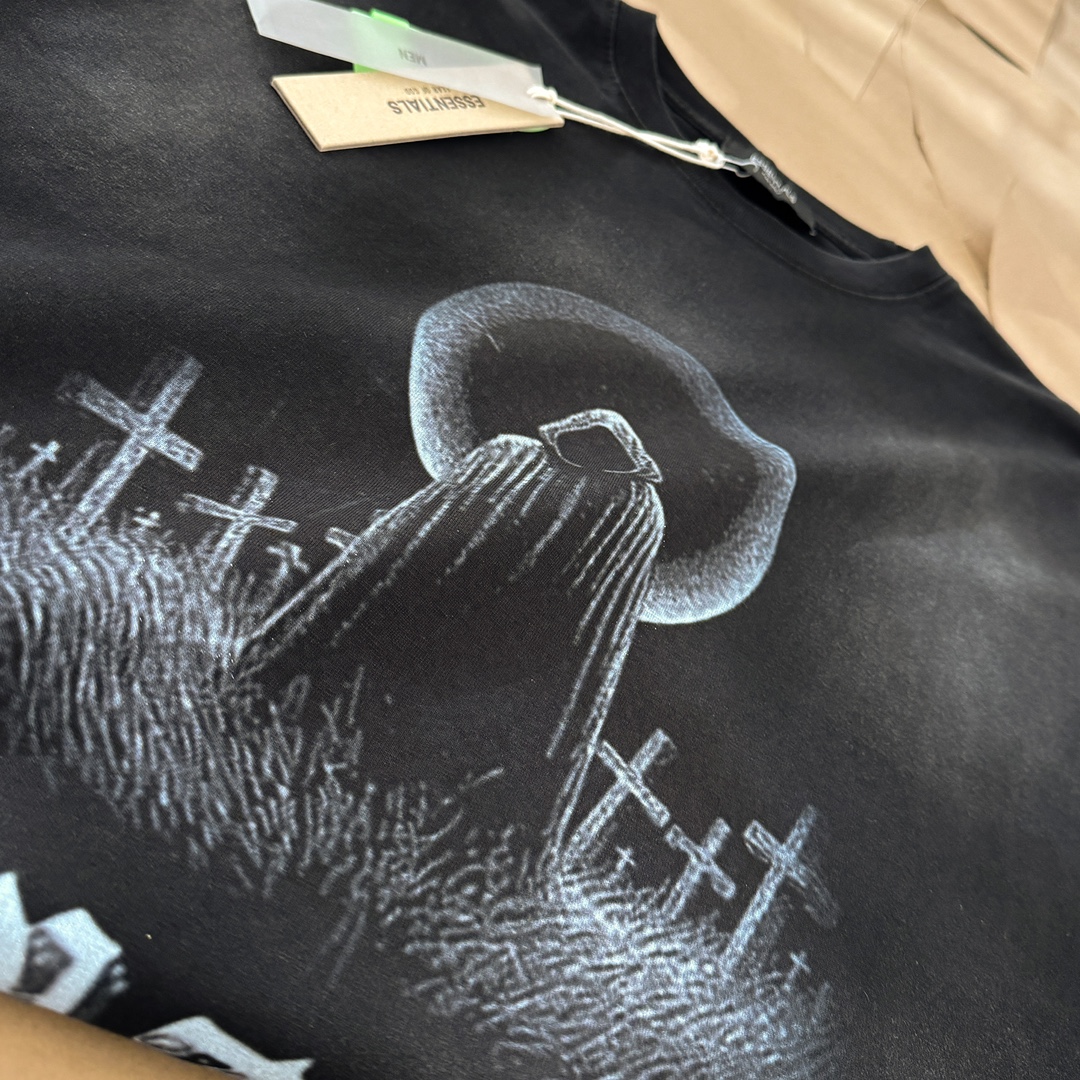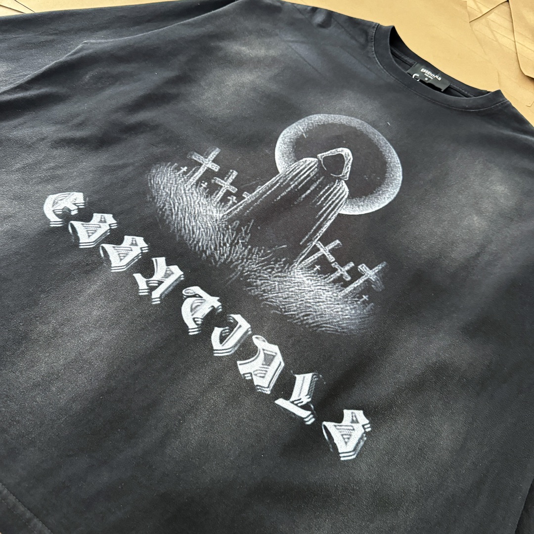 Vintage washed black long sleeve tee featuring a grim reaper graphic and the Essentials logo. A comfortable, stylish addition to your wardrobe.