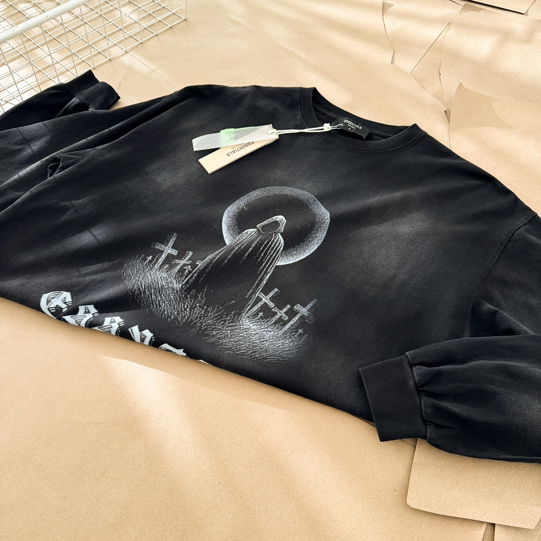 Embrace the edgy and unique style of the Fear of God ESSENTIALS line with this vintage-inspired long sleeve t-shirt. The dark aesthetic and distinctive graphic make it a standout piece for any wardrobe.