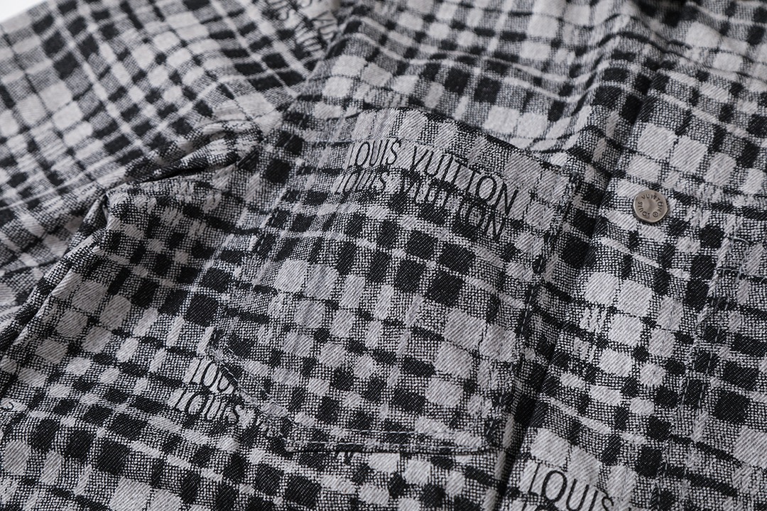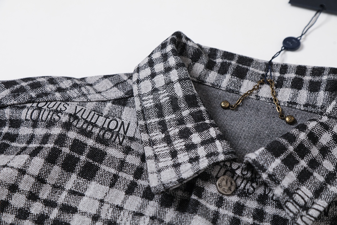 Elevate your casual wardrobe with this Louis Vuitton denim jacket. Featuring a stylish gray checkered print, it's perfect for everyday wear.