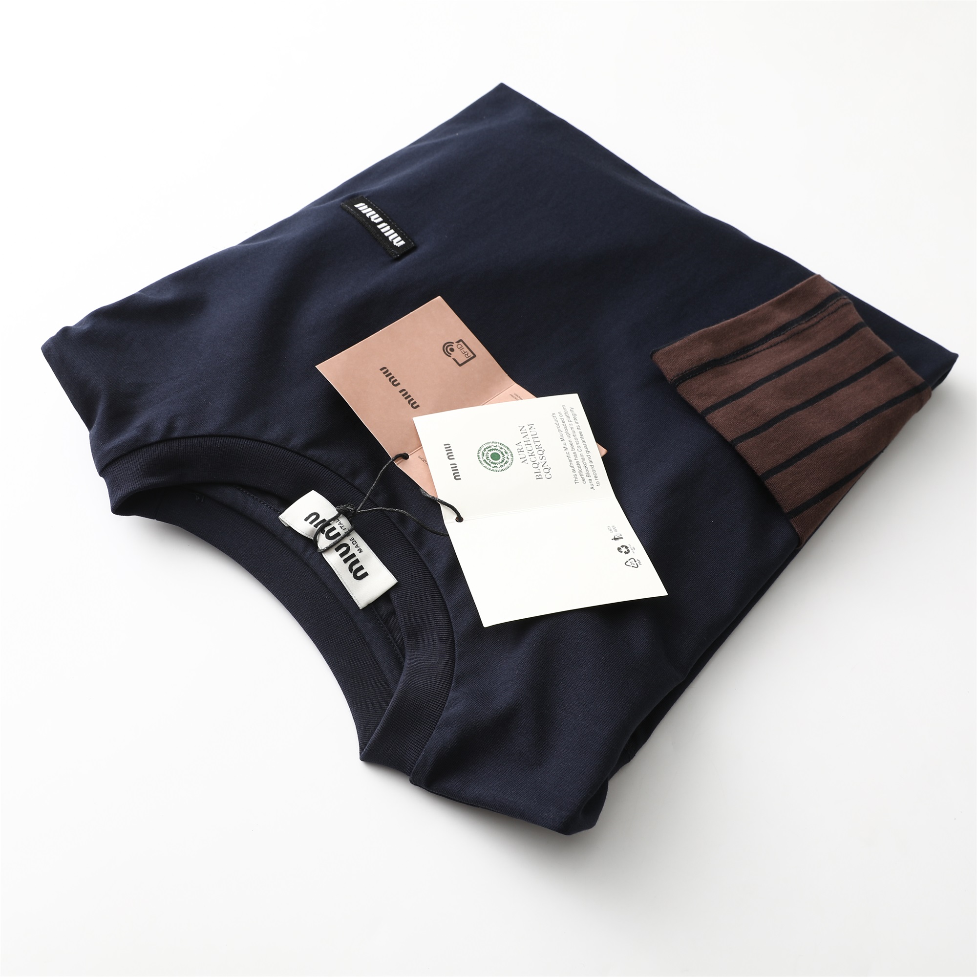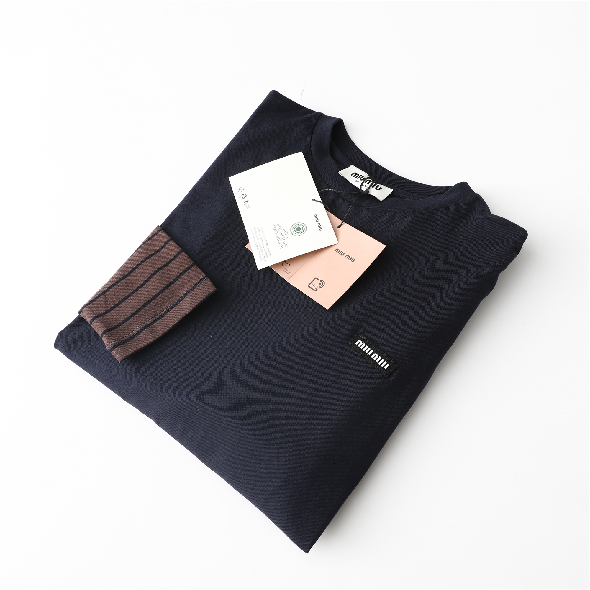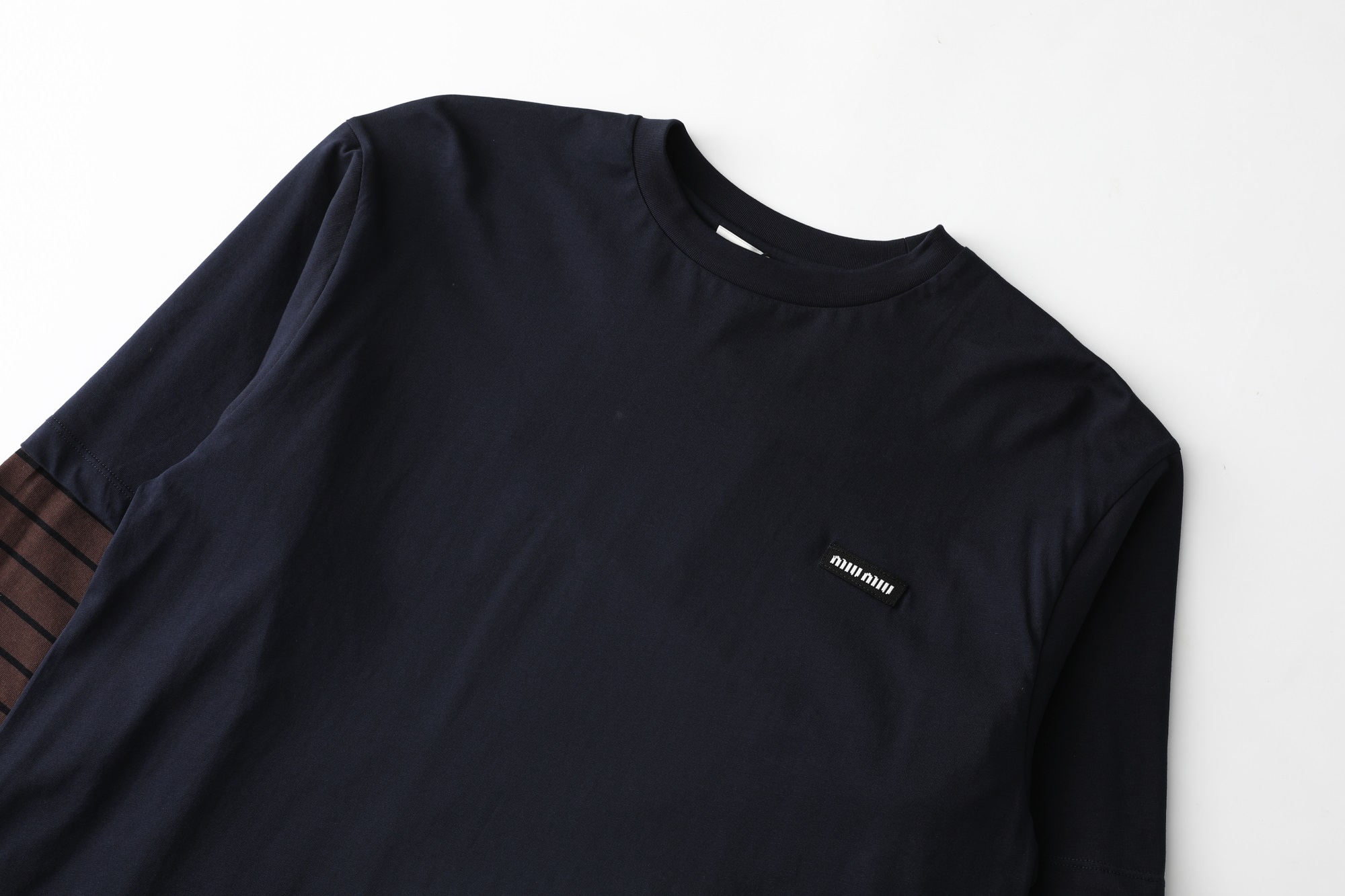 Miu Miu Two-Piece Effect Navy Long Sleeve T-Shirt with Striped Sleeves