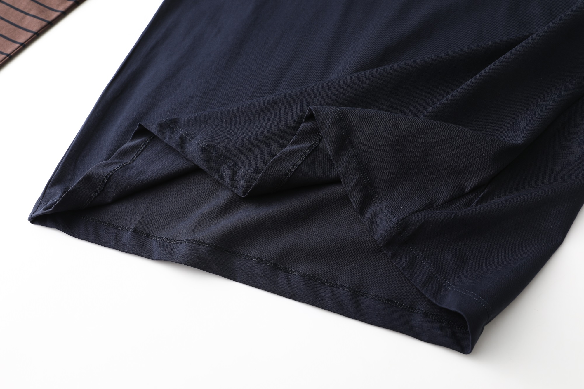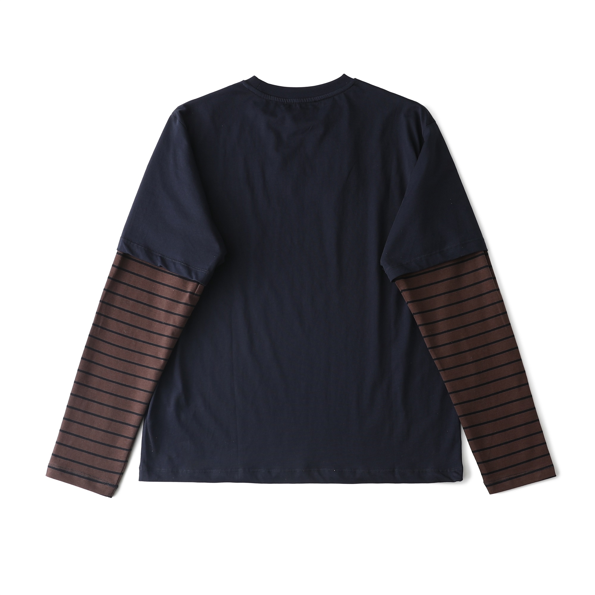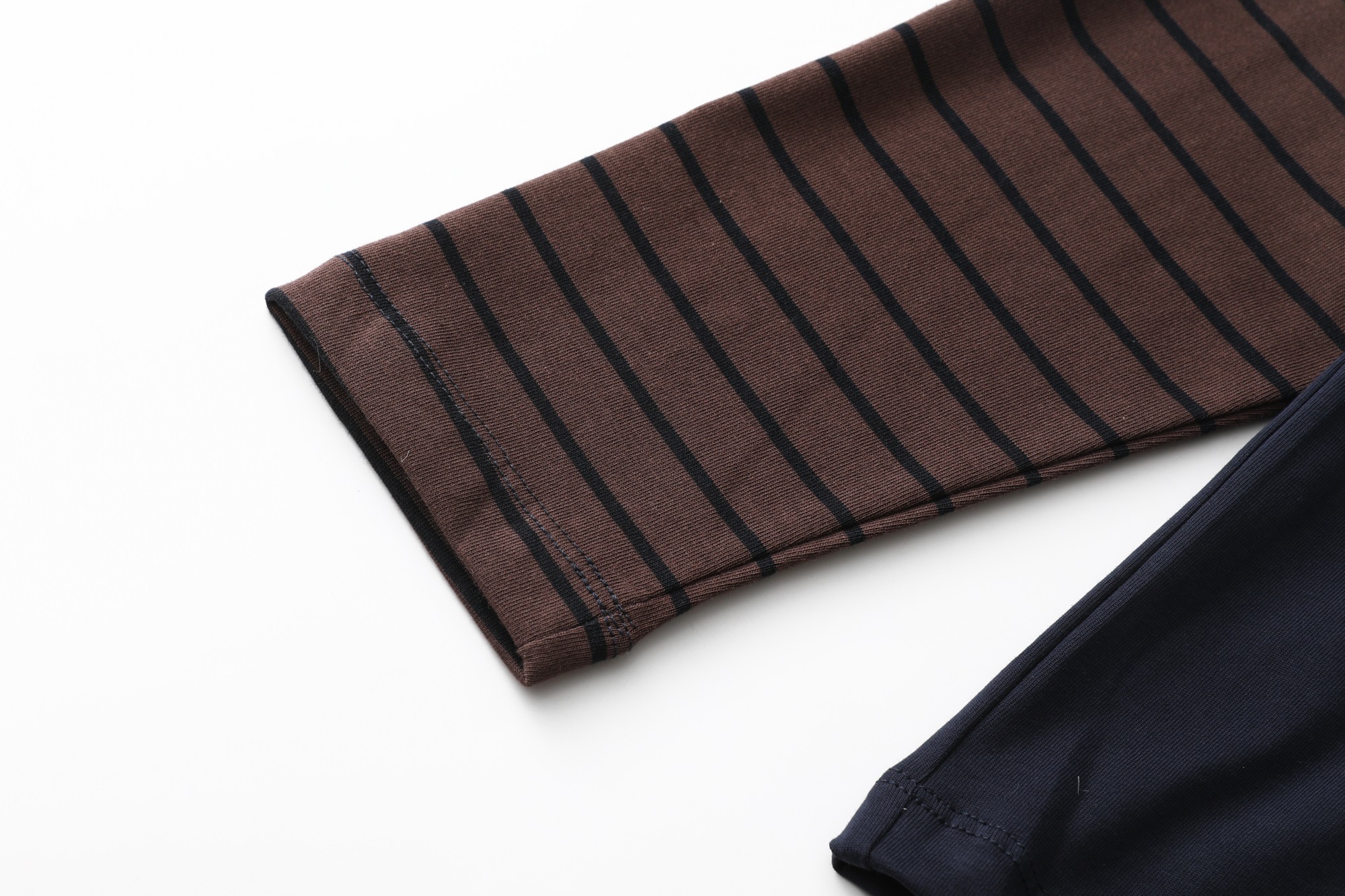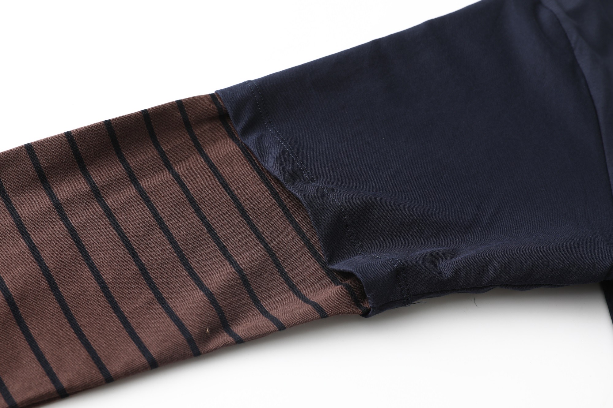 Design: Features a navy blue main body complemented by black and brown striped sleeves, creating a layered appearance.