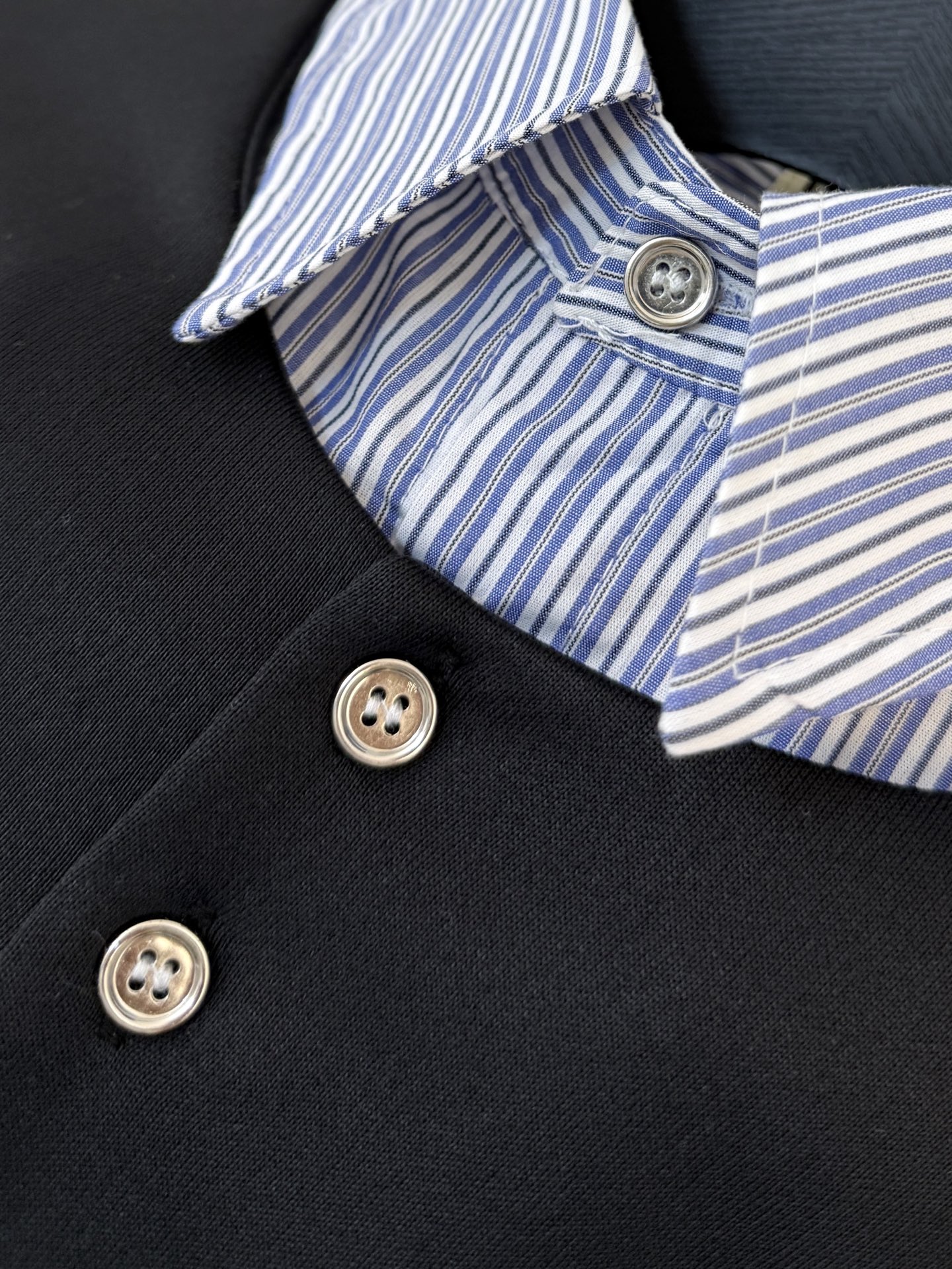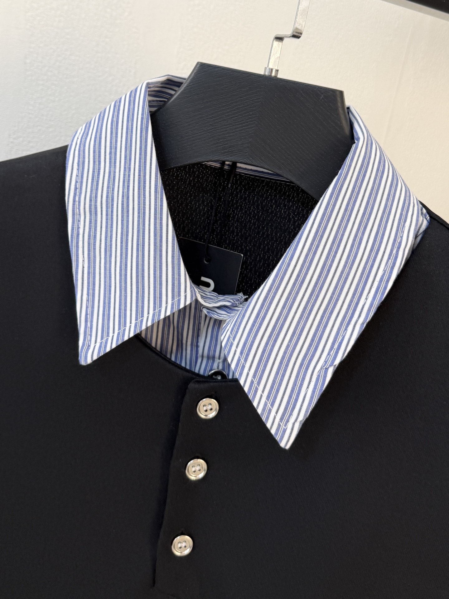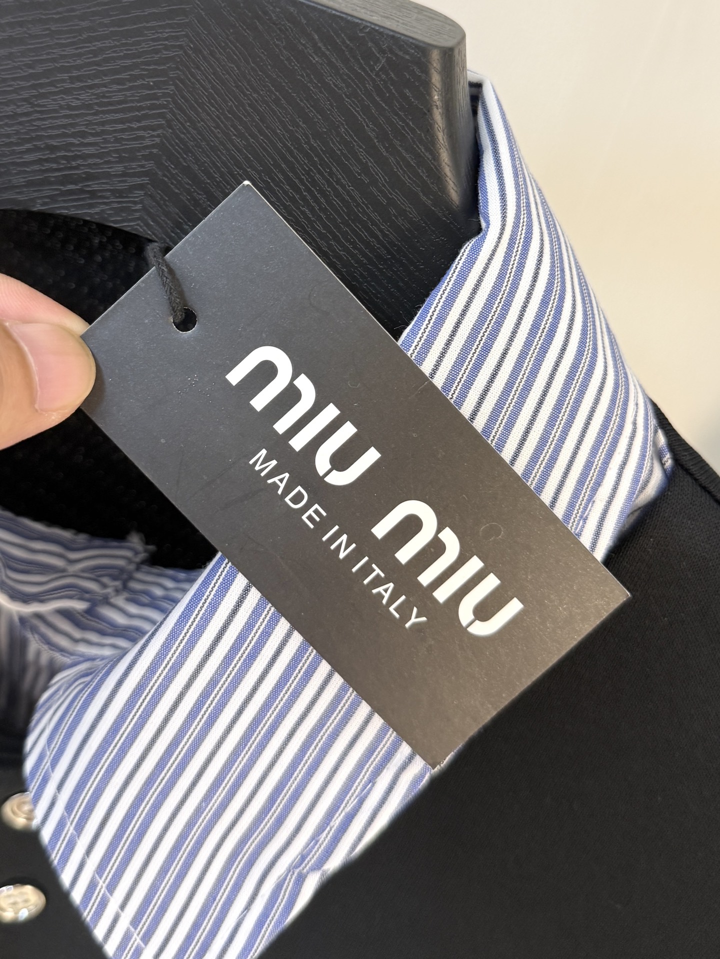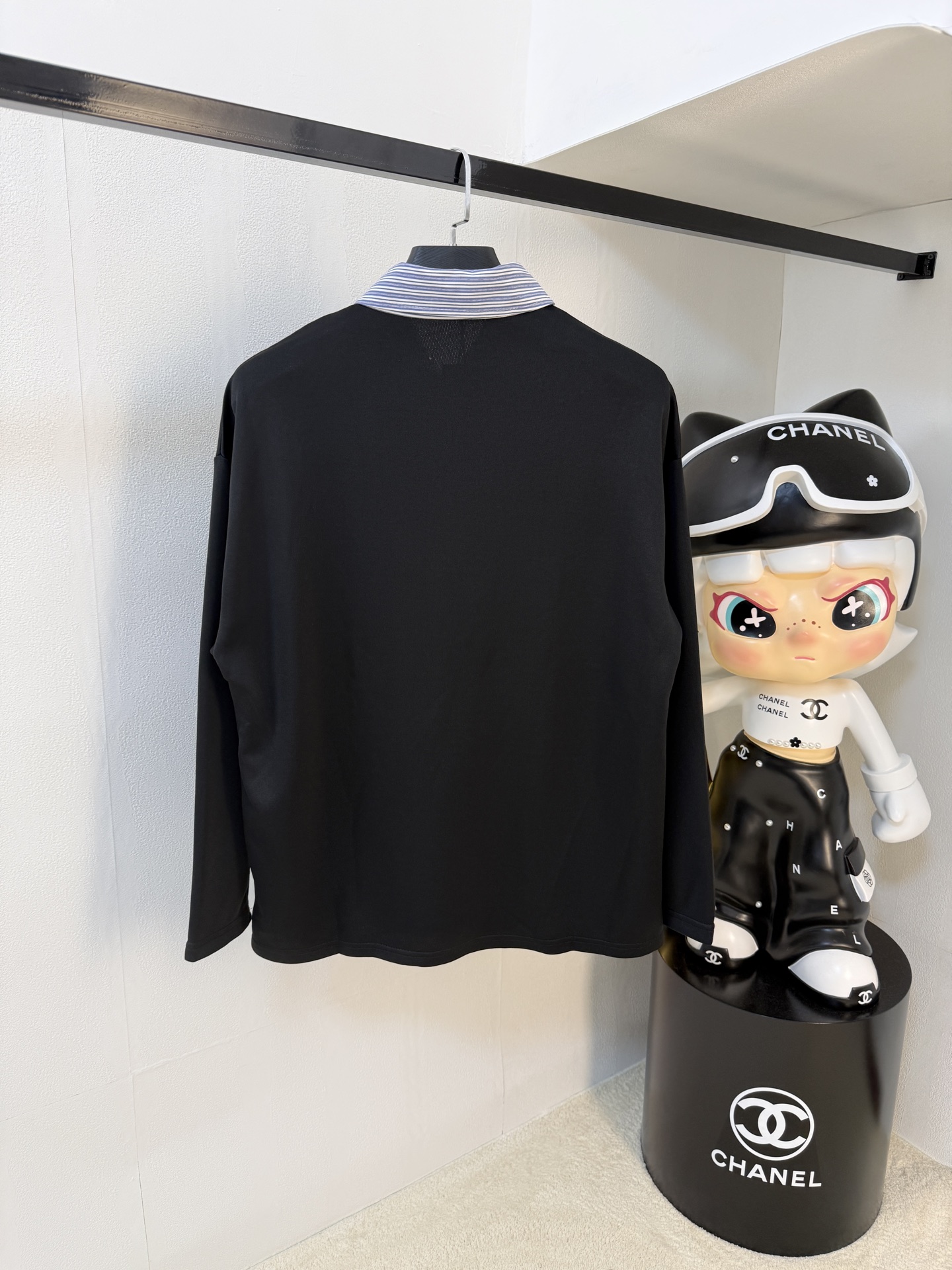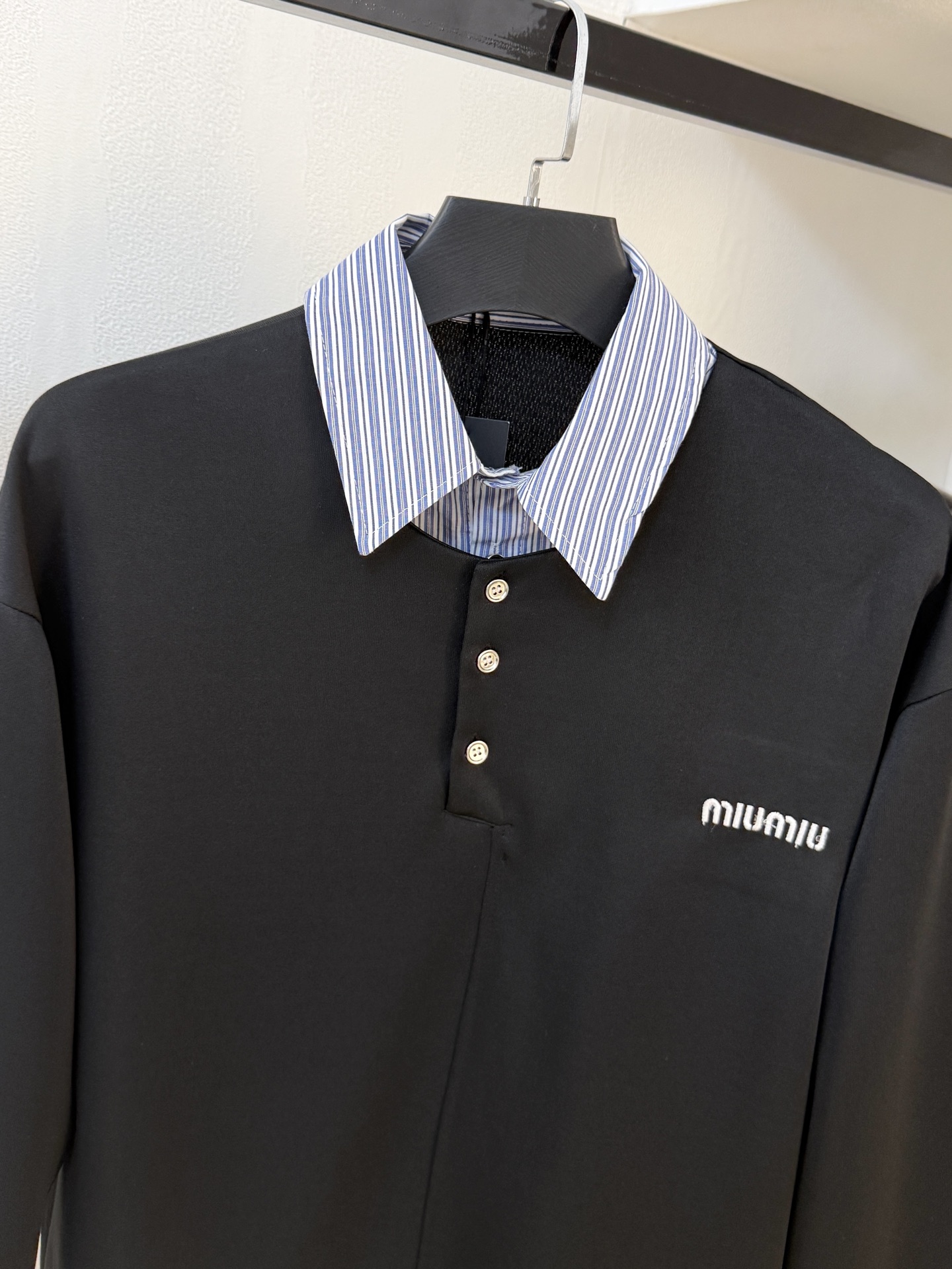 Elevate your style with this Miu Miu black long sleeve polo shirt. Features a sophisticated striped collar and exquisite detailing. Perfect for a chic, versatile look.