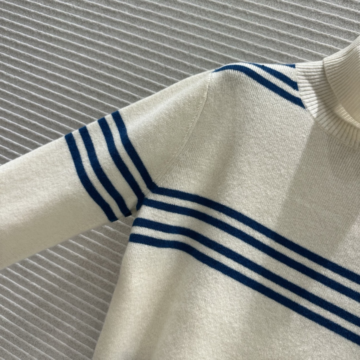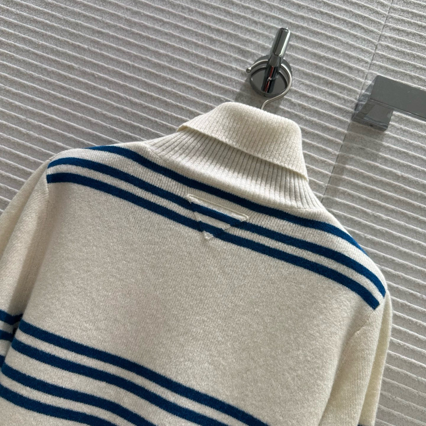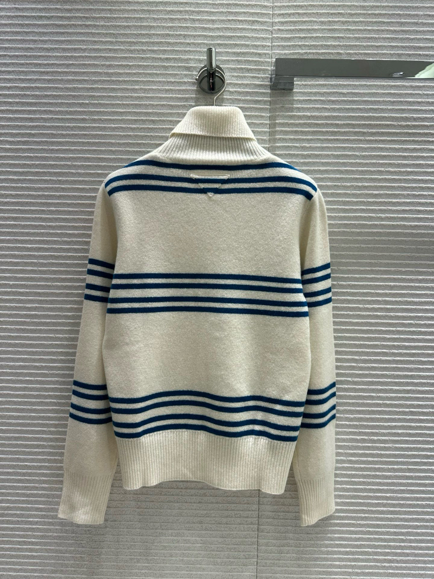 Prada Women's White Turtleneck Wool Sweater with Blue Stripe Design
