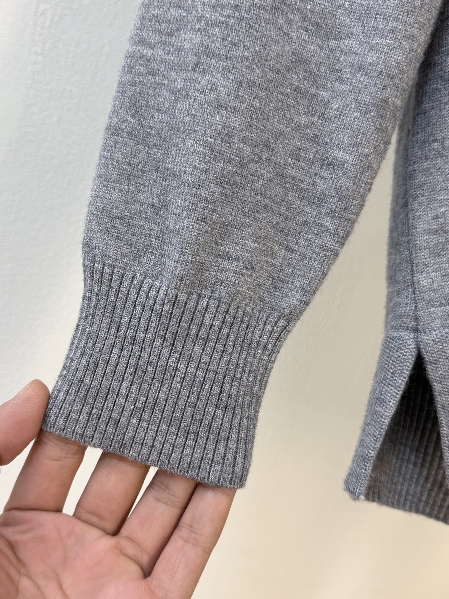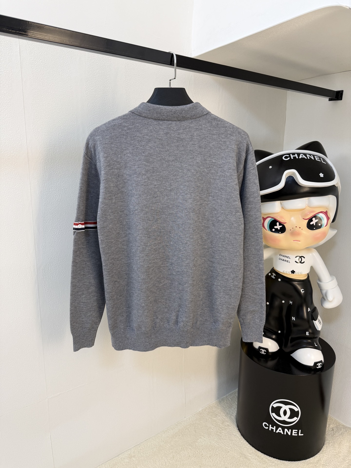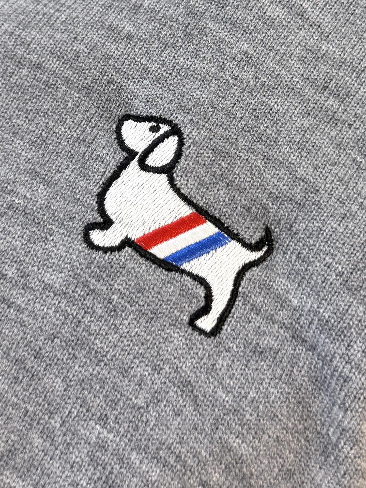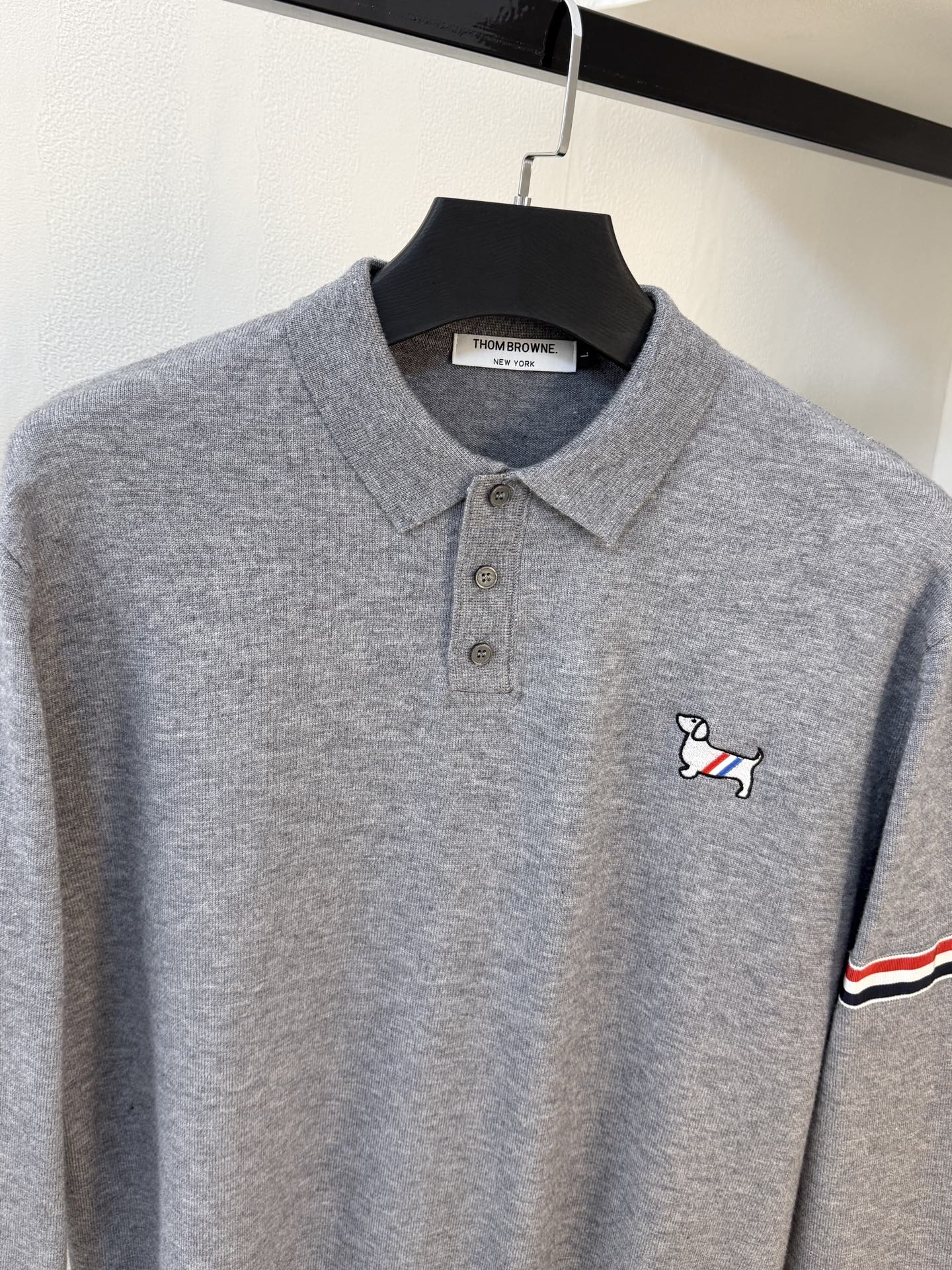 Thom Browne Grey Knit Polo Shirt with Dog Icon and Striped Sleeve Detail