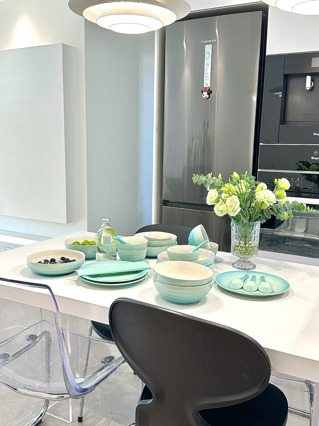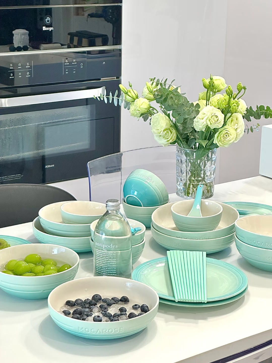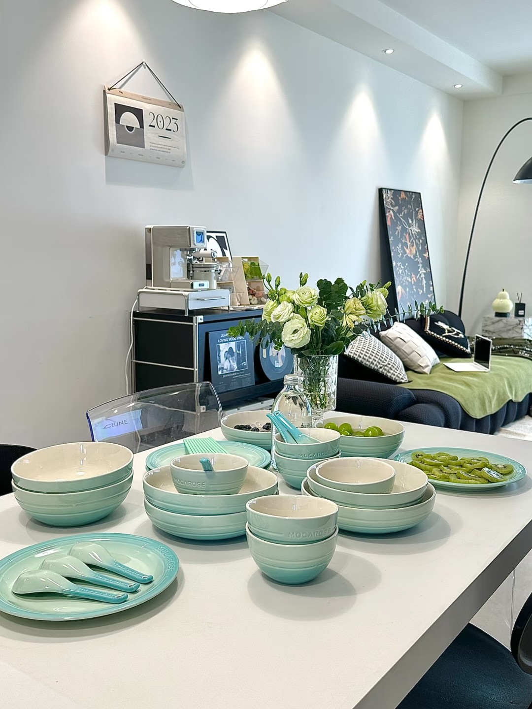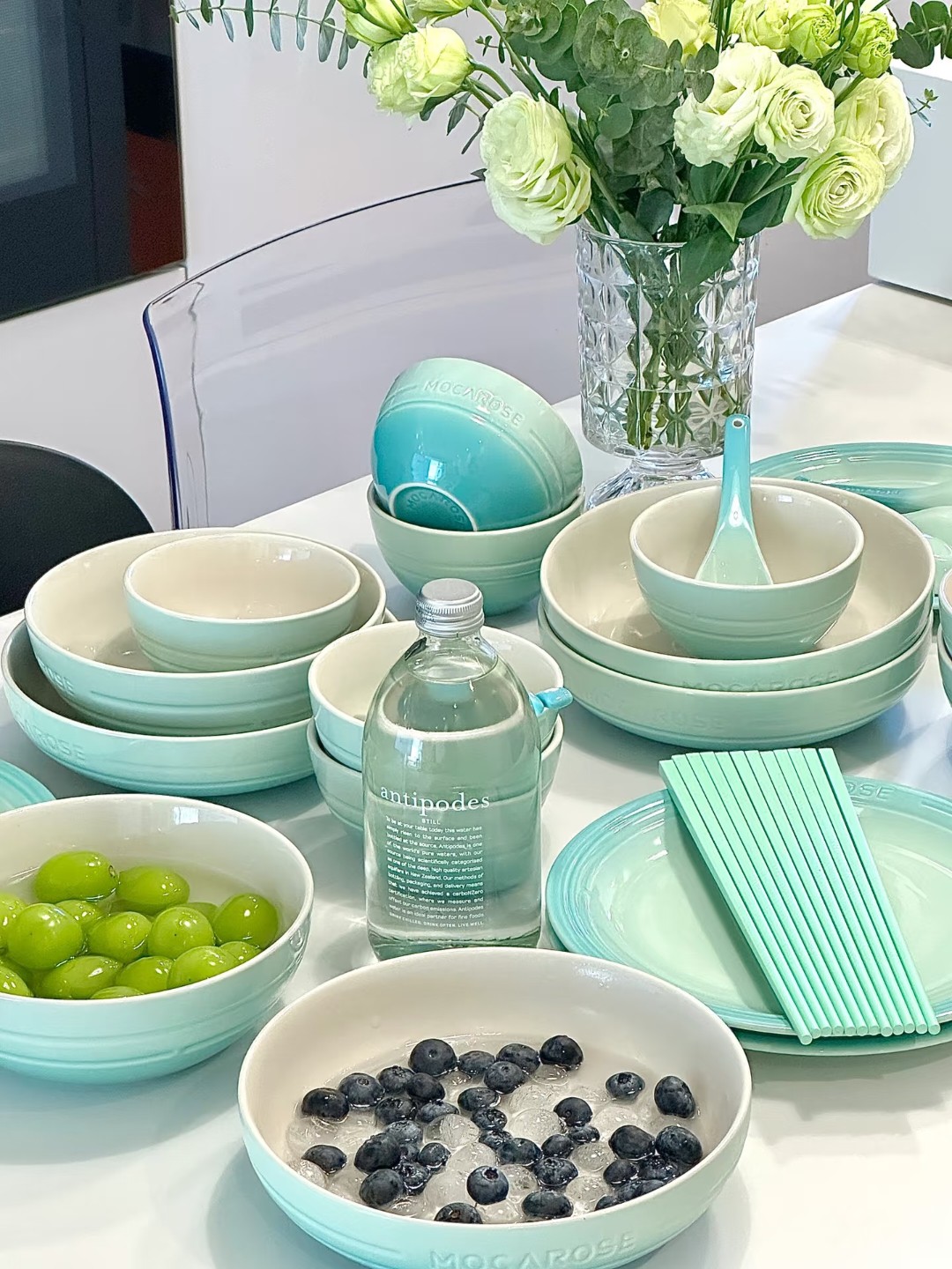 Le Creuset Peacock Green Mocha Dinnerware Set - Complete Table Setting