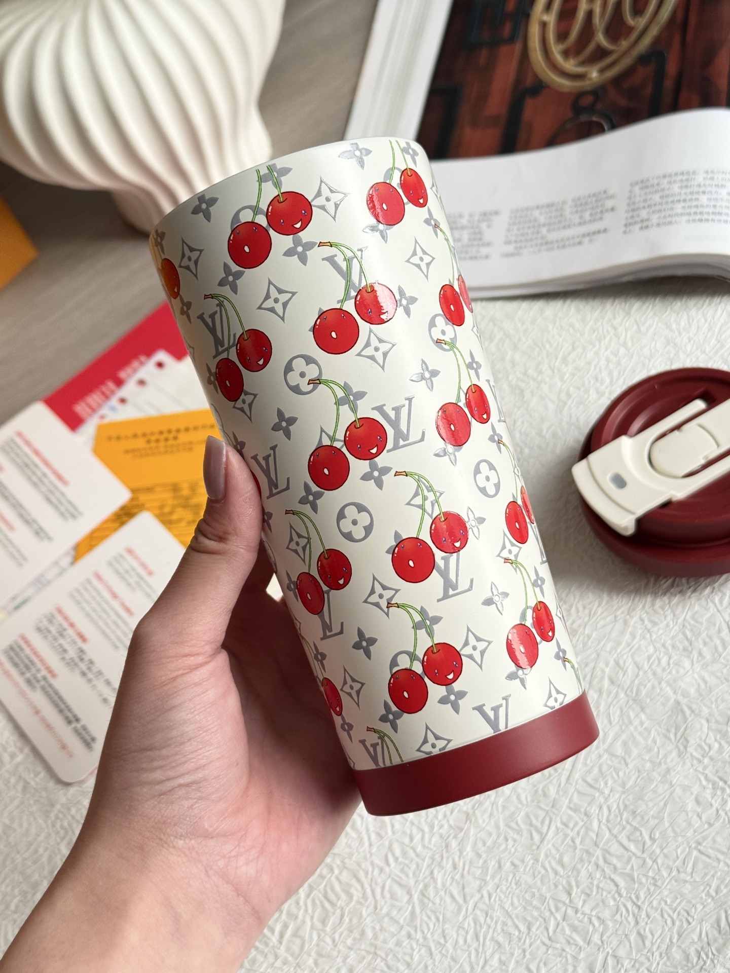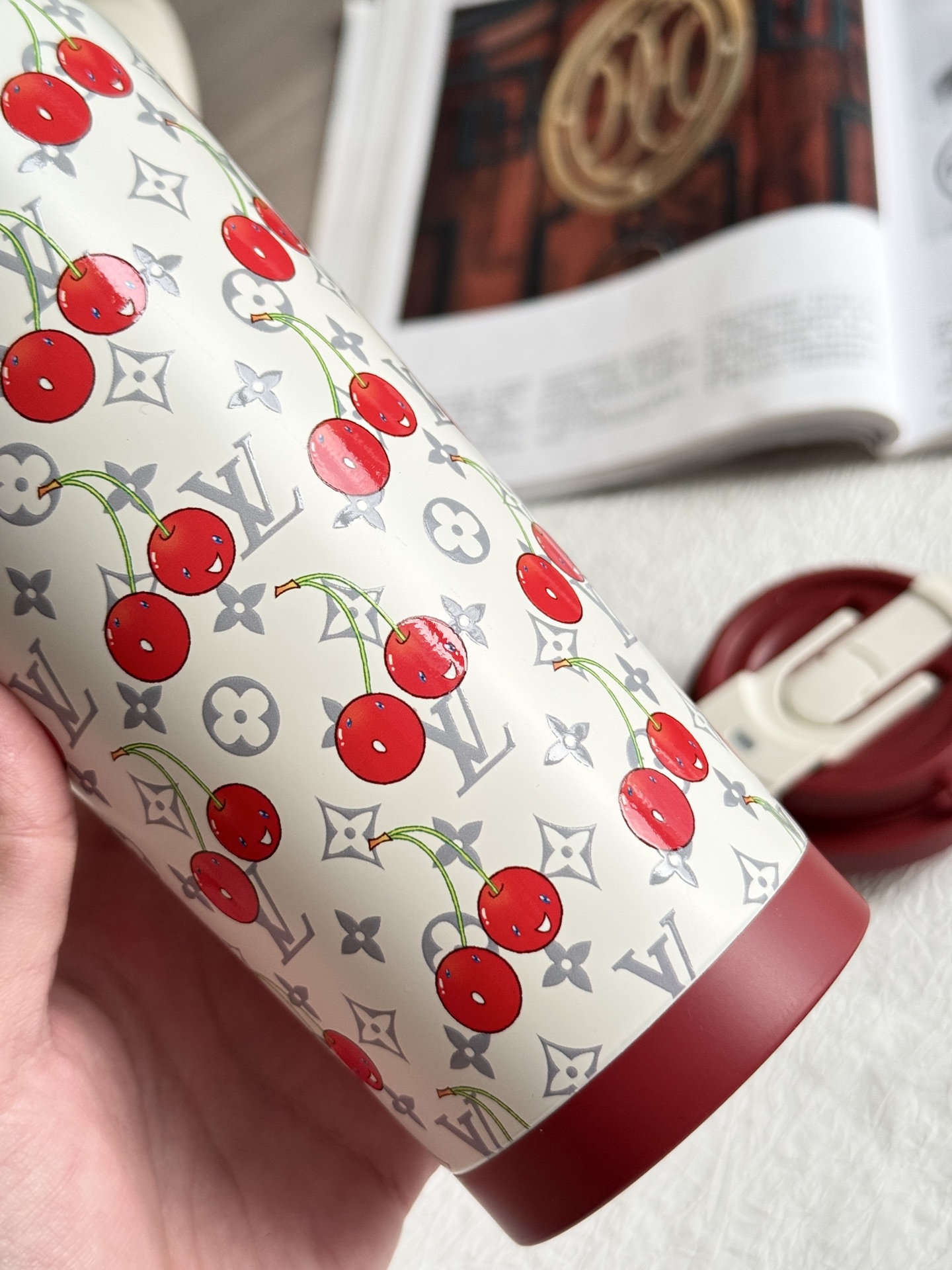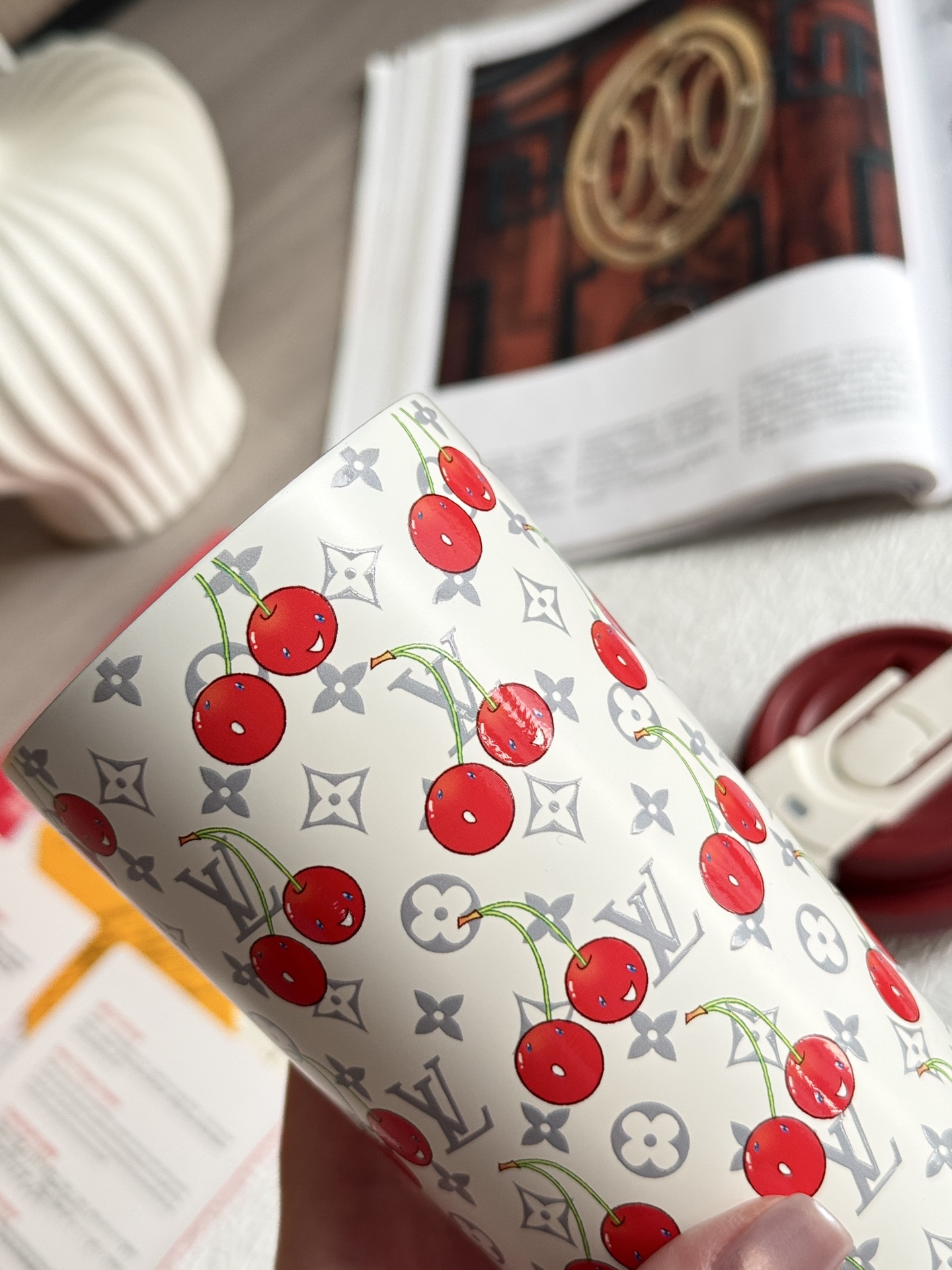 Stay stylishly hydrated with this Louis Vuitton tumbler. Features durable, eco-friendly materials, a unique cherry blossom design, and dishwasher-safe convenience.