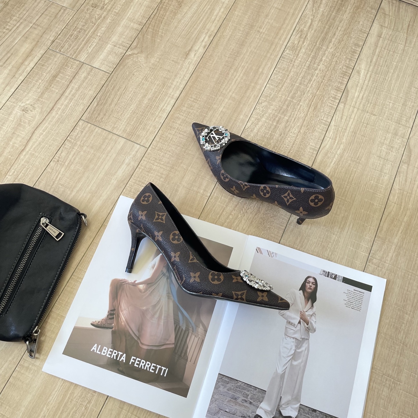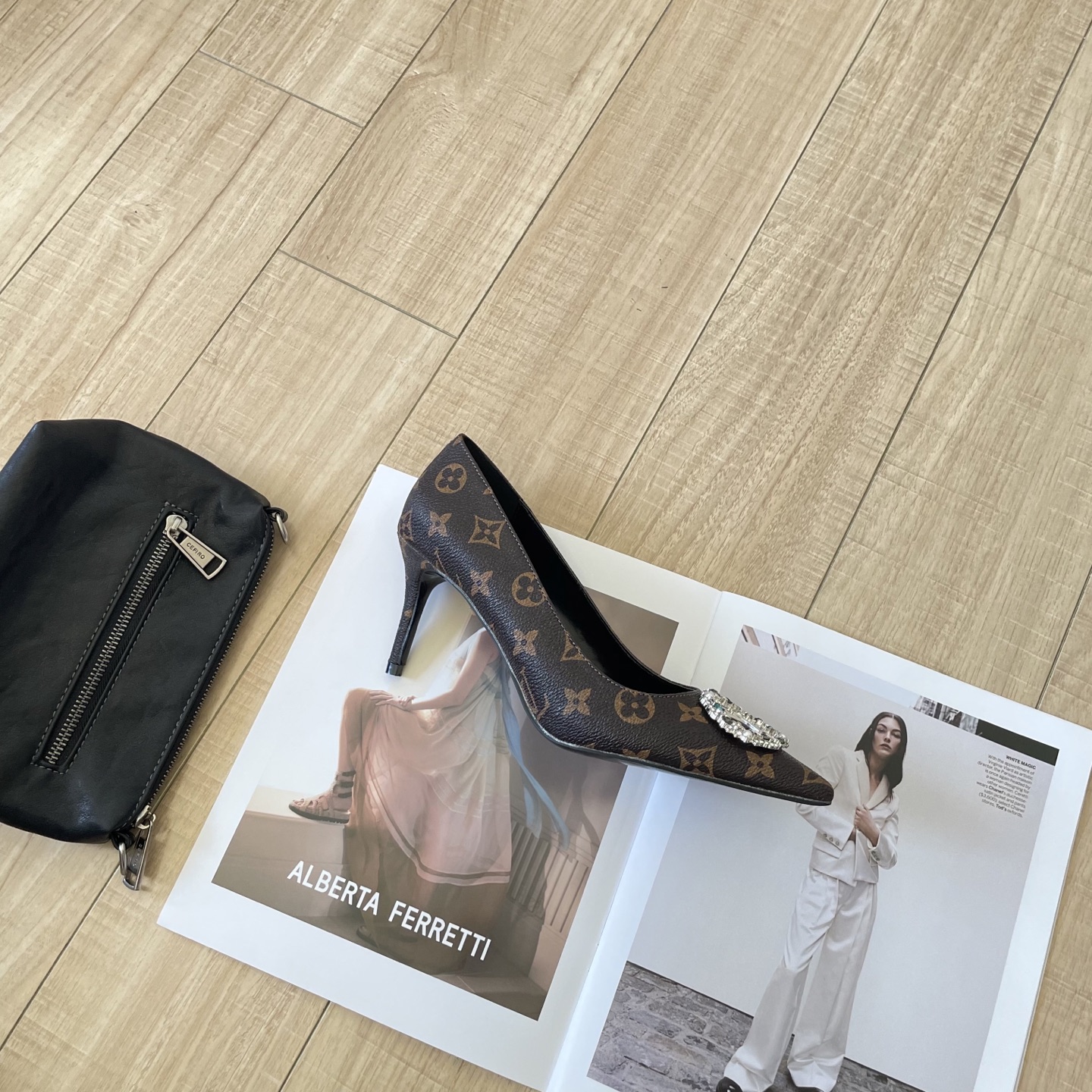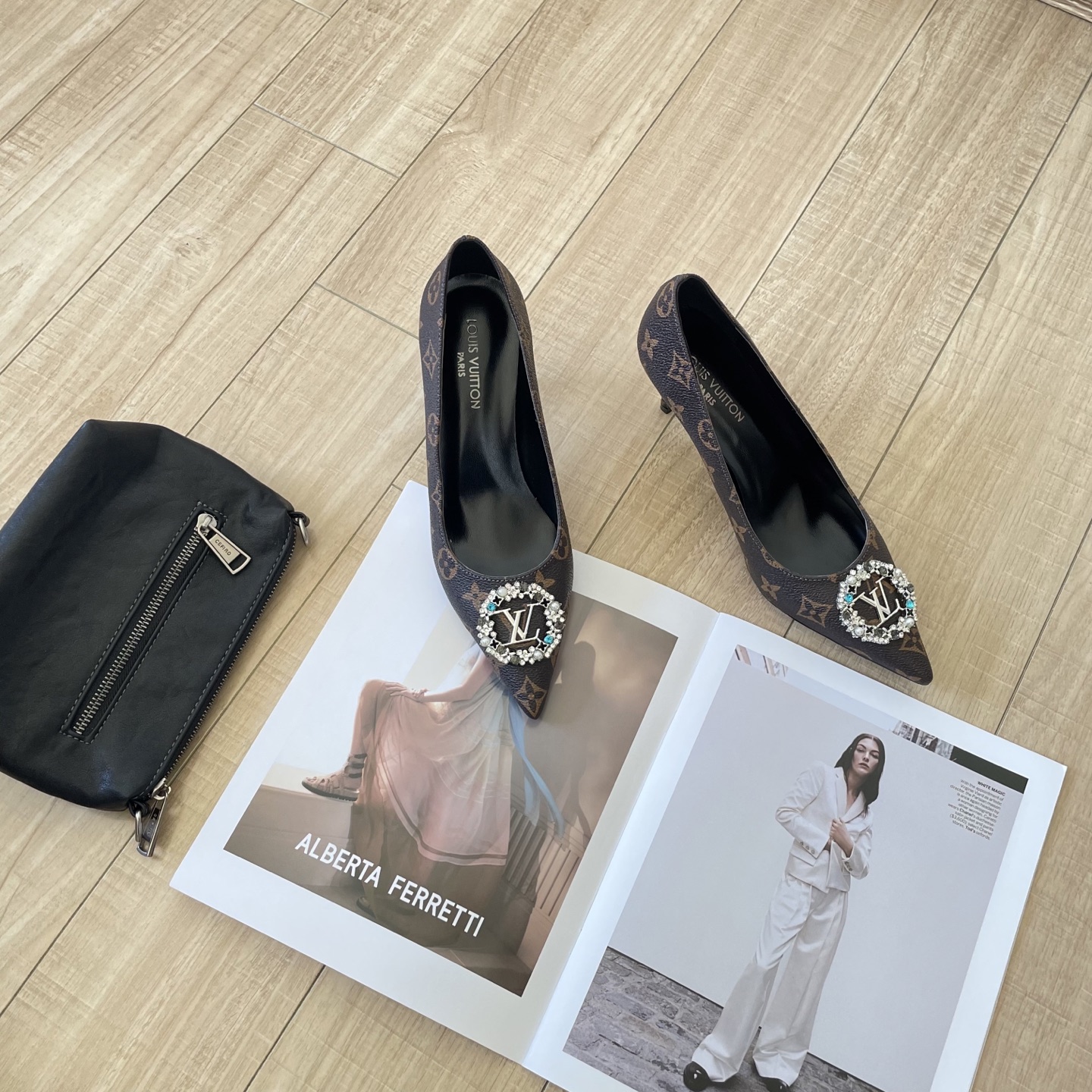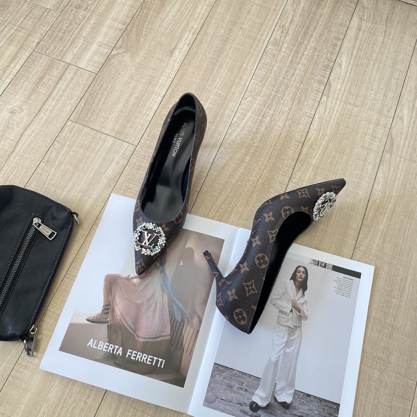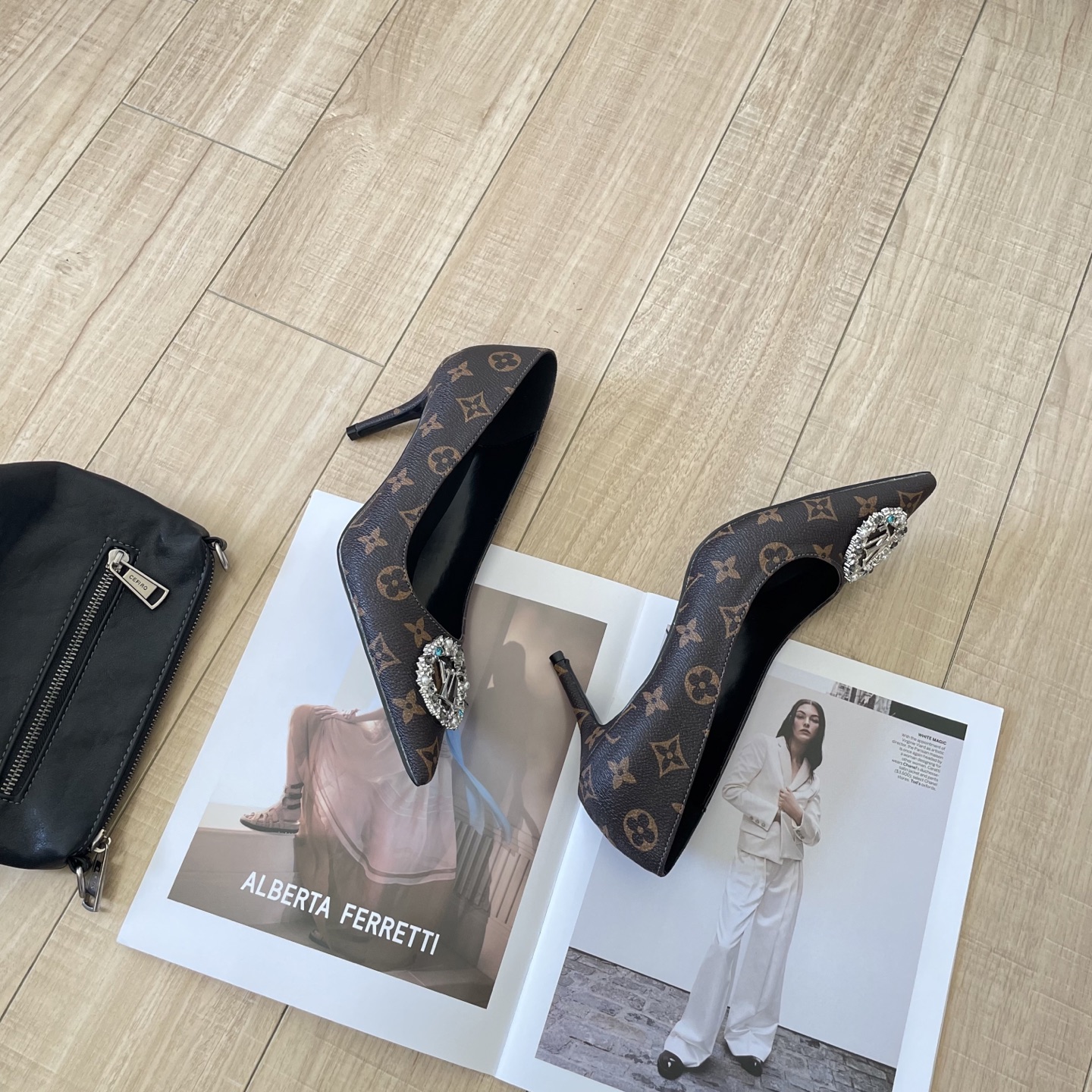 Elevate your style with these luxurious Louis Vuitton high heels. Featuring a flower diamond design and premium materials, offering elegance and sophistication.