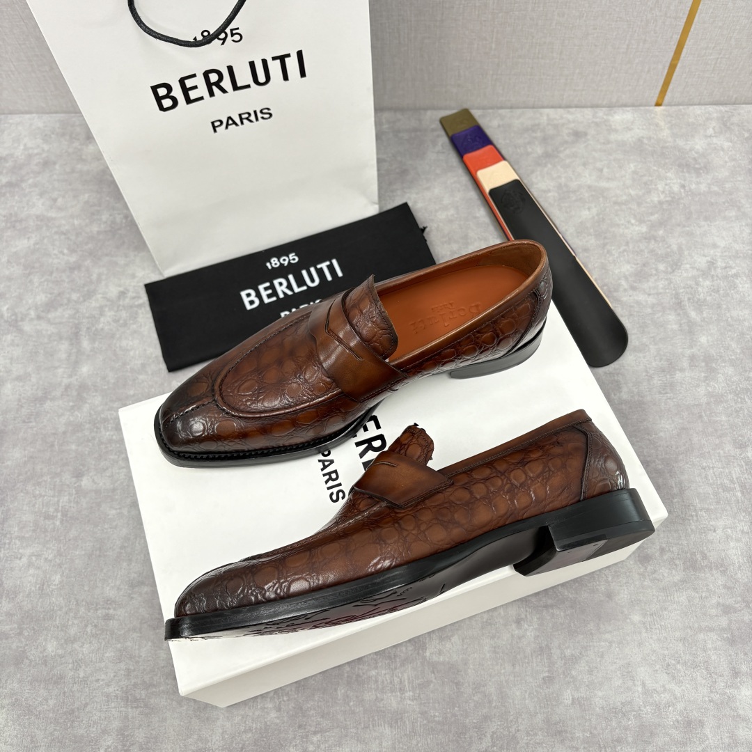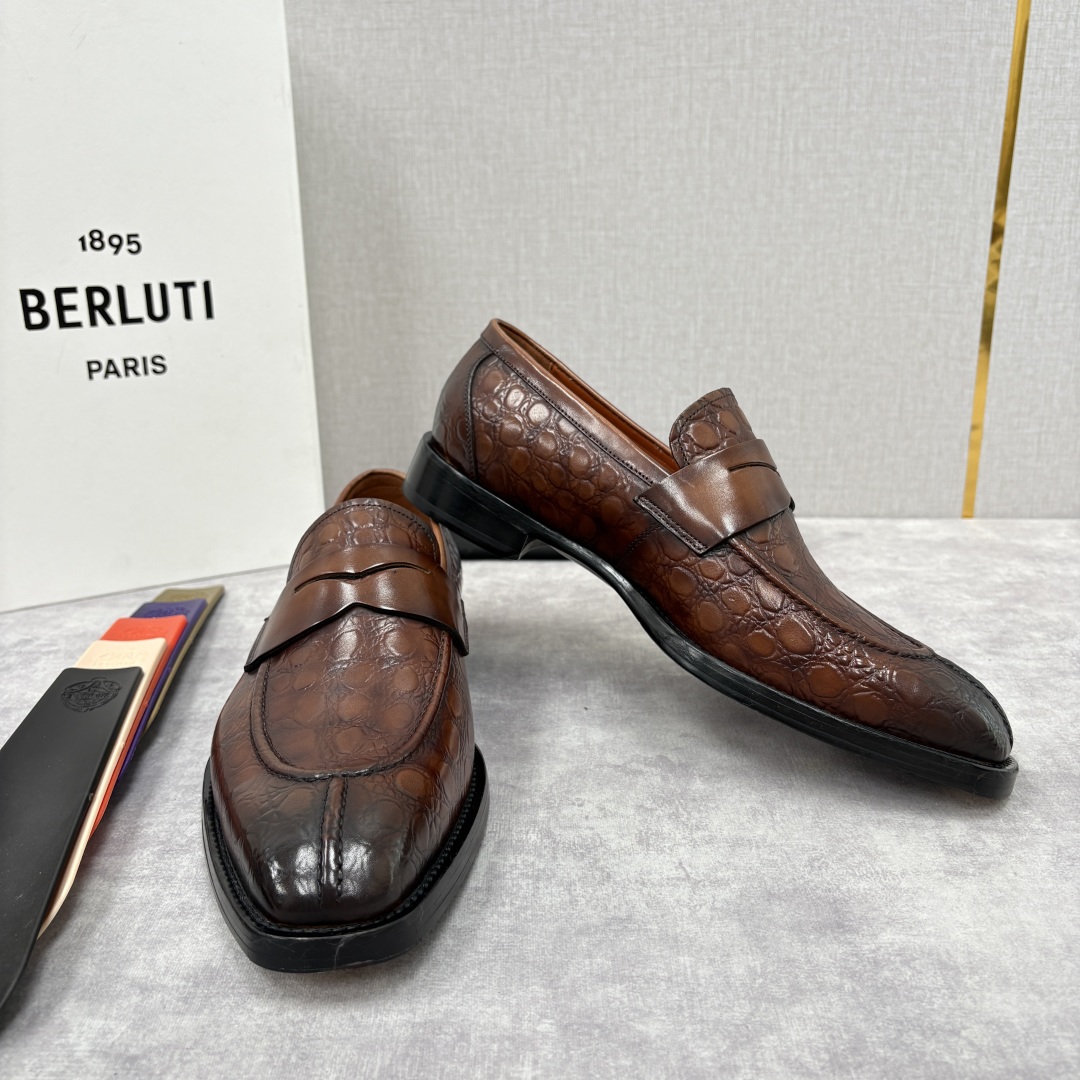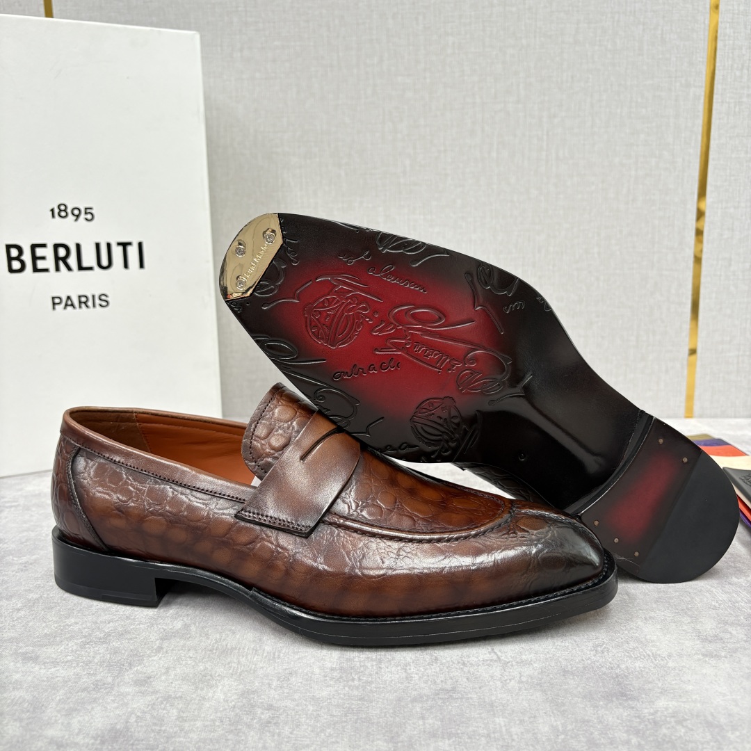 Elevate your style with Berluti loafers. Featuring croc-embossed leather, hand-colored finish, and a comfortable leather sole. Italian craftsmanship.