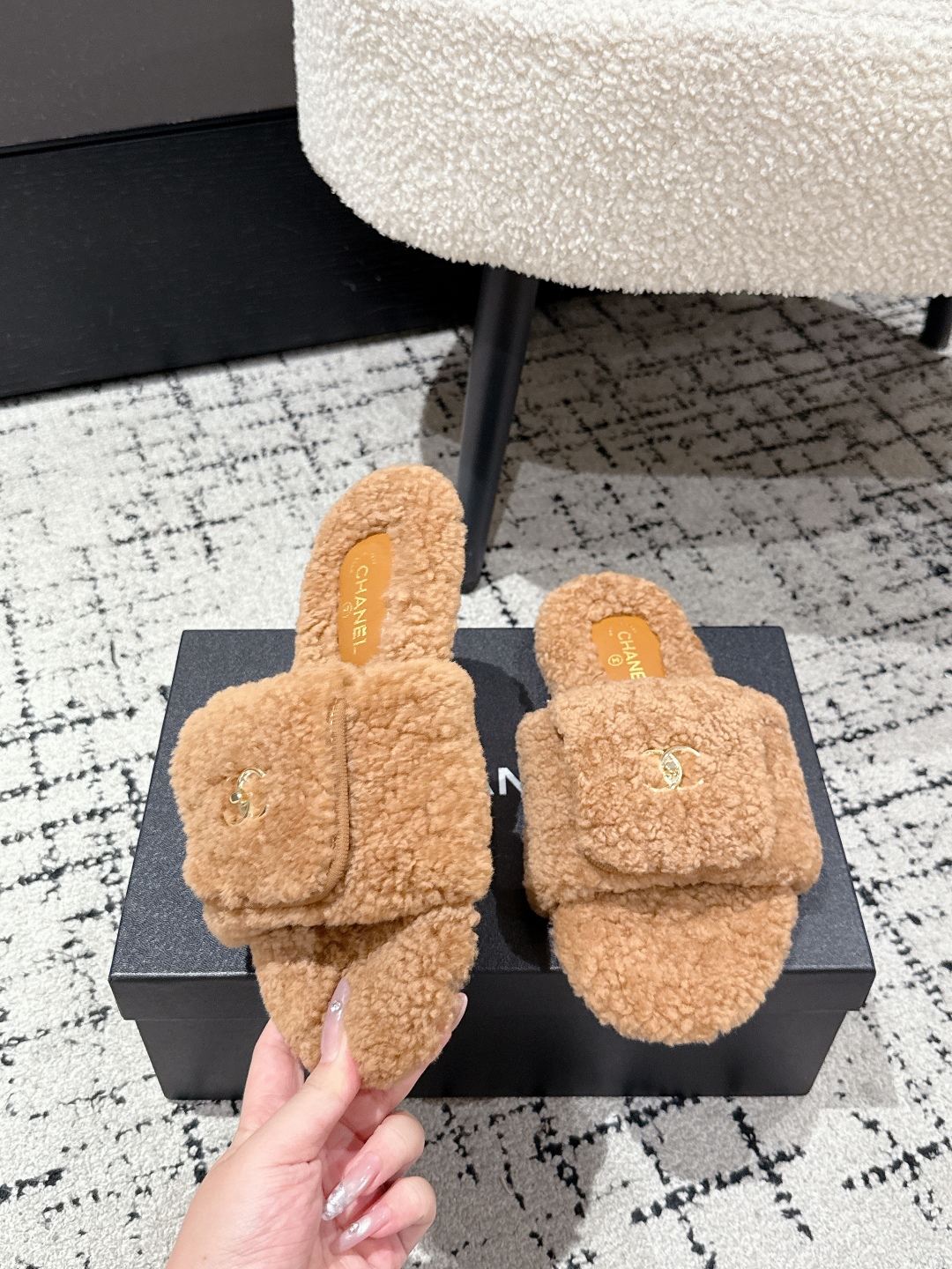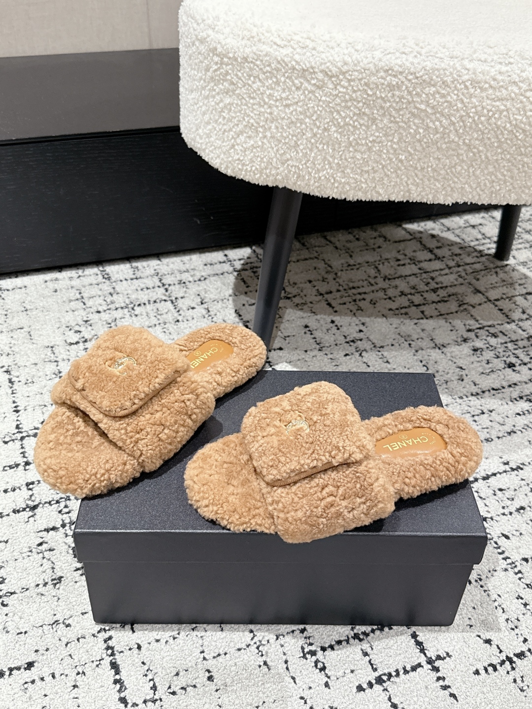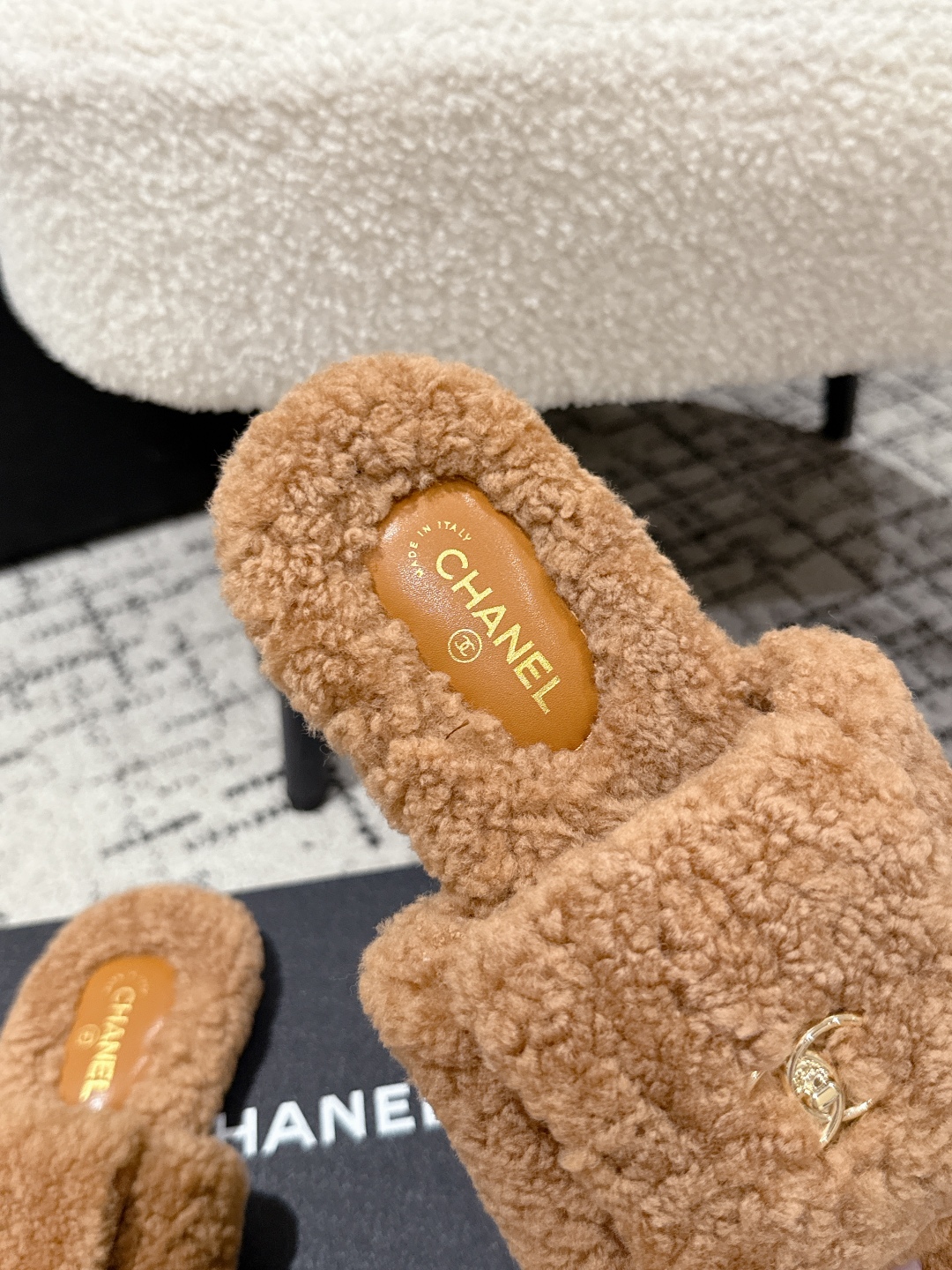 Indulge in the comfort and style of these Chanel shearling slides, a perfect addition to your luxury footwear collection.