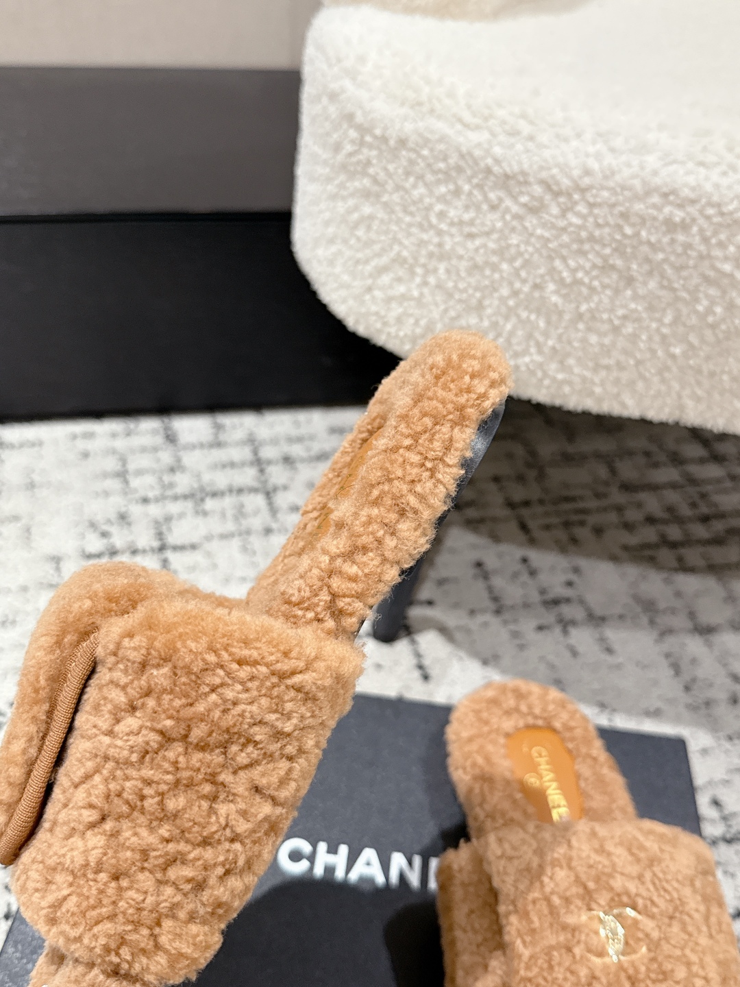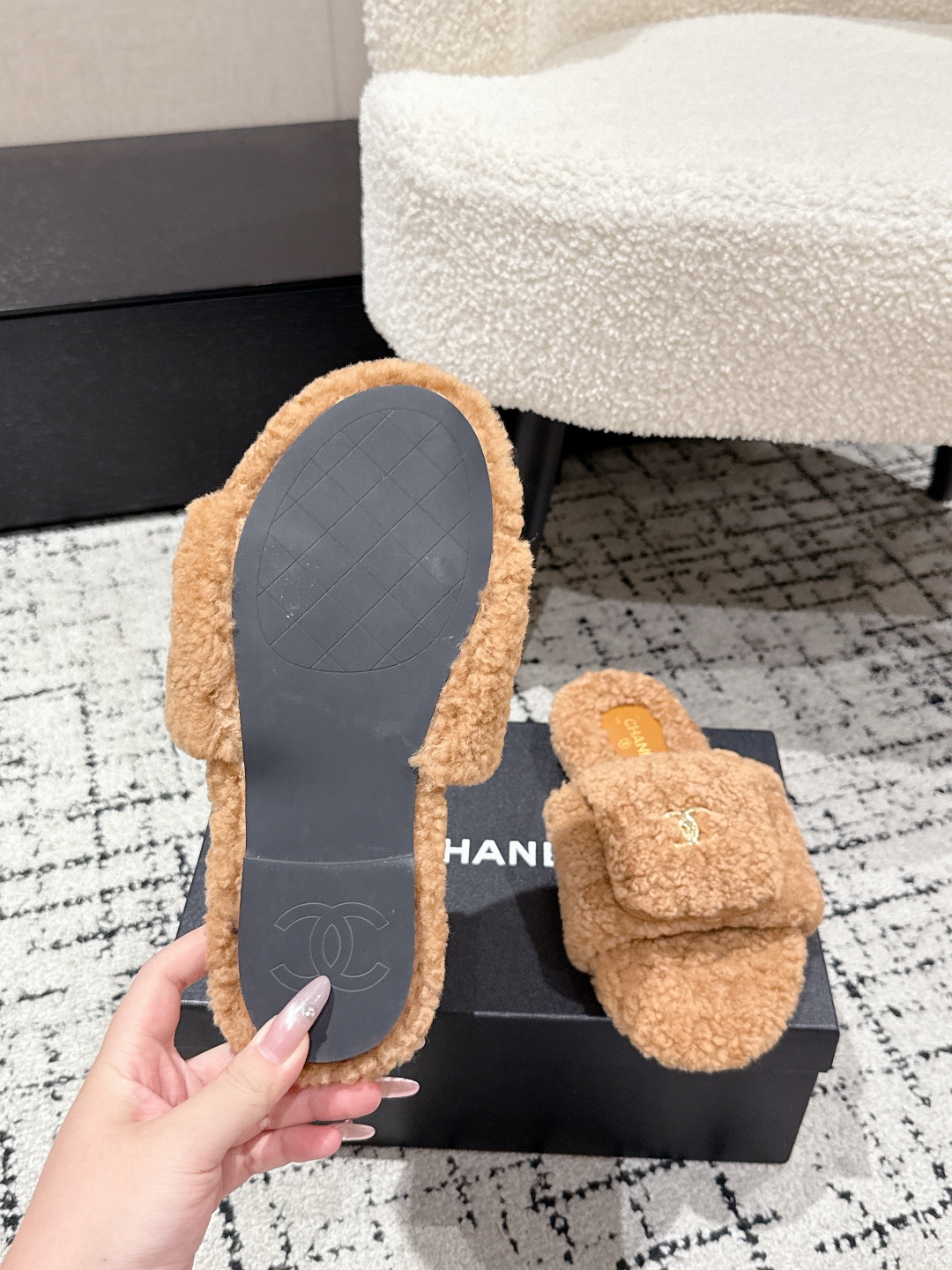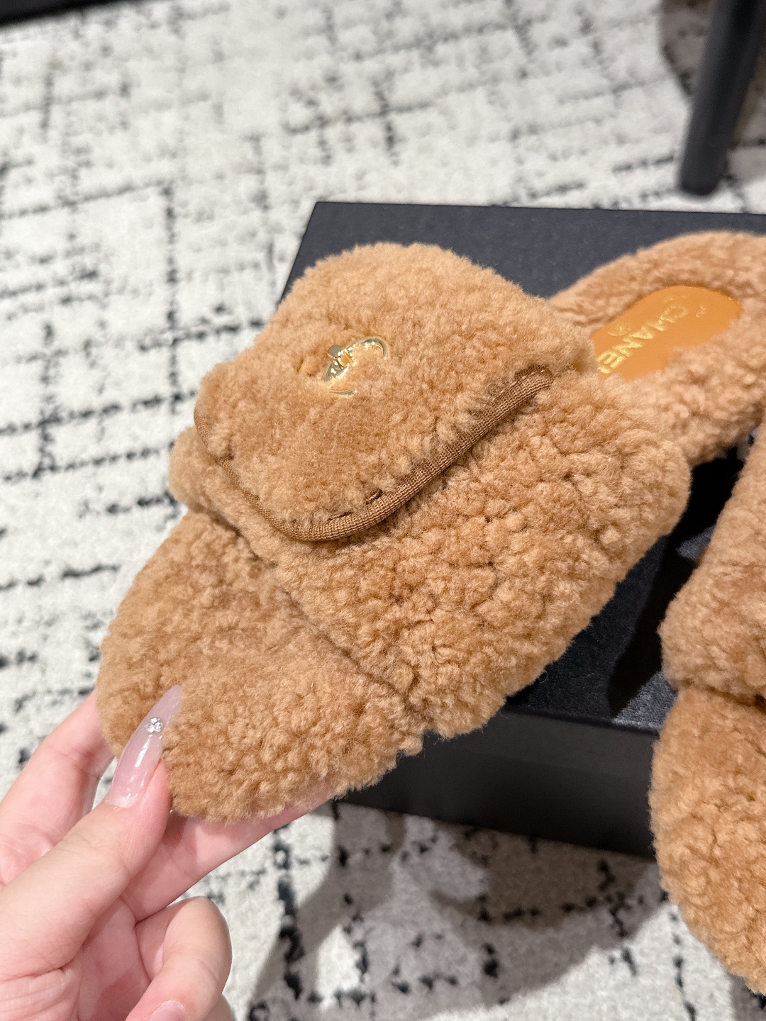 Indulge in the comfort and style of these Chanel shearling slides, a perfect addition to your luxury footwear collection.