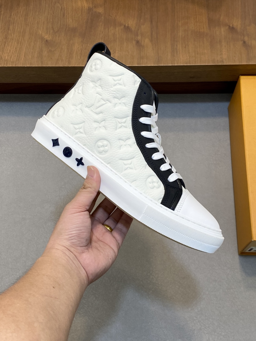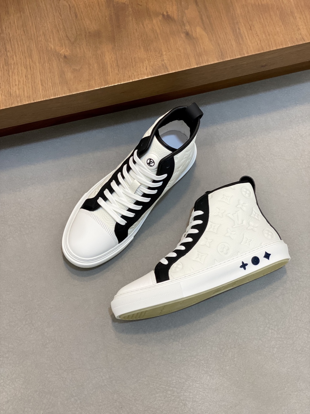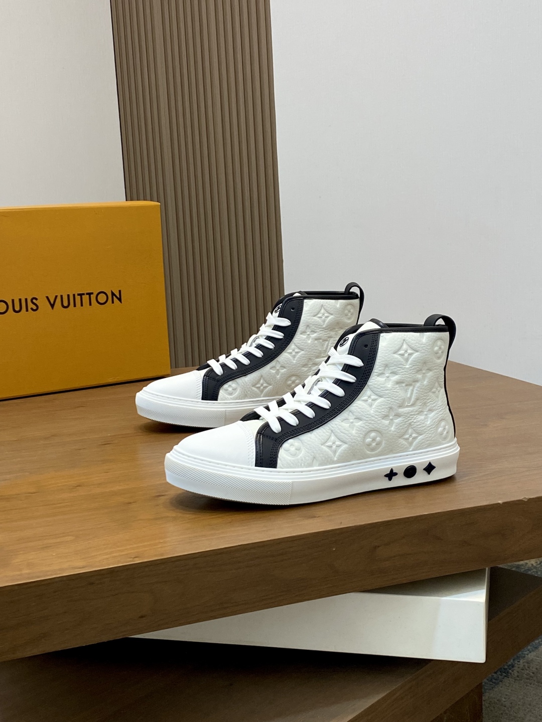 - Stylish high-top design with iconic Louis Vuitton logo.