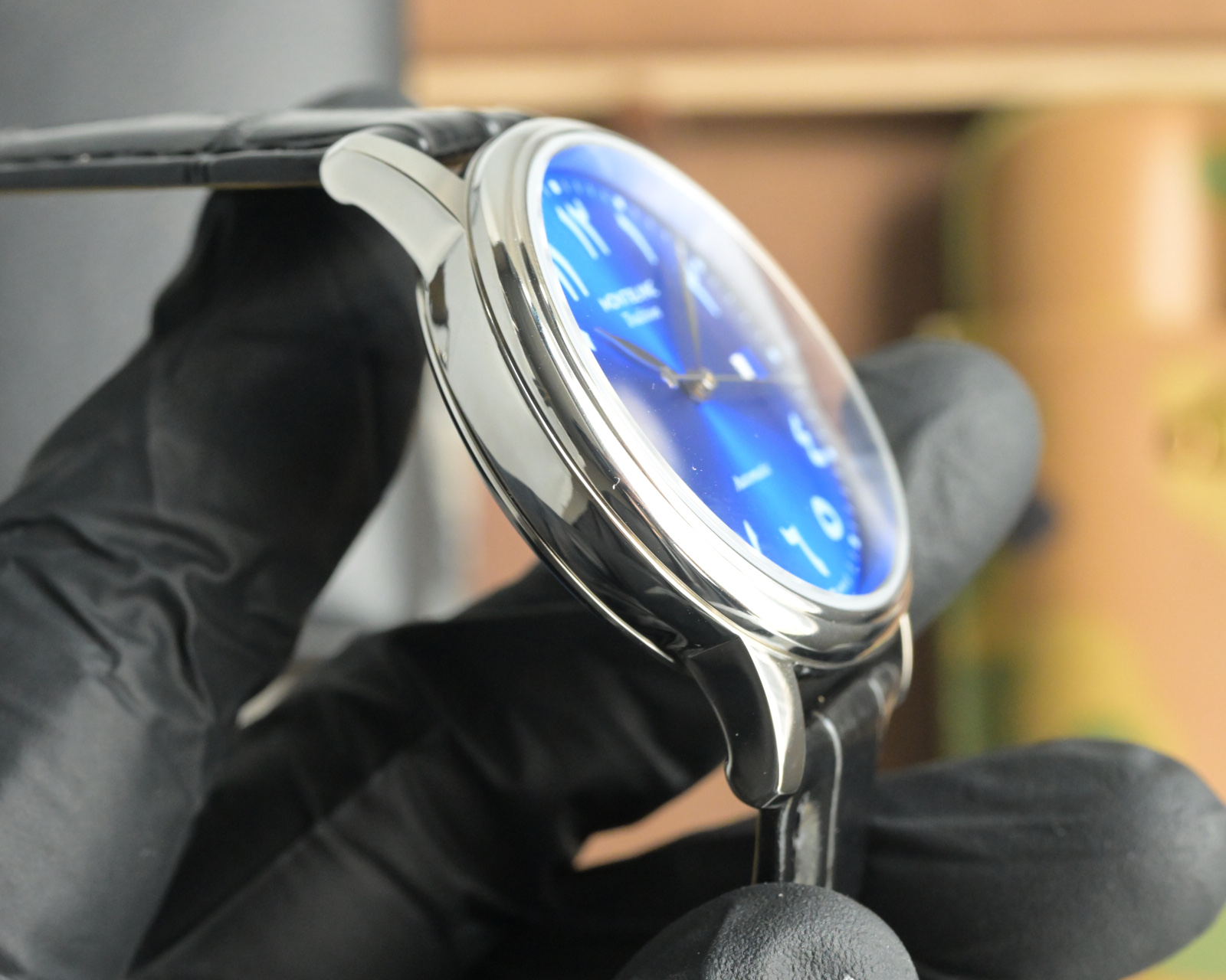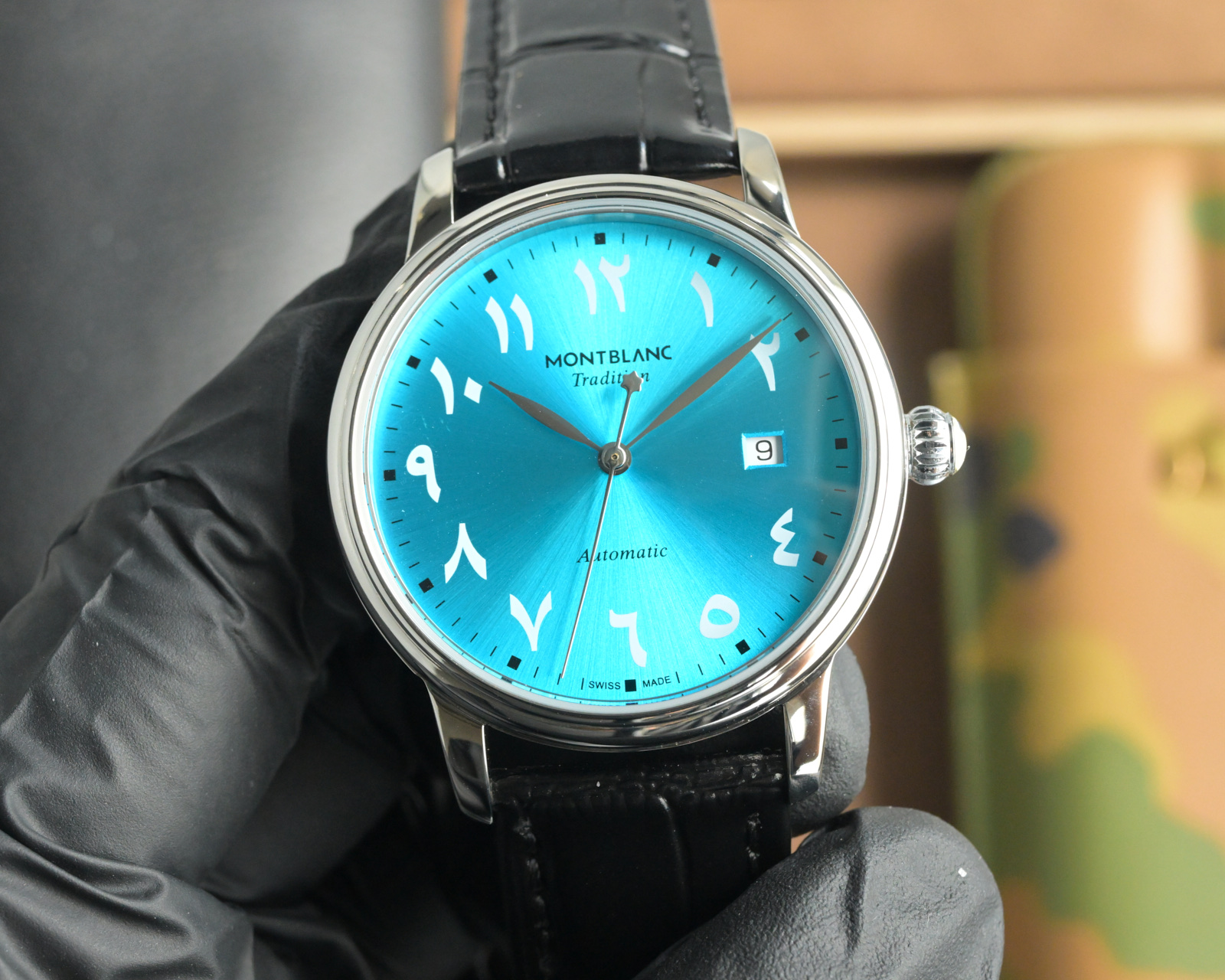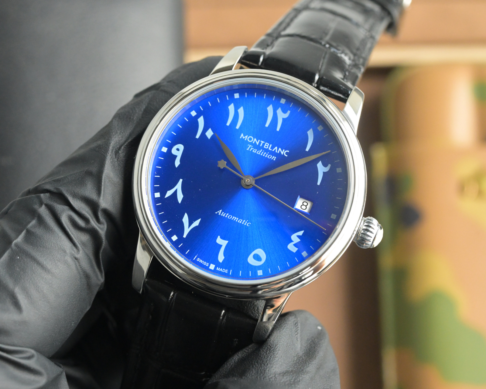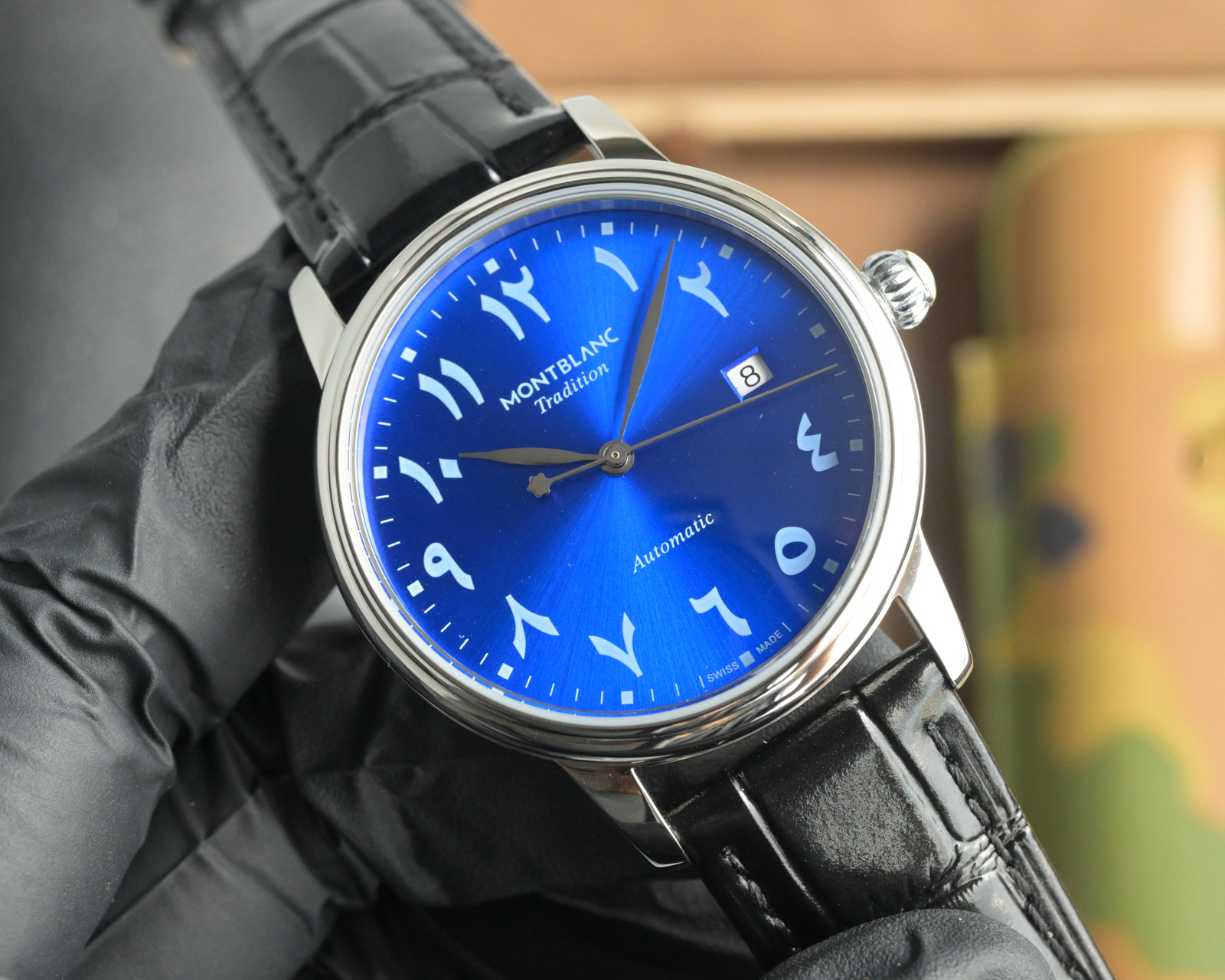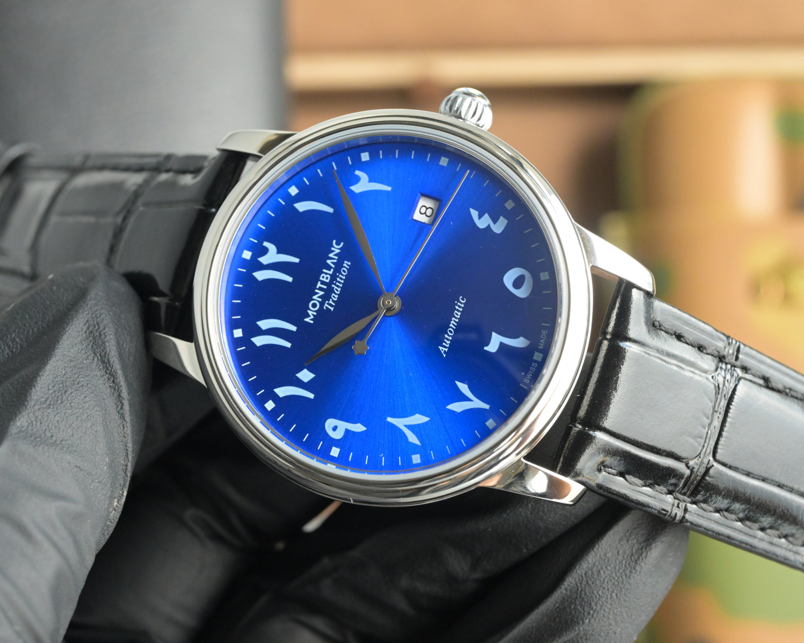 The Montblanc Tradition features Arabic numerals, a silver case, and a blue dial, coupled with a sleek leather strap.